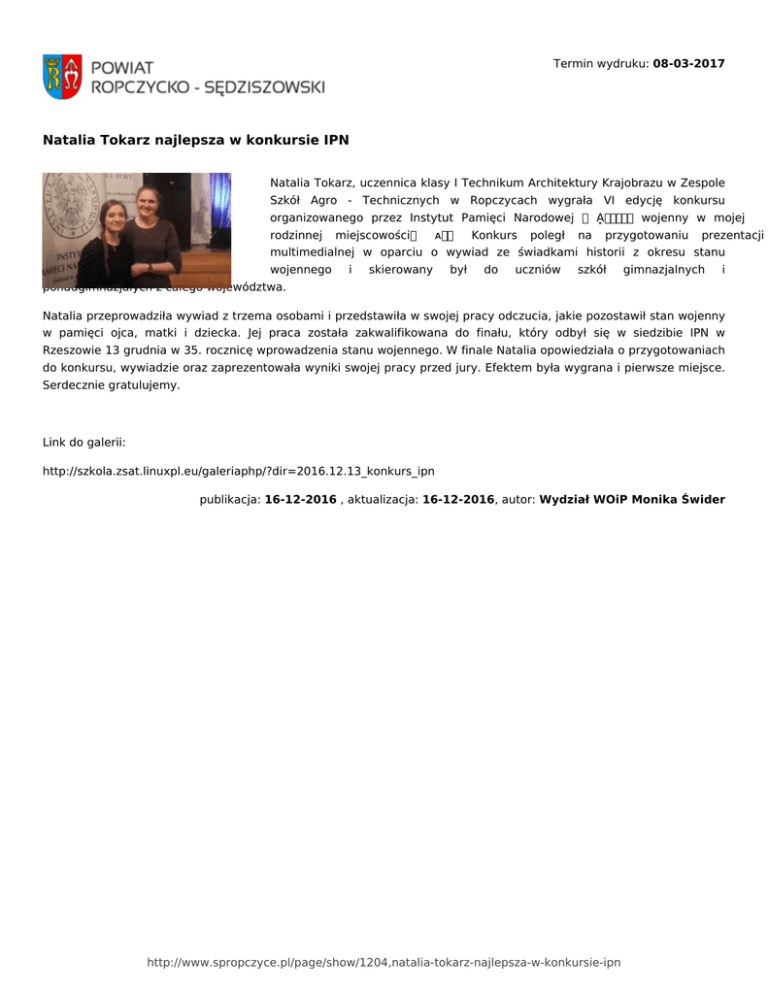 Termin wydruku: 08-03-2017 Natalia Tokarz najlepsza w konkursie IPN Natalia Tokarz, uczennica klasy I Technikum Architektury Krajobrazu w Zespole Szkół Agro - Technicznych w Ropczycach wygrała VI edycję konkursu organizowanego przez Instytut Pamięci Narodowej rodzinnej miejscowości ᴀ⸀ Konkurs poległ Ḁ匀琀愀渀 na wojenny w mojej przygotowaniu prezentacji multimedialnej w oparciu o wywiad ze świadkami historii z okresu stanu wojennego i skierowany był do uczniów szkół gimnazjalnych i ponadgimnazjalych z całego województwa. Natalia przeprowadziła wywiad z trzema osobami i przedstawiła w swojej pracy odczucia, jakie pozostawił stan wojenny w pamięci ojca, matki i dziecka. Jej praca została zakwalifikowana do finału, który odbył się w siedzibie IPN w Rzeszowie 13 grudnia w 35. rocznicę wprowadzenia stanu wojennego. W finale Natalia opowiedziała o przygotowaniach do konkursu, wywiadzie oraz zaprezentowała wyniki swojej pracy przed jury. Efektem była wygrana i pierwsze miejsce. Serdecznie gratulujemy. Link do galerii: http://szkola.zsat.linuxpl.eu/galeriaphp/?dir=2016.12.13_konkurs_ipn publikacja: 16-12-2016 , aktualizacja: 16-12-2016, autor: Wydział WOiP Monika Świder http://www.spropczyce.pl/page/show/1204,natalia-tokarz-najlepsza-w-konkursie-ipn