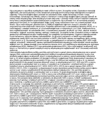 Nr wniosku: 171415, nr raportu: 6445. Kierownik (z rap.): mgr Elżbieta Marta Olewińska Ołów jest jednym z najczęściej występujących metali ciężkich na ziemi. Ze względu na fakt, iż posiada on niezwykłe właściwości, jest wykorzystywany w wielu dziedzinach przemysłu pomimo toksycznego oddziaływania na organizm człowieka. Toksyczne działanie ołowiu prowadzi do uszkodzenia nerek, układu nerwowego, krwiotwórczego, krwionośnego, rozrodczego oraz wątroby. Jednym z mechanizmów toksycznego działania ołowiu jest jego zdolność do indukcji stresu oksydacyjnego. Stres oksydacyjny to stan zakłóconej równowagi między wolnymi rodnikami (reaktywne formy tlenu) a antyoksydantami (przeciwutleniaczami) w organizmie. Ołów prowadzi m.in. do wzmożonej produkcji reaktywnych form tlenu, które mogą uszkadzać białka, lipidy, kwasy nukleinowe w komórce, a nawet prowadzić do jej śmierci. Ołów może indukować utlenianie lipidów, będących składnikami błon komórkowych i prowadzić do jej zniszczenia lub zmian wlaściwości chemicznych. Produktem utleniania lipidów jest dialdehyd malonowy (MDA), który może reagować z zasadami azotowymi, które wchodzą wskład kwasów nukleinowych, m.in. DNA. Reaktywne formy tlenu mogą też prowadzić do uszkodzeń w DNA i w konsekwencji prowadzić do pęknięć nici DNA, zaburzać strukturę chromatyny i wpływać na procesy naprawy, replikacji i transkrypcji. Ze względu na fakt, iż wszelkie zmiany w materiale genetycznym są niebezpieczne gdyz mogą prowadzić do mutagenezy lub kancerogenezy. Organizm człowieka posiada liczne mechanizmy, zdolne do naprawy uszkodzeń DNA. Do głównych mechanizmów należą: wycinanie błędnie podstawionej zasady (BER) oraz wycinanie nukleotydów (NER). Obie ścieżki naprawy wymagają współpracy szeregu różnych enzymów. Różne warianty polimorficzne genów zaangażowanych w mechanizmy naprawy BER i NER mogą wpływać na szybkość i efektywność naprawy uszkodzeń. Ponieważ stres oksydacyjny może uszkadzać niemal wszystkie składniki komórki, dlatego powstały liczne mechanizmy obronne, do których należą enzymy antyoksydacyjne: dysmutaza ponadtlenkowa (SOD), katalaza (CAT) oraz peroksydaza glutationowa (GPX). Ołów może wpływać na aktywność tych enzymów. Polimorfizmy w genach kodujących enzymy antyoksydacyjne mogą prowadzić do zróżnicowanej wrażliwości osobniczej. Celem projektu było określenie związku pomiędzy polimorfizmami w genach obrony antyoksydacyjnej oraz w genach naprawy DNA a poziomem uszkodzeń oksydacyjnych będących konsekwencją zawodowej ekspozycji na ołów oraz określenie wpływu ołowiu na aktywność enzymów antyoksydacyjnych w sosoczu i poziom peroksydacji (utlenienia) lipidów. W ramach projektu przebadano 115 dorosłych mężczyzn z południowej Polski eksponowanych zawodowo na ołów (średni czas narażenia na ołów wynosił 12,75 roku ) oraz 58 mężczyzn bez narażenia na ołów, którzy stanowili grupę kontrolną. W obu grupach oznaczano aktywność enzymów antyoksydacyjnych CAT, SOD oraz GPX w osoczu, poziom produktów peroksydacji lipidów w osoczu. U wszystkich osób oznaczono również polimorfizmy w genach kodujących enzymy antyoksydacyjne (CAT, SOD2, SOD3, GPX1, GPX3) oraz w genach naprawy DNA (APEX1, hOGG1, XRCC1, XPA). U pracowników eksponowanych na ołów stwierdzono ponad 6-krotnie wyższy poziom ołowiu we krwi w porównaniu z grupą kontrolną. Nie stwierdzono istotnych statystycznie różnic pomiędzy grupami w odniesieniu do poziomu produktów peroksydacji lipidów w osoczu. W grupie eksponowanej na działanie ołowiu obserwowano niższą aktywność enzymów i SOD w osoczu oraz większą aktywność CAT w porównaniu z grupą kontrolną. Wykazano istotną statystycznie korelację pomiędzy poziomem ołowi we krwi a aktywnością CAT w oraz GPX w osoczu. Nie wykazano takiej zależności w odniesieniu do aktywności SOD w osoczu. Częstość występowania poszczególnych genotypów badanych polimorfizmów była porównywalna w grupie osób kesponowanych zawodowo na ołów i kontrolnej, z wyjątkiem polimorfizmu rs4880 w genie SOD2 oraz rs1800975 w genie XPA. Analiza wyników wykazała, iż w zależności od genotypu w polimorfizmie rs1800975 w genie XPA poziom ołowiu we krwi jest inny – najwyższe stężenie tego biomarkera obserwowano u heterozygot. Wykazano również zróżnicowanie aktywności SOD w osoczu w zależności od polimorfizmu rs4880 w genie SOD2. U osób z genotypem TT aktywność SOD była niższa niż u nosicieli allelu C (genotyp CC lub CT). Dla pozostałych polimorfizmów nie stwierdzono istotnych statystycznie różnic pomiędzy poszczególnymi genotypami w odniesieniu do poziomu ołowiu we krwi, aktywności GPX, CAT, SOD w osoczu, jak również poziomu TBARS. Spośród wszystkich przebadanych polimorfizmów jedynie dla polimorfizmu rs4880 w genie SOD2 wykazano znamienne zróżnicowanie aktywności dysmutazy ponadtlenkowej w osoczu u osób z poszczególnymi genotypami. Częstość występowania poszczególnych genotypów badanych polimorfizmów różniła się znamiennie statystycznie pomiędzy grupą narażoną zawodowo na ołów, a kontrolną w przypadku polimorfizmu rs1800975 w genie XPA oraz rs4880 w genie SOD2, co sugeruje, że potencjalnie mogą mieć wpływ na zróżnicowanie wrażliwości na ołów. Zagadnienie to wymaga jednak dalszych badań, przede wszystkim podjęcia próby przebadania większej populacji.
