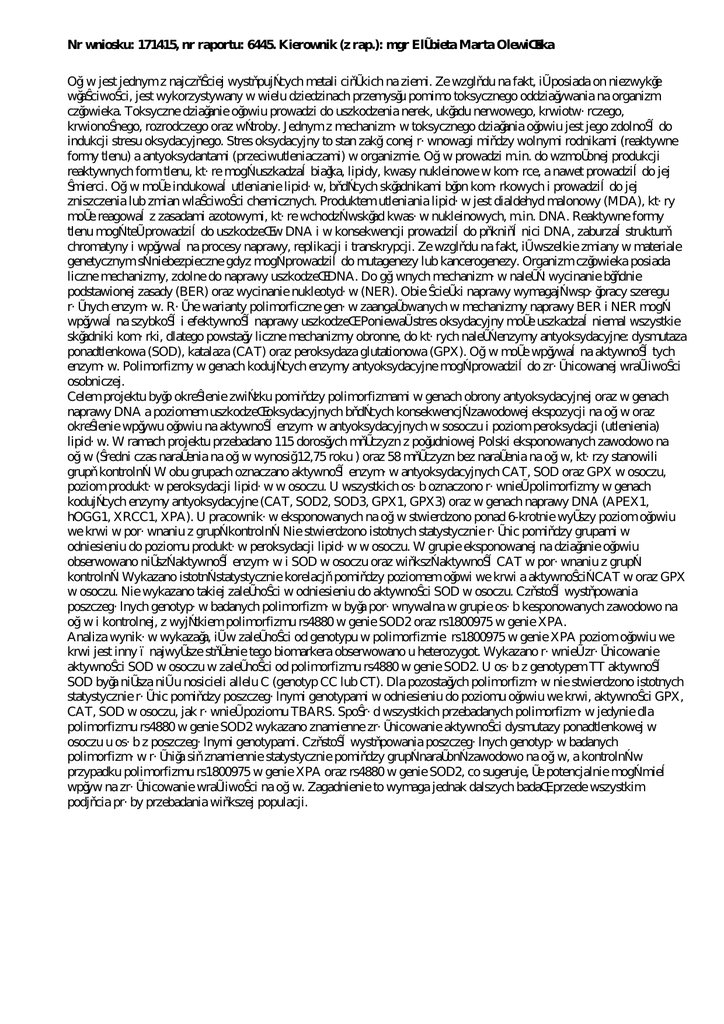 Nr wniosku: 171415, nr raportu: 6445. Kierownik (z rap.): mgr