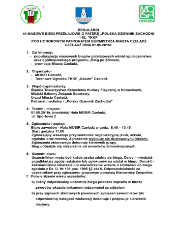 REGULAMIN 44 MASOWE BIEGI PRZEŁAJOWE O PATERĘ „POLSKA DZIENNIK ZACHODNI I ŚL. TKKF POD HONOROWYM PATRONATEM BURMISTRZA MIASTA CZELADŹ CZELADŹ DNIA 01.05.2016r. 1. Cel imprezy: - popularyzacja masowych biegów przełajowych wśród społeczeństwa oraz ogólnopolskiego programu „Bieg po Zdrowie, - promocja Miasta Czeladź, 2. Organizator - MOSiR Czeladź, - Terenowe Ognisko TKKF „Saturn” Czeladź. 3. Współorganizatorzy Śląskie Towarzystwo Krzewienia Kultury Fizycznej w Katowicach, Miejski Szkolny Związek Sportowy, Urząd Miasta Czeladź. Patronat medialny - „Polska Dziennik Zachodni” 4. Termin i miejsce: 01.05.2016r. (niedziela) Hala MOSiR Czeladź, ul. Sportowa 2 5. Zgłoszenia i zapisy: Biuro zawodów - Hala MOSiR Czeladź w godz. 8.45 – 10.45. Start godzina 11.00 Zgłaszający wskazuje przynależność organizacyjną (klub, szkoła, ognisko oraz miasto). Zgłoszenia wypisuje się drukowanymi literami. Zgłoszenia zbiorowego dokonuje kierownik grupy. Bieg odbędzie się niezależnie od warunków atmosferycznych. 6. Uczestnictwo: Uczestnikiem może być każda osoba zdolna do biegu. Dzieci i młodzież przedkładają zgodę rodziców lub opiekunów na udział w biegu. Dorośli zaświadczenie lekarskie lub oświadczenie własne o zdolności do biegu zgodnie z Dz. U. Nr 101 poz. 1095 §2 pkt 6. Odpowiedzialność za uczestników przy zgłoszeniu grupowym ponoszą Kierownicy Zespołów. 7. Potwierdzenie wieku uczestnika: a) każdy indywidualny uczestnik biegu podczas zapisów w biurze zawodów okazuje dokument tożsamości ze zdjęciem b) przy zapisach zbiorowych pisemnych zgłoszeń zawodników (do odpowiedniej kategorii wiekowej) dokonuje i podpisuje kierownik drużyny. Zgłoszenia winny zawierać następujące dane: Imię i nazwisko, data urodzenia, nazwa drużyny, miejscowość, pieczęć i podpis kierownika drużyny c) każdy startujący ma prawo weryfikacji wieku osób z nim biegających do 10 minut po zakończeniu biegu 8. Kategorie wiekowe i dystanse: Kategoria I dziewczęta 2003 i młodsze - ( 13 lat i młodsze) Kategoria II chłopcy 2003 i młodsi - ( 13 lat i młodsi ) - 600 m 600 m Kategoria III dziewczęta 2000 - 2002 - ( 14 - 16 lat ) - 1.000m Kategoria IV chłopcy 2000 - 2002 - ( 14 - 16 lat ) - 1.000m - 3.000 m Kategoria V kobiety 1999- 1977 Kategoria VI kobiety 1976 i starsze - ( 17 - 39 lat ) - ( 40 lat i starsze )- 3.000 m Kategoria VII mężczyźni 1999 - 1981 - (17 - 35 lat ) - 5.000 m Kategoria VIII mężczyźni 1980 - 1967 - ( 36 - 49 lat ) - 5.000 m Kategoria IX mężczyźni 1966 - 1957 - ( 50 - 59 lat ) - 5.000 m Kategoria X mężczyźni 1956 i starsi - ( 60 lat i starsi ) - 3.000 m DODATKOWO! Konkurencja Nordic – Walking (nie wchodząca do współzawodnictwa) kobiet i mężczyzn na dystansie 3.000 m. (kat. wiek.) Dla najmłodszych uczestników (przedszkolaki) rozegrany zostanie bieg na dystansie 60 m. (poza klasyfikacją) 9. Opłata startowa: młodzież szkolna - 1,00 zł., dorośli zrzeszeni w TKKF – 3,00 zł., pozostali 5,00 zł. 10. Zawodnik: zawodnikiem jest ta osoba, która uzyskała wpis na listę startową zgodnie z kategorią wiekową, - może uczestniczyć w biegu tylko w tej kategorii wiekowej do której został wpisany - ma zapewnioną przez organizatora opiekę medyczną - ubezpieczony jest przez organizatora - otrzymuje na mecie gorącą herbatę lub napoje - zapoznaje się z regulaminem. Start pierwszego biegu o godz. 11.00, następne biegi według programu ustalonego przez organizatora. 11. Klasyfikacja indywidualna : I m. – 50 pkt, II m. 43 pkt, III m. – 37 pkt, IV m. – 32 pkt, V m. – 29 pkt, VI m. – 26 pkt, VII m. - 24 pkt, VIII m. – 23 pkt, IX m. – 22 pkt, itd. malejąco o 1 pkt aż do miejsca XXX – 1 pkt. Każdy zawodnik zbiera punkty dla drużyny, którą reprezentuje w dniu biegu. Klasyfikacja drużynowa: Sumuje się punkty indywidualne zawodników i zawodniczek z danej ekipy zajmujących punktowane miejsca w każdej kat. wiekowej. 12. Nagrody i wyróżnienia: indywidualnie w każdej kategorii wiekowej: za zajęcie I miejsca – statuetka, dyplom, upominek za zajęcie II i III miejsca – dyplom, medal i upominek drużynowo: za zajęcie miejsca od I -III – puchary i dyplomy za zajęcie miejsca od IV -VI – dyplomy Dla najstarszej zawodniczki i najstarszego zawodnika – dyplom i upominek Wśród uczestników rozlosowane zostaną upominki. 13. Protesty: protesty można składać do Zarządu Śl. TKKF, Katowice Aleja Wojciecha Korfantego 8 lub na adres mailowy [email protected] w nieprzekraczalnym terminie do 3 dni po umieszczeniu na stronie internetowej Śl. TKKF ( slaskietkkf.tnb.pl), komunikatu z wynikami biegów . 14. Postanowienia końcowe: W sprawach spornych lub nie uregulowanych w regulaminie decyzje wydaje organizator – kierownik zawodów. Terminarz pozostałych biegów: 15.05.2016 – Będzin, 12.06.2016 – Piekary Śląskie, 18.09.2016 – Katowice, 09.10.2016 – Chorzów Do klasyfikacji końcowej indywidualnej i drużynowej zalicza się 6 najlepszych wyników spośród 7 przeprowadzonych biegów. ZAPRASZAMY ORGANIZATOR