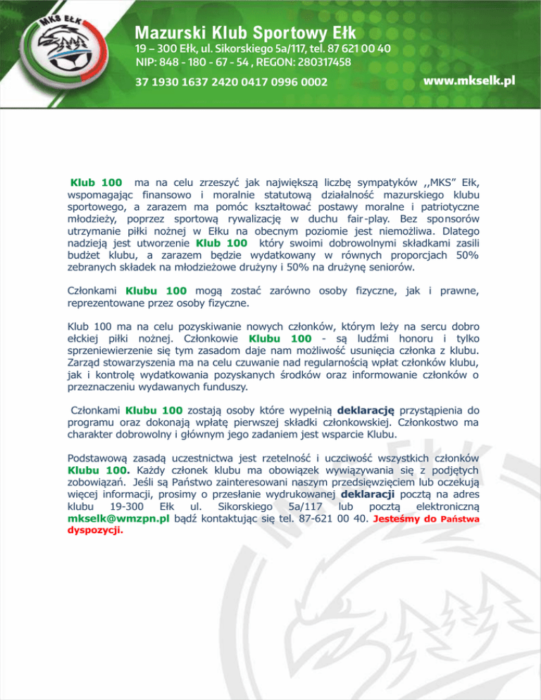 Mazurski Klub Sportowy Ełk 19 – 300 Ełk, ul. Sikorskiego 5a/117, tel. 87 621 00 40 NIP: 848 - 180 - 67 - 54 , REGON: 280317458 37 1930 1637 2420 0417 0996 0002 www.mkselk.pl ma na celu zrzeszyć jak największą liczbę sympatyków ,,MKS” Ełk, wspomagając finansowo i moralnie statutową działalność mazurskiego klubu sportowego, a zarazem ma pomóc kształtować postawy moralne i patriotyczne młodzieży, poprzez sportową rywalizację w duchu fair -play. Bez sponsorów utrzymanie piłki nożnej w Ełku na obecnym poziomie jest niemożliwa. Dlatego nadzieją jest utworzenie który swoimi dobrowolnymi składkami zasili budżet klubu, a zarazem będzie wydatkowany w równych proporcjach 50% zebranych składek na młodzieżowe drużyny i 50% na drużynę seniorów. Członkami mogą zostać zarówno osoby fizyczne, jak i prawne, reprezentowane przez osoby fizyczne. Klub 100 ma na celu pozyskiwanie nowych członków, którym leży na sercu dobro ełckiej piłki nożnej. Członkowie - są ludźmi honoru i tylko sprzeniewierzenie się tym zasadom daje nam możliwość usunięcia członka z klubu. Zarząd stowarzyszenia ma na celu czuwanie nad regularnością wpłat członków klubu, jak i kontrolę wydatkowania pozyskanych środków oraz informowanie członków o przeznaczeniu wydawanych funduszy. Członkami zostają osoby które wypełnią deklarację przystąpienia do programu oraz dokonają wpłatę pierwszej składki członkowskiej. Członkostwo ma charakter dobrowolny i głównym jego zadaniem jest wsparcie Klubu. Podstawową zasadą uczestnictwa jest rzetelność i uczciwość wszystkich członków . Każdy członek klubu ma obowiązek wywiązywania się z podjętych zobowiązań. Jeśli są Państwo zainteresowani naszym przedsięwzięciem lub oczekują więcej informacji, prosimy o przesłanie wydrukowanej deklaracji pocztą na adres klubu 19-300 Ełk ul. Sikorskiego 5a/117 lub pocztą elektroniczną [email protected] bądź kontaktując się tel. 87-621 00 40. Jesteśmy do Państwa dyspozycji. Mazurski Klub Sportowy Ełk 19 – 300 Ełk, ul. Sikorskiego 5a/117, tel. 87 621 00 40 NIP: 848 - 180 - 67 - 54 , REGON: 280317458 www.mkselk.pl 37 1930 1637 2420 0417 0996 0002 SZCZEGÓŁ OWE INFORMACJE DOŁ ACZ DO NAS I WSPIERAJ MKS E Ł K CEL GŁÓWNY: Wsparcie finansowe Klubu przez Sponsorów wpłacających stałe, niewielkie, miesięczne kwoty. Dążymy do tego aby Klub w efekcie liczył minimum 100 członków. KTO MOŻE ZOSTAĆ CZŁONKIEM ,, Oferta dedykowana jest dla osób fizycznych* oraz do małych i mikro przedsiębiorców. Ofertę kierujemy do wszystkich tych, którym zależy na rozwoju piłki nożnej w Ełku. Aby kontynuować tą piękną historię ełckiej piłki, prosimy o przyłączenie się do nas. *konieczne ukończenie 18 roku życia. ZOBOWIĄZANIA CZŁONKÓW „ ” Każdy klubowicz zobowiązany będzie, po podpisaniu deklaracji, do wpłacania minimum 100 zł miesięcznie na konto MKS Ełk. Po podpisaniu deklaracji osoba fizyczna/osoba prawna zyskuje miano Super Kibica. Do Klubu 100 można zapisać się zawsze jak i zawsze, bez konsekwencji się z niego wypisać. Super Kibic traci wtedy jedynie możliwość posługiwania się tym tytułem, jego logo/imię i nazwisko znika z informacji na stronie oraz traci przyznane mu przywileje. KORZYŚCI DLA CZŁONKÓW „ ” Główną korzyścią z bycia w Klubie 100 MKS Ełk jest prestiż związany z możliwością nazywania siebie „Super Kibicem” MKS-u Ełk. Na głównej stronie internetowej umieszczona zostanie specjalna zakładka w której wymienieni będą wszyscy członkowie Klubu ( logo firmy, bądź imię i nazwisko). Kolejną korzyścią z bycia członkiem Klubu 100 będzie darmowy karnet na wszystkie mecze naszego zespołu MKS Ełk, które odbywają się na stadionie MOSiR w Ełku. Każdy członek Klubu 100 zapraszany będzie na imprezy organizowane przez MKS Ełk. Przedsiębiorcy będą również mogli liczyć na dogodne warunki na umieszczenie na stadionie banerów reklamowych. Mazurski Klub Sportowy Ełk 19 – 300 Ełk, ul. Sikorskiego 5a/117, tel. 87 621 00 40 NIP: 848 - 180 - 67 - 54 , REGON: 280317458 37 1930 1637 2420 0417 0996 0002 www.mkselk.pl JAK DOŁĄCZYĆ DO KLUBU Członkiem ,, ” MKS Ełk , zostaje osoba która wypełni i podpisze deklarację dobrowolnego przystąpienia do Klubu 100 dostępną do pobrania w dolnej części bierzącej strony lub w siedzibie Klubu. Wypełnioną deklarację należy dostarczyć/ wysłać na adres Klubu, tj. „ MKS Ełk 19-300 Ełk ul. Sikorskiego 5a/117 z dopiskiem „Klub 100”. Wp łaty należy dokonywać na konto: Bank BPS O/Ełk 37 1930 1637 2420 0417 0996 0002 z koniecznym dopiskiem: " " składka na cele statutowe, imię i nazwisko, nazwa firmy, do 10 dnia każdego miesiąca.