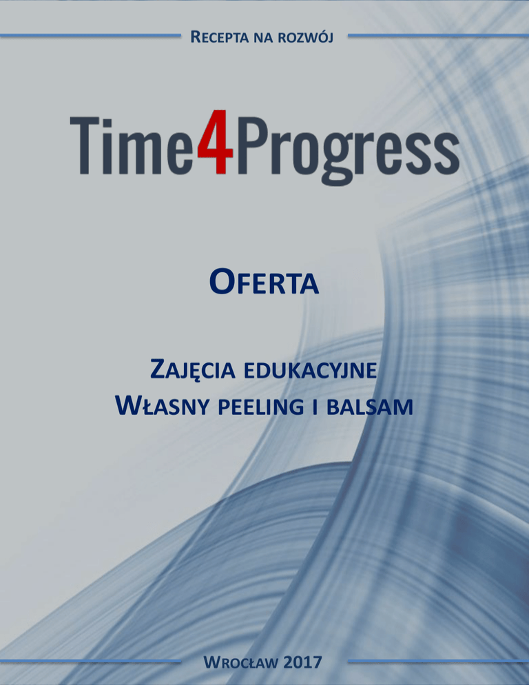 RECEPTA NA ROZWÓJ OFERTA ZAJĘCIA EDUKACYJNE WŁASNY PEELING I BALSAM WROCŁAW 2017 RECEPTA NA ROZWÓJ Zajęcia edukacyjne dla uczniów gimnazjum „Własny peeling i balsam” Działamy w obszarze badań i rozwoju nowych kosmetyków. Prowadzimy również warsztaty, podczas których dzielimy się wiedzą i praktycznymi technikami laboratoryjnymi, w sposób dostosowany do wieku ucznia. Zapraszamy do skorzystania z oferty zajęć dla uczniów gimnazjum z zakresu chemii kosmetycznej. Warsztaty prowadzi dr n. farm. Anna Nowicka. Podczas zajęć uczniowie poznają: historię przemysłu kosmetycznego, rodzaje skóry, czym jest i jak działa peeling, jak dobrać skład balsamu, jak wytworzyć w laboratorium peeling i balsam, jak peeling i balsam trafia na półkę z kosmetykami. Zależy nam na merytorycznej wartości zajęć edukacyjnych oraz by każdy ich uczestnik samodzielnie, własnoręcznie wykonał peeling i balsam. Zapewniamy uczniom pracę na sprzęcie laboratoryjnym. Podczas zajęć korzystamy z naturalnych, certyfikowanych składników. Korzyści z uczestnictwa w warsztacie. Gimnazjalista: dowie się, czym jest chemia kosmetyczna, pozna laboratoryjne techniki wytwarzania kosmetyków, będzie umiał wykonać samodzielnie naturalny peeling i balsam dobierając składniki do potrzeb skóry. Minimalna liczba osób w grupie wynosi: 10 uczniów. Koszt uczestnictwa w warsztatach: 40 zł brutto/osobę. Cena uwzględnia: 60-80 min zajęć, peeling i balsam, który uczeń zabiera do domu. W cenę wliczamy wszystkie składniki, pudełko, szkło laboratoryjne i materiały niezbędne do wykonania kremu. Jesteśmy otwarci na Państwa potrzeby i propozycje warsztatów. Zapraszamy również do podjęcia bliższej współpracy. Naszym partnerom zapewniamy dodatkowe atrakcje i rabaty cenowe. WROCŁAW 2017