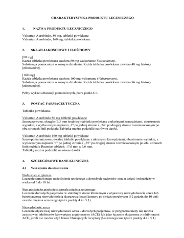 CHARAKTERYSTYKA PRODUKTU LECZNICZEGO 1. NAZWA PRODUKTU LECZNICZEGO Valsartan Aurobindo, 80 mg, tabletki powlekane Valsartan Aurobindo, 160 mg, tabletki powlekane 2. SKŁAD JAKOŚCIOWY I ILOŚCIOWY [80 mg] Każda tabletka powlekana zawiera 80 mg walsartanu (Valsartanum). Substancja pomocnicza o znanym działaniu: Każda tabletka powlekana zawiera 48 mg laktozy jednowodnej. [160 mg] Każda tabletka powlekana zawiera 160 mg walsartanu (Valsartanum). Substancja pomocnicza o znanym działaniu: Każda tabletka powlekana zawiera 96 mg laktozy jednowodnej. Pełny wykaz substancji pomocniczych, patrz punkt 6.1. 3. POSTAĆ FARMACEUTYCZNA Tabletka powlekana. Valsartan Aurobindo 80 mg tabletki powlekane Jasnoczerwone, okrągłe (9,3 mm średnicy) tabletki powlekane z ukośnymi krawędziami, obustronnie wypukłe, z wytłoczonym napisem „I” po jednej stronie i „74” po drugiej stronie rozmieszczonym po obu stronach linii podziału.Tabletkę można podzielić na równe dawki. Valsartan Aurobindo 160 mg tabletki powlekane Szaro-pomarańczowe, owalne tabletki powlekane z ukośnymi krawędziami, obustronnie wypukłe, z wytłoczonym napisem ”I” po jednej stronie i „75” po drugiej stronie rozmieszczonym po obu stronach linii podziału Rozmiar tabletek: 17,6 mm x 7,6 mm. Tabletkę można podzielić na równe dawki . 4. SZCZEGÓŁOWE DANE KLINICZNE 4.1 Wskazania do stosowania Nadciśnienie tętnicze Leczenie samoistnego nadciśnienia tętniczego u dorosłych pacjentów oraz u dzieci i młodzieży w wieku od 6 do 18 lat. Stan po świeżo przebytym zawale mięśnia sercowego Leczenie dorosłych pacjentów w stabilnym stanie klinicznym z objawową niewydolnością serca lub bezobjawową niewydolnością skurczową lewej komory po świeżo przebytym (12 godzin do 10 dni) zawale mięśnia sercowego (patrz punkty 4.4 i 5.1). Niewydolność serca Leczenie objawowej niewydolności serca u dorosłych pacjentów, w przypadku kiedy nie można zastosować inhibitorów konwertazy angiotensyny (ACE) lub jako leczenie skojarzone z inhibitorami ACE, jeżeli nie można użyć leków blokujących receptory β-adrenergiczne (patrz punkty 4.4 i 5.1). 4.2 Dawkowanie i sposób podawania Dawkowanie Nadciśnienie tętnicze Zalecana dawka początkowa produktu leczniczego Valsartan Aurobindo to 80 mg raz na dobę. Działanie przeciwnadciśnieniowe jest wyraźnie zauważalne w ciągu 2 tygodni, a maksymalny efekt osiągany jest w ciągu 4 tygodni. W przypadku niektórych pacjentów, u których nie uzyska się odpowiedniej kontroli ciśnienia tętniczego, dawkę można zwiększyć do 160 mg, a maksymalnie do 320 mg. Walsartan może być stosowany jednocześnie z innym lekami przeciwnadciśnieniowymi. Dodatkowe zastosowanie leku moczopędnego, takiego jak hydrochlorotiazyd, zwiększa hipotensyjne działanie walsartanu. Stan po świeżo przebytym zawale mięśnia sercowego U pacjentów w stabilnym stanie klinicznym leczenie może być rozpoczęte już po 12 godzinach od rozpoznania zawału mięśnia sercowego. Po zastosowaniu dawki początkowej 20 mg dwa razy na dobę, przez następnych kilka tygodni należy stopniowo zwiększać dawkę walsartanu do 40 mg, 80 mg i 160 mg, dwa razy na dobę. Dawkę początkową zapewnia podzielna tabletka 40 mg. Maksymalną dawką docelową jest 160 mg podawane dwa razy na dobę. Zwykle zaleca się, aby po rozpoczęciu leczenia pacjenci przez 2 tygodnie otrzymywali dawkę 80 mg dwa razy na dobę, a maksymalną dawkę docelową 160 mg podawaną dwa razy na dobę należy wprowadzić w ciągu 3 miesięcy, w zależności od tolerancji leku przez pacjenta. Jeśli wystąpi objawowe niedociśnienie tętnicze lub zaburzenie czynności nerek, należy rozważyć zmniejszenie dawki. Walsartan może być stosowany u pacjentów przyjmujących inne leki stosowane w leczeniu zawału mięśnia sercowego, takie jak leki trombolityczne, kwas acetylosalicylowy, leki blokujące receptory βadrenergiczne, statyny i leki moczopędne. Nie zaleca się jednoczesnego stosowania z inhibitorami ACE (patrz punkty 4.4 i 5.1). Ocena stanu pacjenta po przebytym zawale mięśnia sercowego powinna zawsze obejmować ocenę czynności nerek. Niewydolność serca Zalecana dawka początkowa produktu leczniczego Valsartan Aurobindo to 40 mg dwa razy na dobę. Zwiększanie dawki kolejno do 80 mg i 160 mg podawanych dwa razy na dobę powinno być przeprowadzane w odstępach co najmniej dwutygodniowych, do uzyskania największej dawki tolerowanej przez pacjenta. W przypadku jednoczesnego stosowania leku moczopędnego należy rozważyć zmniejszenie jego dawki. Maksymalna dawka dobowa zastosowana w badaniach klinicznych wynosiła 320 mg walsartanu w dawkach podzielonych. Walsartan może być stosowany u pacjentów przyjmujących inne leki stosowane w leczeniu niewydolności serca. Jednakże jednoczesne podawanie trzech leków (walsartanu z inhibitorami ACE i lekami blokującymi receptory β-adrenergiczne) (patrz punkty 4.4 i 5.1) nie jest zalecane. Ocena stanu pacjentów z niewydolnością serca powinna zawsze obejmować ocenę czynności nerek. Dodatkowe informacje dotyczące szczególnych populacji Stosowanie u osób w podeszłym wieku Nie ma konieczności zmiany dawkowania u osób w podeszłym wieku. Stosowanie u pacjentów z zaburzeniami czynności nerek Nie ma konieczności dostosowania dawki u dorosłych pacjentów z klirensem kreatyniny >10 ml/min (patrz punkty 4.4 i 5.2). Stosowanie u pacjentów z zaburzeniami czynności wątroby Stosowanie produktu leczniczego Valsartan Aurobindo jest przeciwwskazane u pacjentów z ciężkimi zaburzeniami czynności wątroby, żółciową marskością wątroby oraz u pacjentów z cholestazą (patrz punkty 4.3, 4.4 i 5.2). U pacjentów z łagodnymi do umiarkowanych zaburzeniami czynności wątroby bez cholestazy nie należy stosować dawek większych niż 80 mg walsartanu na dobę. Dzieci i młodzież Nadciśnienie tętnicze u dzieci i młodzieży Dzieci i młodzież w wieku od 6 do 18 lat D