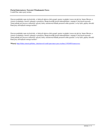 Portal Internetowy Nowości Wiadomości News I rzekł Pan: tańcz przy techno Zawsze podobały nam się kościoły, w których śpiewa chór gospel, pastor wygląda i rusza się jak śp. James Brown, a wierni wyskakują z ławek i pląsają w przejściu, fikają koziołki przed tabernakulum i stepują w bocznych nawach. Tutaj jednak jest jeszcze ciekawiej: artysta, który zmontował filmik postawił sobie pytanie: co by było, gdyby chwalić Pana przy dźwiękach ostrego techno? Zawsze podobały nam się kościoły, w których śpiewa chór gospel, pastor wygląda i rusza się jak śp. James Brown, a wierni wyskakują z ławek i pląsają w przejściu, fikają koziołki przed tabernakulum i stepują w bocznych nawach. Tutaj jednak jest jeszcze ciekawiej: artysta, który zmontował filmik postawił sobie pytanie: co by było, gdyby chwalić Pana przy dźwiękach ostrego techno? Więcej: http://fakty.interia.pl/fakty_dnia/news/i-rzekl-pan-tancz-przy-techno,1192450?source=rss. strona 1 / 1