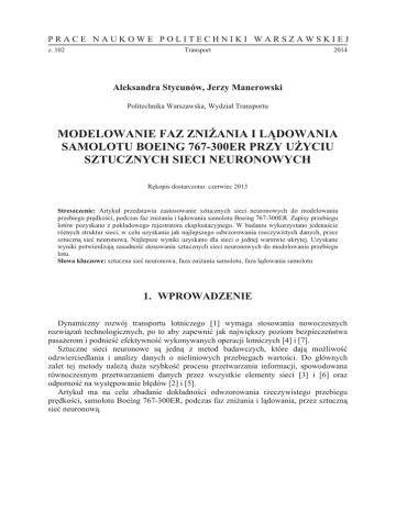 PRACE NAUKOWE POLITECHNIKI WARSZAWSKIEJ z. 102 Transport 2014 Aleksandra Stycunów, Jerzy Manerowski Politechnika Warszawska, WydziaI Transportu MODELOWANIE FAZ ZNI+ANIA I L-DOWANIA SAMOLOTU BOEING 767-300ER PRZY U+YCIU SZTUCZNYCH SIECI NEURONOWYCH RKkopis dostarczono: czerwiec 2013 Streszczenie: ArtykuI przedstawia zastosowanie sztucznych sieci neuronowych do modelowania przebiegu prKdkoQci, podczas faz zniSania i lTdowania samolotu Boeing 767-300ER. Zapisy przebiegu lotów pozyskano z pokIadowego rejestratora eksploatacyjnego. W badaniu wykorzystano jedenaQcie róSnych struktur sieci, w celu uzyskania jak najlepszego odwzorowania rzeczywistych danych, przez sztucznT sie[ neuronowT. Najlepsze wyniki uzyskano dla sieci o jednej warstwie ukrytej. Uzyskane wyniki potwierdzajT zasadnoQ[ stosowania sztucznych sieci neuronowych do modelowania przebiegu lotu. S5owa kluczowe: sztuczna sie[ neuronowa, faza zniSania samolotu, faza lTdowania samolotu 1. WPROWADZENIE Dynamiczny rozwój transportu lotniczego [1] wymaga stosowania nowoczesnych rozwiTza_ technologicznych, po to aby zapewni[ jak najwiKkszy poziom bezpiecze_stwa pasaSerom i podnieQ[ efektywnoQ[ wykonywanych operacji lotniczych [4] i [7]. Sztuczne sieci neuronowe sT jednT z metod badawczych, które dajT moSliwoQ[ odzwierciedlania i analizy danych o nieliniowych przebiegach wartoQci. Do gIównych zalet tej metody naleST duSa szybkoQ[ procesu przetwarzania informacji, spowodowana równoczesnym przetwarzaniem danych przez wszystkie elementy sieci [3] i [6] oraz odpornoQ[ na wystKpowanie bIKdów [2] i [5]. ArtykuI ma na celu zbadanie dokIadnoQci odwzorowania rzeczywistego przebiegu prKdkoQci, samolotu Boeing 767-300ER, podczas faz zniSania i lTdowania, przez sztucznT sie[ neuronowT. 136 Aleksandra Stycunów, Jerzy Manerowski 2. PODZIA; FAZ LOTU NA SEGMENTY W celu uzyskania jak najlepszego odwzorowania przebiegu prKdkoQci, fazy zniSania i lTdowania podzielono na charakterystyczne segmenty. W tablicy 1. zamieszczono szczegóIowy opis poszczególnych segmentów. Segmenty I-III dotyczT fazy zniSania samolotu, natomiast segmenty IV-VIII dotyczT lTdowania. Tablica 1 Podzia5 faz zni<ania i l=dowania na segmenty Nr segmentu I II III IV V VI VII VIII PoczTtek segmentu Opuszczenie przelotowego poziomu lotu PrKdkoQ[ CAS 280-310 [kt] 250 [kt] 220 [kt]; klapy 1 200 [kt]; klapy 5 180 [kt] 145 [kt] 140 [kt] Koniec segmentu FL 290 250 [kt] 220 [kt]; klapy w pozycji 0 200 [kt]; klapy 5 180 [kt]; klapy 20; wypuszczenie podwozia 150 [kt]; klapy 30 145 [kt] 30 [kt]; opuszczenie pasa Za poczTtek tego etapu lotu, a co za tym idzie poczTtek fazy zniSania, przyjKto chwilK, w której samolot opuszcza przelotowy poziom lotu. Ko_cem jest zredukowanie prKdkoQci do 30 wKzIów. Jest to jednoczeQnie koniec fazy lTdowania samolotu. 3. PARAMETRY SZTUCZNEJ SIECI NEURONOWEJ W badaniu wykorzystano stosunkowo proste struktury sztucznych sieci neuronowych. Wszystkie sieci miaIy 4 neurony w warstwie wejQciowej, jednT lub dwie warstwy ukryte, z róSnT liczbT neuronów [0-6] oraz jednym neuronem w warstwie wyjQciowej (Vi). SygnaIami wejQciowymi byIy: -czas (t); -segment (s); -wartoQ[ prKdkoQci przyrzTdowej w chwili i-2 (Vi-2); -wartoQ[ prKdkoQci przyrzTdowej w chwili i-1 (Vi-1). SygnaIem wyjQciowym byIa wartoQ[ prKdkoQci przyrzTdowej w chwili i (Vi). Do oblicze_ wykorzystany zostaI program komputerowy JETNET 2.0, który wykorzystuje algorytm momentowej metody wstecznej propagacji bIKdów [9]. OkreQla on strategiK doboru wag, w sieci wielowarstwowej, przy wykorzystaniu gradientowych metod optymalizacji. Do oceny jakoQci odwzorowania wykorzystano sumK kwadratów róSnic pomiKdzy wartoQciT z modelu i rzeczywistego obiektu (i2) oraz liczbK zdarze_ pozytywnych (lp). ZastosowanT funkcjT aktywacji jest funkcja sigmoidalna. Wzory zastosowanych algorytmów, zostaIy szerzej opisane w artykule [8]. Modelowanie faz zniSania i lTdowania samolotu Boeing 767-300ER… 137 4. WYNIKI OBLICZE@ Podczas bada_ przetestowano jedenaQcie róSnych struktur sieci, w celu uzyskania jak najlepszej jakoQci odwzorowania rzeczywistych danych przez model. Najlepsze wyniki daIy proste struktury sieci tj. o jednej warstwie ukrytej. W tablicy 2. zamieszczono wynik symulacji dla struktury, która najlepiej odwzorowaIa rzeczywisty przebieg prKdkoQci podczas zniSania samolotu. ByIa to struktura o 4 neuronach w warstwie wejQciowej (WE), 2 neuronach w pierwszej warstwie ukrytej oraz 1 neuronie w warstwie wyjQciowej (WY). Na rys. 1. przedstawiono porównanie rzeczywistego przebiegu prKdkoQci przyrzTdowej samolotu, podczas zniSania (Vlot), z przebiegiem wygenerowanym przez sztucznT sie[ neuronowT (Vssn). Tablica 2 Dok5adnoDF odwzorowania przebiegu prGdkoDci przyrz=dowej podczas zni<ania, dla struktury 421 WE 4 Struktura sieci Liczba neuronów w warstwie ukrytej 2 WY 1 Wyniki Liczba zdarze_ i2Qr pozytywnych lp 91,1 [%] 0,35396 10-2 Rys. 1. Porównanie przebiegu prKdkoQci przyrzTdowej i wygenerowanej przez SSN, podczas zniSania samolotu Na rys. 2. przedstawiono wykres zmian wartoQci bIKdu i2, w funkcji czasu, dla fazy zniSania. Wzrost wartoQci i2 spowodowany jest rosnTcT rozbieSnoQciT pomiKdzy przebiegiem prKdkoQci przyrzTdowej, pochodzTcym z pokIadowego rejestratora eksploatacyjnego, a jego odwzorowaniem wygenerowanym przez sztucznT sie[ neuronowT. 138 Aleksandra Stycunów, Jerzy Manerowski Rys. 2. Wykres zmian wartoQci i2 w czasie, dla fazy zniSania W tablicy 3. zamieszczono wynik symulacji dla struktury, która najlepiej odwzorowaIa rzeczywisty przebieg prKdkoQci podczas lTdowania samolotu. ByIa to struktura o 4 neuronach w warstwie wejQciowej, 4 neuronach w pierwszej warstwie ukrytej oraz 1 neuronie w warstwie wyjQciowej. Rys. 3. zawiera porównanie przebiegów prKdkoQci podczas lTdowania samolotu. Tablica 3 Dok5adnoDF odwzorowania przebiegu prGdkoDci przyrz=dowej podczas l=dowania, dla struktury 441 WE 4 Struktura sieci Liczba neuronów w warstwie ukrytej 4 WY 1 Wyniki Liczba zdarze_ i2 Qr pozytywnych lp 98,4 [%] 0,56618