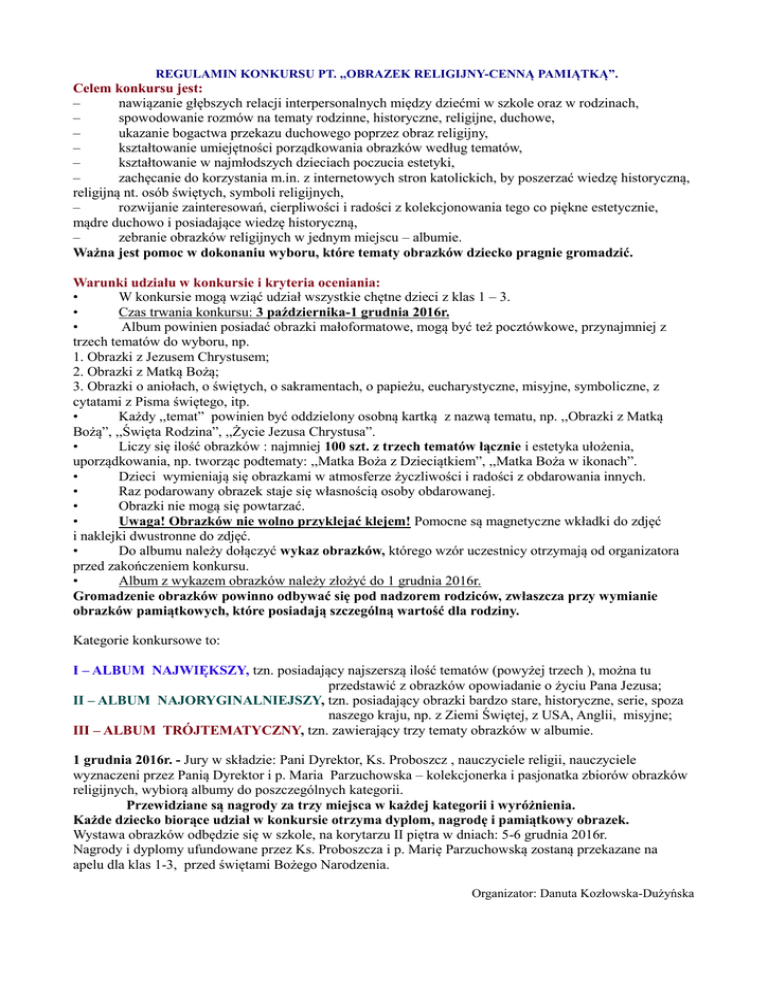 REGULAMIN KONKURSU PT. ,,OBRAZEK RELIGIJNY-CENNĄ PAMIĄTKĄ”. Celem konkursu jest: – nawiązanie głębszych relacji interpersonalnych między dziećmi w szkole oraz w rodzinach, – spowodowanie rozmów na tematy rodzinne, historyczne, religijne, duchowe, – ukazanie bogactwa przekazu duchowego poprzez obraz religijny, – kształtowanie umiejętności porządkowania obrazków według tematów, – kształtowanie w najmłodszych dzieciach poczucia estetyki, – zachęcanie do korzystania m.in. z internetowych stron katolickich, by poszerzać wiedzę historyczną, religijną nt. osób świętych, symboli religijnych, – rozwijanie zainteresowań, cierpliwości i radości z kolekcjonowania tego co piękne estetycznie, mądre duchowo i posiadające wiedzę historyczną, – zebranie obrazków religijnych w jednym miejscu – albumie. Ważna jest pomoc w dokonaniu wyboru, które tematy obrazków dziecko pragnie gromadzić. Warunki udziału w konkursie i kryteria oceniania: • W konkursie mogą wziąć udział wszystkie chętne dzieci z klas 1 – 3. • Czas trwania konkursu: 3 października-1 grudnia 2016r. • Album powinien posiadać obrazki małoformatowe, mogą być też pocztówkowe, przynajmniej z trzech tematów do wyboru, np. 1. Obrazki z Jezusem Chrystusem; 2. Obrazki z Matką Bożą; 3. Obrazki o aniołach, o świętych, o sakramentach, o papieżu, eucharystyczne, misyjne, symboliczne, z cytatami z Pisma świętego, itp. • Każdy ,,temat” powinien być oddzielony osobną kartką z nazwą tematu, np. ,,Obrazki z Matką Bożą”, ,,Święta Rodzina”, ,,Życie Jezusa Chrystusa”. • Liczy się ilość obrazków : najmniej 100 szt. z trzech tematów łącznie i estetyka ułożenia, uporządkowania, np. tworząc podtematy: ,,Matka Boża z Dzieciątkiem”, ,,Matka Boża w ikonach”. • Dzieci wymieniają się obrazkami w atmosferze życzliwości i radości z obdarowania innych. • Raz podarowany obrazek staje się własnością osoby obdarowanej. • Obrazki nie mogą się powtarzać. • Uwaga! Obrazków nie wolno przyklejać klejem! Pomocne są magnetyczne wkładki do zdjęć i naklejki dwustronne do zdjęć. • Do albumu należy dołączyć wykaz obrazków, którego wzór uczestnicy otrzymają od organizatora przed zakończeniem konkursu. • Album z wykazem obrazków należy złożyć do 1 grudnia 2016r. Gromadzenie obrazków powinno odbywać się pod nadzorem rodziców, zwłaszcza przy wymianie obrazków pamiątkowych, które posiadają szczególną wartość dla rodziny. Kategorie konkursowe to: I – ALBUM NAJWIĘKSZY, tzn. posiadający najszerszą ilość tematów (powyżej trzech ), można tu przedstawić z obrazków opowiadanie o życiu Pana Jezusa; II – ALBUM NAJORYGINALNIEJSZY, tzn. posiadający obrazki bardzo stare, historyczne, serie, spoza naszego kraju, np. z Ziemi Świętej, z USA, Anglii, misyjne; III – ALBUM TRÓJTEMATYCZNY, tzn. zawierający trzy tematy obrazków w albumie. 1 grudnia 2016r. - Jury w składzie: Pani Dyrektor, Ks. Proboszcz , nauczyciele religii, nauczyciele wyznaczeni przez Panią Dyrektor i p. Maria Parzuchowska – kolekcjonerka i pasjonatka zbiorów obrazków religijnych, wybiorą albumy do poszczególnych kategorii. Przewidziane są nagrody za trzy miejsca w każdej kategorii i wyróżnienia. Każde dziecko biorące udział w konkursie otrzyma dyplom, nagrodę i pamiątkowy obrazek. Wystawa obrazków odbędzie się w szkole, na korytarzu II piętra w dniach: 5-6 grudnia 2016r. Nagrody i dyplomy ufundowane przez Ks. Proboszcza i p. Marię Parzuchowską zostaną przekazane na apelu dla klas 1-3, przed świętami Bożego Narodzenia. Organizator: Danuta Kozłowska-Dużyńska