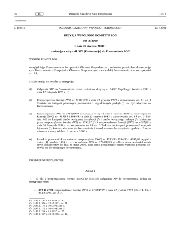 80 Dziennik Urzędowy Unii Europejskiej PL 11/t. 6 22000D0018 L 103/36 DZIENNIK URZĘDOWY WSPÓLNOT EUROPEJSKICH DECYZJA WSPÓLNEGO KOMITETU EOG NR 18/2000 z dnia 28 stycznia 2000 r. zmieniająca zalącznik XIV (Konkurencja) do Porozumienia EOG WSPÓLNY KOMITET EOG uwzględniając Porozumienie o Europejskim Obszarze Gospodarczym, zmienione protokolem dostosowującym Porozumienie o Europejskim Obszarze Gospodarczym, zwane dalej Porozumienie, a w szczególności art. 98, a także mając na uwadze co następuje: (1) Zalącznik XIV do Porozumienia zostal zmieniony decyzją nr 84/97 Wspólnego Komitetu EOG z dnia 12 listopada 1997 r. (1) (2) Rozporządzenie Komisji (WE) nr 2790/1999 z dnia 22 grudnia 1999 o zastosowaniu art. 81 ust. 3 Traktatu do kategorii pionowych porozumień i uzgodnionych praktyk (2) ma być wlączone do Porozumienia. (3) Rozporządzenie (WE) nr 2790/1999 zastępuje, z mocą od dnia 1 czerwca 2000 r., rozporządzenie Komisji (EWG) nr 1983/83 i 1984/83 z dnia 22 czerwca 1983 o zastosowaniu art. 85 ust. 3 Traktatu WE do kategorii umów wylącznej dystrybucji (3) i umów wylącznego zakupu (4), zmienione przez rozporządzenie Komisji (WE) nr 1582/97 (5), i rozporządzenie Komisji (EWG) nr 4087/88 z dnia 30 listopada 1988 r. o zastosowaniu art. 85 ust. 3 Traktatu do kategorii porozumień uprzywilejowania (6), które są wlączone do Porozumienia i konsekwentnie do zastąpienia zgodnie z Porozumieniem z mocą od dnia 1 czerwca 2000 r. (4) Jednakże ponieważ okres ważności rozporządzeń (EWG) nr 1983/83, 1984/83 i 4087/88 wygasl z dniem 31 grudnia 1999 r., rozporządzenie (WE) nr 2790/1999 przedluża okres ważności niniejszych dokumentów do dnia 31 maja 2000. Takie samo przedlużenie okresu ważności powinno stosować się do niniejszego Porozumienia, PRZYJMUJE NINIEJSZĄ DECYZJĘ: Artykul 1 1. W pkt 2 (rozporządzenie Komisji (EWG) nr 1983/83) zalącznika XIV do Porozumienia dodaje się następujące tiret: „— 399 R 2790: rozporządzenie Komisji (WE) nr 2790/1999 z dnia 22 grudnia 1999 (Dz.U. L 336 z 29.12.1999, str. 21).”. (1) (2) (3) (4) (5) (6) Dz.U. Dz.U. Dz.U. Dz.U. Dz.U. Dz.U. L L L L L L 160 z 4.6.1998, str. 42. 336 z 29.12.1999, str. 21. 173 z 30.6.1983, str. 1. 173 z 30.6.1983, str. 5. 214 z 6.8.1997, str. 27. 359 z 28.12.1988, str. 46. 12.4.2001 11/t. 6 Dziennik Urzędowy Unii Europejskiej PL 2. W pkt 3 (rozporządzenie Komisji (EWG) nr 1984/83) zalącznika XIV do Porozumienia dodaje się następujące tiret: „— 399 R 2790: rozporządzenie Komisji (WE) nr 2790/1999 z dnia 22 grudnia 1999 (Dz.U. L 336 z 29.12.1999, str. 21).”. 3. Punkt 8 (rozporządzenie Komisji (EWG) nr 4087/88) zalącznika XIV do Porozumienia otrzymuje brzmienie: 1) przed adaptacjami dodaje się: „ , ze zmianami wprowadzonymi przez: — 399 R 2790: rozporządzenie Komisji (WE) nr 2790/1999 z dnia 22 grudnia 1999 (Dz.U. L 336 z 29.12.1999, str. 21).”; 2) skreśla się adaptację lit. j). Artykul 2 Zalącznik XIV do Porozumienia otrzymuje następujące brzmienie z mocą od dnia 1 czerwca 2000 r.: 1) tytul rozdzialu B „UMOWY WYLĄCZNYCH TRANSAKCJI” otrzymuje brzmienie: „PIONOWE UMOWY I UZGODNIONE PRAKTYKI”; 2) tekst w pkt 2 (rozporządzenie Komisji (EWG) nr 1983/83) zalącznika XIV do Porozumienia otrzymuje brzmienie: „399 R 2790: rozporządzenie Komisji (WE) nr 2790/1999 z dnia 22 grudnia 1999 r. o stosowaniu art. 81 ust. 3 Traktatu do kategorii porozumień wertykalnych i praktyk uzgodnionych (Dz.U. L 336 z 29.12.1999, str. 21). Przepisy rozporządzenia, na użytek Porozumienia, brzmią jak następuje: a) w art. 6, sformulowanie »na podstawie art. 7 ust. 1 rozporządzenia nr 19/65/EWG« brzmi »albo z wlasnej inicjatywy albo na życzenie innej wladzy nadzorującej albo Państwa zgodnie ze swoimi kompetencjami albo osoby fizycznej lub prawnej roszczącej uzasadniony interes«; b) na końcu art. 6 dodaje się następujący ustęp: »Kompetentna wladza nadzorująca może w takich przypadkach wydać decyzję zgodnie art. 6 i 8 rozporządzenia (EWG) nr 17, albo odpowiadające postanowienia przewidziane w protokole 21 Porozumienia EOG, jednocześnie nie jest wymagana notyfikacja od danych przedsiębiorstw.«”; 3) skreśla się tekst pkt 3 (rozporządzenie Komisji (EWG) nr 1984/83); 4) skreśla się tytul rozdzialu E (umowy uprzywilejowanej) i tekst pkt 8 (rozporządzenie Komisji (EWG) nr 4087/88). Artykul 3 Teksty rozporządzenia (WE) nr 2790/1999 w językach islandzkim i norweskim, zalączone w stosownych wersjach językowych niniejszej decyzji, są autentyczne. 81 82 PL Dziennik Urzędowy Unii Europejskiej 11/t. 6 Artykul 4 Niniejsza decyzja wchodzi w życie z dniem 29 stycznia 2000 r., pod warunkiem że wszystkie notyfikacje na mocy art. 103 ust. 1 Porozumienia zostaly dokonane wobec Wspólnego Komitetu EOG (*) stosuje się od dnia 1 stycznia 2000 r. Artykul 5 Niniejsza decyzja jest opublikowana w Sekcji EOG i w Dodatku EOG do Dziennika Urzędowego Wspólnot Europejskich. Sporządzono w Brukseli, dnia 28 stycznia 2000 r. W imieniu Wspólnego Komitetu EOG F. BARBASO Przewodniczący (*) Nie wskazano wymogów konstytucyjnych.