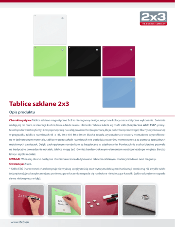 Tablice szklane 2x3 Opis produktu 2x3 Art. Nr: TSA Charakterystyka: Tablice szklane magnetyczne 2x3 to nienaganny design, nasycone kolory oraz estetyczne wykonanie. Świetnie nadają się do biura, restauracji, kuchni, holu, a także salonu i łazienki. Tablica składa się z tafli szkła (bezpieczne szkło ESG*, pokryte od spodu warstwą farby) i zespojonej z nią na całej powierzchni (za pomocą kleju polichloroprenowego) blachy ocynkowanej; w przypadku tablic o rozmiarach 45 x 45, 60 x 40 i 80 x 60 cm blacha została wyposażona w otwory montażowe wyprofilowane w jednorodnym materiale, tablice w pozostałych rozmiarach nie posiadają otworów, montowane są za pomocą specjalnych metalowych zawieszek. Dzięki zaokrąglonym narożnikom są bezpieczne w użytkowaniu. Powierzchnia suchościeralna pozwala na tradycyjne prowadzenie notatek, tablice mogą być również bardzo ciekawym elementem wystroju każdego wnętrza. Bardzo łatwy i szybki montaż. UWAGA! W naszej ofercie dostępne również akcesoria dedykowane tablicom szklanym: markery kredowe oraz magnesy. Gwarancja: 2 lata. * Szkło ESG (hartowane) charakteryzuje się wyższą sprężystością oraz wytrzymałością mechaniczną i termiczną niż zwykłe szkło (odprężone); jest bezpieczniejsze, ponieważ po stłuczeniu rozpada się na drobne niekaleczące kawałki (szkło odprężone rozpada się na niebezpieczne igły). www.2x3.eu SPECYFIKACJA TECHNICZNA Tablice szklane 2x3 Kolor Wymiary [cm] Waga [kg] TSZ4545 B 45 x 45 2,55 TSZ64 B 40 x 60 3,0 TSZ86 B 60 x 80 6,0 TSZ129 B 120 x 90 13,5 TSZ1510 B 150 x 100 20,7 TSZ4545 W 45 x 45 2,55 TSZ64 W 40 x 60 3,0 2x3 Art. Nr Właściwości powierzchni / Materiały 60 x 80 6,0 TSZ1010 W 100 x 100 12,6 TSZ129 W 120 x 90 13,5 TSZ1510 W 150 x 100 20,7 TSZ1020 W 200 x 100 28,8 TSZ4545 R 45 x 45 2,55 przód: szkło TSZ64 R 40 x 60 3,0 tył: blacha ocynkowana TSZ86 W TSZ86 R 60 x 80 6,0 TSZ129 R 120 x 90 13,5 TSZ1510 R 150 x 100 20,7 TSZ4545 G 45 x 45 2,55 TSZ64 G 40 x 60 3,0 TSZ86 G 60 x 80 6,0 TSZ4545 N 45 x 45 2,55 TSZ64 N 40 x 60 3,0 TSZ86 N 60 x 80 6,0 TSZ129 N 120 x 90 13,5 150 x 100 20,7 TSZ1510 N Gwarancja suchościeralna magnetyczna / 2 lata 45 x 45 40 x 60 120 x 90 60 x 80 100 x 100 2x3 S.A. 73-231 Krzęcin, ul. Słoneczna 3, Polska [i]: 801 23 00 23 [t]: +48 95 765 3848 [f]: +48 95 765 3850 [e]: [email protected] [w]: www.2x3.eu 150 x 100 innowacje w komunikacji wizualnej