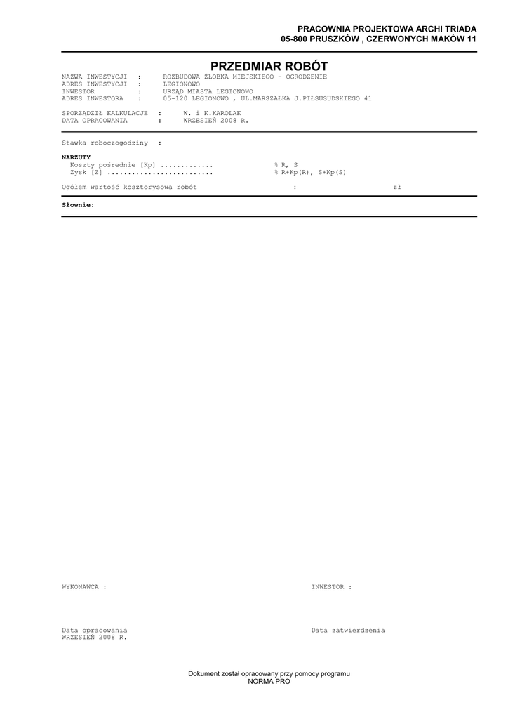 PRACOWNIA PROJEKTOWA ARCHI TRIADA 05-800 PRUSZKÓW , CZERWONYCH MAKÓW 11 PRZEDMIAR ROBÓT NAZWA INWESTYCJI ADRES INWESTYCJI INWESTOR ADRES INWESTORA : : : : ROZBUDOWA śŁOBKA MIEJSKIEGO - OGRODZENIE LEGIONOWO URZĄD MIASTA LEGIONOWO 05-120 LEGIONOWO , UL.MARSZAŁKA J.PIŁSUSUDSKIEGO 41 SPORZĄDZIŁ KALKULACJE DATA OPRACOWANIA : : Stawka roboczogodziny : W. i K.KAROLAK WRZESIEŃ 2008 R. NARZUTY Koszty pośrednie [Kp] ............. Zysk [Z] .......................... Ogółem wartość kosztorysowa robót % R, S % R+Kp(R), S+Kp(S) : zł Słownie: WYKONAWCA : INWESTOR : Data opracowania WRZESIEŃ 2008 R. Data zatwierdzenia Dokument został opracowany przy pomocy programu NORMA PRO Legionowo_zlobek_ogrodzenie KSIĄśKA PRZEDMIARÓW Lp. Podst Opis i wyliczenia 1 Roboty rozbiórkowe - kod CPV 45110000-1 1 kalkulacja Rozbiórka istniejącego smietnika oraz demontaŜ ogrodzenia d.1 własna S.S.Tnr 3 1 2 KNR 2-31 d.1 0101-01 3 Trawniki - kod CPV 45220000-5 4 KNR 2-21 Ręczne przekopanie gleby na terenie płaskim w gruncie kat.I-II nie zadarniod.3 0201-01 nym S.S.Tnr 3 350 6 KNR 2-21 d.3 0218-01 S.S.Tnr 3 7 KNR 2-21 d.3 0401-01 S.S.Tnr 3 kpl m2 m2 0,035 ha Rozścielenie ziemi urodzajnej ręczne z przerzutem na terenie płaskim m3 350*0,1 m3 Wykonanie trawników dywanowych siewem na gruncie kat.I-II bez nawoŜenia m2 350 m2 m2 13 KNR 2-21 d.3 0607-01 j.w 14 KNR 2-21 d.3 0607-02 j.w 1,000 470,000 RAZEM 470,000 420,000 RAZEM 420,000 350,000 RAZEM 350,000 0,035 RAZEM 0,035 35,000 RAZEM 35,000 350,000 RAZEM 350,000 25,000 RAZEM 25,000 25,000 RAZEM 25,000 10,000 RAZEM 10,000 25,000 RAZEM 25,000 150,000 RAZEM 150,000 3,000 RAZEM 3,000 Ręczne rozrzucenie mieszanki z torfu i nawozów mineralnych na terenie płas- ha kim grub.warstwy 2 cm 9 KNR 2-21 Układ.nawierzchni placów i drog ogrodowych (kat.gruntu I-II grub.warstwy po d.3 0502-01 ana- zagęszcz. 3 cm)- nawierzchnia zwirowa logia j.w 25 12 KNR 2-21 d.3 0332-05 j.w 1,000 RAZEM m2 m2 11 KNR 2-21 d.3 0322-06 j.w Razem m2 8 KNR 2-21 Układ.nawierzchni placów i drog ogrodowych (kat.gruntu I-II grub.warstwy po d.3 0502-01 ana- zagęszcz. 3 cm)- piasek logia j.w 25 10 KNR 2-21 d.3 0301-07 j.w Poszcz kpl Mechaniczne wykonanie koryta na całej szerokości jezdni i chodników w grun- m2 cie kat.I-IV głębok. 20 cm 470 m2 2 Sztuczna nawierzchnia pod place zabaw - kod CPV 45233260-9 3 KNR 2-31 Sztuczna nawierzchnia typu Fleksana d.2 0502-08 analogia S.S.Tnr 3 420 5 KNR 2-21 d.3 0210-01 S.S.Tnr 3 j.m. m2 m2 Sadzenie drzew liściast.form naturalnych na terenie płaskim w gr.kat.I-II z cał- szt. kowitą zaprawą dołów śr./głębok. 1.0/0.7 m 10 szt. Sadzenie krzewów iglastych na terenie płaskim w gruncie kat.I-II z zaprawą dołów śr./głębok. 1.0/0.7 m szt. 25 szt. Sadzenie krzewów Ŝywopłotowych w rowach o szer.ponad 45 cm w gruncie kat.III z całkowitą zaprawą rowów szt. 150 szt. Ławki parkowe z prefabrykatów Ŝelbetowych - podpory Ŝelbetowe m 2*1,5 m Ławki parkowe z prefabrykatów Ŝelbetowych - obudowa drewniana siedzeniowa z zabezpieczeniem i pomalowaniem m 2*1,5 m -2- Norma PRO Wersja 4.01, Marzec 2003 r. 3,000 Legionowo_zlobek_ogrodzenie Lp. Podst KSIĄśKA PRZEDMIARÓW Opis i wyliczenia 4 Wywóz ziemi - kod CPV 45110000-1 15 KNR 4-01 Wywóz ziemi samochodami samowyładowczymi na odległość do 1 km grunt. d.4 0108-06 kat. III j.w 470*0,2 16 KNR 4-01 d.4 0108-04 j.w 19 KNNR 2 d.5 1601-02 j.w 20 KNNR 2 d.5 1601-04 j.w 21 KNR 2-02 d.5 0208-01 j.w 22 KNR 2-02 d.5 0290-01 j.w 23 KNR 2-02 d.5 0290-02 j.w m3 m3 94 m3 Razem 3,000 94,000 RAZEM 94,000 94,000 RAZEM 94,000 177,600 RAZEM 177,600 3,700 RAZEM 3,700 68,000 RAZEM 68,000 68,000 RAZEM 68,000 0,731 RAZEM 0,731 0,200 RAZEM 0,200 0,800 RAZEM 0,800 46,400 RAZEM 46,400 24,156 RAZEM 24,156 28,700 RAZEM 28,700 2,022 RAZEM 2,022 184,396 RAZEM 184,396 m3 m3 Podkłady z ubitych materiałów sypkich pod cokół - piasek gruby lub pospółka m3 148*0,1*0,25 m3 Cokoły betonowe 0.2x0.3 m na podsypce piaskowej i podbudowie betonowej m 68 m Cokoły betonowe i - dodatek za kaŜde 10cm róŜnicy wys. Krotność = 4 m 68 m Fundamenty pod słupki betonowe m3 [0,3*0,3*0,58*14] m3 Przygotowanie i montaŜ zbrojenia elementów budynków i budowli - pręty gład- t kie 0,2 t Przygotowanie i montaŜ zbrojenia elementów budynków i budowli - pręty Ŝebrowane t 0,8 t 24 KNR-W 2-02 Podmurówka z cegieł klinkierowych na zaprawie mrozoodpornej grubości 1 d.5 0103-04 ceg. j.w 80*0,58 m2 25 KNR 2-02 d.5 0920-06 j.w ObłoŜenie cokołu nakrywą klinkierową o szer.32 cm m2 80*0,32-[0,38*0,38*10] m2 m2 26 KNR-W 2-02 Słupy ogrodzeniowe z cegieł pełnych klinkierowych na zaprawie mrozoodpord.5 0124-10 nej 1 1/2x1 1/2 ceg. j.w 2,05*14 m 27 KNR 2-02 d.5 0920-06 j.w Czapki klinkierowe na słupkach m2 [0,38*0,38*14] m2 Dodatek za spoinowanie m2 80*2+22,876+[0,38*4] m2 28 KNR 2-02 d.5 0217-08 j.w Poszcz RAZEM m3 Wywóz ziemi samochodami skrzyniowymi - za kaŜdy nast. 1 km Krotność = 10 5 Ogrodzenie - kod CPV 45340000-2 17 KNNR 1 Wykopy pod cokół betonowy d.5 030-01 j.w 148*1,5*0,8 18 KNNR 2 d.5 1201-03 j.w j.m. -3- Norma PRO Wersja 4.01, Marzec 2003 r. m Legionowo_zlobek_ogrodzenie KSIĄśKA PRZEDMIARÓW Lp. Podst Opis i wyliczenia 29 KNR-W 2-02 Przęsła ogrodzeniowe ze stali kształtowej co 120 mm o przekroju 18x18 mm d.5 1210-02 ana- montowane do słupków na wysok.1,4 wraz ze słupkami stalowymi 80 x 80 logia j.w 65*1,4 j.m. m2 m2 30 KNNR 2 Ogrodzenie z siatki stalowej plecionej o oczkach 50x50x5 mm rozpiętej na m d.5 1603-03 ana- trzech linkach stalowych wys. 1.8 m na słupkach stalowych obsadz.w cokole betonowym z pomalowaniem elementów metalowych logia 80 m 31 KNNR 1 d.5 0318-01 j.w 32 KNNR 1 d.5 0504-01 33 KNR 2-02 d.5 1808-04 j.w Zasypywanie wykopów o ścianach pionowych - ziemia z wykopu m3 91,2-1,9-0,522 m3 Ręczne rozplantowanie ziemi wydobytej z wykopów przy 1 m3 ziemi na 1 m wykopu; grunt kat.I-II 1,9+0,522 m3 Brama stalowa z furtką - 1 brama o dł.4,0 m automatycznie otwierana przesuwna samonoś