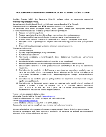 OGŁOSZENIE O NABORZE NA STANOWISKO NAUCZYCIELA W ZESPOLE SZKÓŁ W ATENACH Dyrektor Zespołu Szkół im. Zygmunta Mineyki ogłasza nabór na stanowisko nauczyciela wiedzy o społeczeństwie. Nazwa i adres jednostki: Zespół Szkół im. Z.Mineyki przy Ambasadzie RP w Atenach Wymiar zatrudnienia: niepełny etat 4/26, umowa o pracę na czas określony. Do składania ofert może przystąpić osoba, która spełnia następujące wymagania związane ze stanowiskiem nauczyciela wiedzy o społeczeństwie w gimnazjum: 1. Posiada obywatelstwo polskie 2. Posiada wykształcenie wyższe kierunkowe z przygotowaniem pedagogicznym 3. Spełnia warunki zdrowotne niezbędne do wykonywania zawodu nauczyciela 4. Posiada pełną zdolność do czynności prawnych oraz korzysta z pełni praw publicznych 5. Nie była karana za przestępstwo umyślne oraz nie toczy się przeciwko niej postępowanie karne 6. Znajomość języka greckiego w stopniu minimum komunikatywnym. Wymagane dokumenty: 1. List motywacyjny 2. Życiorys z opisem przebiegu pracy zawodowej. 3. Kwestionariusz osobowy. 4. Kserokopie świadectw potwierdzających także dodatkowe kwalifikacje, uprawnienia, umiejętności. 5. Kserokopie świadectw potwierdzających przebieg pracy zawodowej. 6. Kserokopia dokumentu potwierdzającego obywatelstwo polskie – dowód osobisty 7. Zaświadczenie lekarskie o braku przeciwwskazań zdrowotnych do pracy na stanowisku nauczyciel. 8. Oświadczenie, że kandydat nie był karany za przestępstwo popełnione umyślnie oraz nie toczy się przeciwko niemu postępowanie karne. Wybrana osoba będzie zobowiązana do dostarczenia świadectwa o niekaralności z Krajowego Rejestru Karnego i wykonania badań lekarskich. 9. Oświadczenie, że kandydat posiada pełną zdolność do czynności prawnych oraz korzysta z pełni praw publicznych. 10. Oświadczenie, że kandydat wyraża zgodę na przetwarzanie swoich danych osobowych zgodnie z ustawą z dnia 29 sierpnia 1997 r. o ochronie danych osobowych (Dz.U. z 2002 r. Nr 101, poz. 926 z późn. zm.) w celach przeprowadzenia naboru na stanowisko nauczyciela wiedzy o społeczeństwie. Termin i miejsce składania dokumentów: Sekretariat Zespołu Szkół w Atenach (www.atenyzs.pl ) Osobiście: ul.Navarinou 19. 155-62 Holargos, tel. +302106538204 Online : [email protected] Termin składania aplikacji : 13.06.2016 r. do 27.06.2016 r. Dokumenty, które wpłyną po upływie tego terminu nie będą rozpatrywane. Dokumenty kandydata, który zostanie wyłoniony w procesie rekrutacji dołącza się do jego akt osobowych. Dokumenty pozostałych osób będą zniszczone komisyjnie lub zwracane na wniosek zainteresowanych w terminie 14 dni od dnia zakończenia rekrutacji.