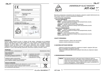 UNIWERSALNY KLUCZ RADIOWY „KITKIT-02 ™” Ver. 01 Sterownik o przeznaczeniu uniwersalnym słuŜy do włączania i wyłączania urządzeń elektronicznych przy uŜyciu pilotów radiowych za pomocą wbudowanych przekaźników. 1.OPIS DZIAŁANIA URZĄDZENIA. tryb pracy BISTABILNY. Załączenie - Nacisnąć i puścić przycisk w pilocie EFEKT: załączenie przekaźnika do którego został zaprogramowany przycisk, zwarcie styku CM do NO w tym przekaźniku Wyłączenie - Nacisnąć i puścić przycisk w pilocie ponownie EFEKT: wyłączenie przekaźnika do którego został zaprogramowany przycisk, rozwarcie styku CM od NO Tryb pracy MONOSTABILNY. Załączenie - Nacisnąć i trzymać przycisk w pilocie EFEKT: załączenie przekaźnika do którego został zaprogramowany przycisk, zwarcie styku CM do NO Wyłączenie - Puścić trzymany przycisk w pilocie EFEKT: wyłączenie przekaźnika do którego został zaprogramowany przycisk, rozwarcie styku CM od NO, 2.ZALETY STEROWNIKA: GWARANCJA. Producent udziela gwarancji na okres 12 miesięcy od daty zakupu i zobowiązuje się do bezpłatnej naprawy urządzenia, jeŜeli w okresie tym wystąpią wady z winy producenta. Wadliwe urządzenie naleŜy dostarczyć do miejsca zakupu w stanie czystym i na własny koszt wraz z niniejszą gwarancją, paragonem zakupu lub fakturą VAT i krótkim opisem uszkodzenia. Koszt demontaŜu i montaŜu urządzenia ponosi uŜytkownik. Gwarancja nie obejmuje baterii w pilotach oraz wszystkich uszkodzeń powstałych w wyniku nieprawidłowego uŜytkowania, samowolnych regulacji, przeróbek i napraw. Producent: AMT, 57-100 Strzelin, ul. DzierŜoniowska 14 Wyprodukowano w Polsce - moŜliwość sterowania 1 pilotem wielu sterowników - obudowa umoŜliwia zastosowanie na zewnątrz 3. ZALECENIA DOTYCZACE MONTAśU - Zabrania się wykonywania podłączenia urządzenia do urządzeń z napięciem 230V przez osoby nie posiadające wymaganych uprawnień - Zabrania się wykonywania jakichkolwiek podłączeń sterownika przy załączonym napięciu zasilającym. Dane techniczne: Napięcie zasilania Max napięcie przełączane przekaźnikiem Max prąd wyjść przekaźnika dla DC=12V DC 12-24V AC 230V 5A Częstotliwość nośna pilotów Temperatura pracy w oC Ilość maksymalna pilotów zapamiętywanych w pamięci 433.92 MHz -10 ÷ +50 100 Urządzenie to spełnia wymogi dyrektyw EMC 2004/108/EC kompatybilność elektromagnetyczna R&TTE 1999/5/EC urządzenia radiokomunikacyjne 4 .PROGRAMOWANIE STEROWNIKA: UWAGA! Ochrona środowiska Produkt ten nie moŜe być traktowany jako odpad domowy i wrzucony do śmieci. Aby chronić środowiska naturalne zapewnij prawidłową utylizacje. Informacje dotyczące recyklingu niniejszego produktu otrzymasz w punkcie sprzedaŜy lub u przedstawicieli władz lokalnych. KLUCZ RADIOWY™ KIT-02 ™ Aby sterownik pracował w trybie pracy innym niŜ fabryczny naleŜy go zaprogramować do tego trybu działania. Przed programowaniem przekaźniki muszą być w stanie wyłączonym. Dostęp do ustawień funkcji moŜliwy jest po otwarciu wieka obudowy. Podczas programowania wyjścia z przekaźników nie powinny być podłączone do innych systemów 6. Tabela opisująca wyprowadzenia przekaźników 4.1 Programowanie ustawień sterownika: Naciśnij i puść przycisk P1 umieszczony na płycie sterownika: - 1 raz to przekaźnik R1 zaprogramujesz do pracy w trybie monostabilnym - 2 razy to przekaźnik R2 zaprogramujesz do pracy w trybie monostabilnym - 3 razy to przekaźnik R1 zaprogramujesz do pracy w trybie bistabilnym - 4 razy to przekaźnik R2 zaprogramujesz do pracy w trybie bistabilnym EFEKT: zapali się dioda led na płycie sterownika następnie naciśnij przycisk pilota , który zamierzasz zaprogramować do tej funkcji EFEKT: uŜyty przycisk pilota zostanie zaprogramowany do wybranej funkcji Przekaźnik R1 Opis płyta OUT1 Opis diagram CM Opis działania Kotwica przekaźnika R1 NO NO Styk normalnie rozwarty R2 OUT2 CM Kotwica przekaźnika R2 NO NO Styk normalnie zwarty Procedurę naleŜy powtórzyć z drugim pilotem Kasowanie ustawień pilotów Naciśnij przycisk P2 na ok. 8 sekund EFEKT: Dioda LED zapali się następnie zgaśnie a piloty zostaną wykasowane z pamięci centrali Puść trzymany przycisk 5. Rozmieszczenie elementów na płycie sterownika KIT-01 KLUCZ RADIOWY™ KIT-02 ™