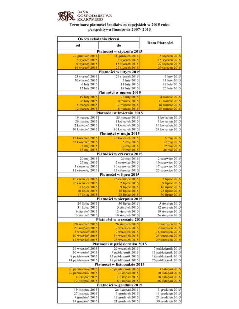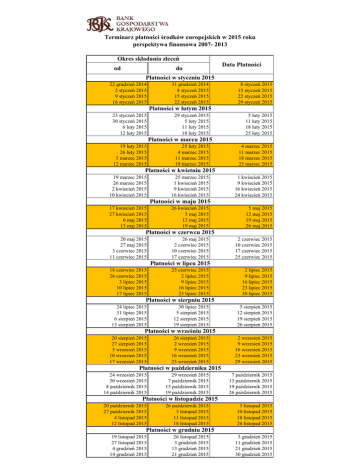 Terminarz płatności środków europejskich w 2015 roku perspektywa finansowa 2007- 2013 Okres składania zleceń od do Data Płatności Płatności w styczniu 2015 22 grudzień 2014 2 styczeń 2015 9 styczeń 2015 16 styczeń 2015 31 grudzień 2014 8 styczeń 2015 15 styczeń 2015 22 styczeń 2015 8 styczeń 2015 15 styczeń 2015 22 styczeń 2015 29 styczeń 2015 Płatności w lutym 2015 23 styczeń 2015 30 styczeń 2015 6 luty 2015 12 luty 2015 29 styczeń 2015 5 luty 2015 11 luty 2015 18 luty 2015 5 luty 2015 11 luty 2015 18 luty 2015 25 luty 2015 Płatności w marcu 2015 19 luty 2015 26 luty 2015 5 marzec 2015 12 marzec 2015 25 luty 2015 4 marzec 2015 11 marzec 2015 18 marzec 2015 4 marzec 2015 11 marzec 2015 18 marzec 2015 25 marzec 2015 Płatności w kwietniu 2015 19 marzec 2015 26 marzec 2015 2 kwiecień 2015 10 kwiecień 2015 25 marzec 2015 1 kwiecień 2015 9 kwiecień 2015 16 kwiecień 2015 1 kwiecień 2015 9 kwiecień 2015 16 kwiecień 2015 24 kwiecień 2015 Płatności w maju 2015 17 kwiecień 2015 27 kwiecień 2015 6 maj 2015 13 maj 2015 26 kwiecień 2015 5 maj 2015 12 maj 2015 19 maj 2015 5 maj 2015 12 maj 2015 19 maj 2015 26 maj 2015 Płatności w czerwcu 2015 20 maj 2015 27 maj 2015 3 czerwiec 2015 11 czerwiec 2015 26 maj 2015 2 czerwiec 2015 10 czerwiec 2015 17 czerwiec 2015 2 czerwiec 2015 10 czerwiec 2015 17 czerwiec 2015 25 czerwiec 2015 Płatności w lipcu 2015 18 czerwiec 2015 26 czerwiec 2015 3 lipiec 2015 10 lipiec 2015 17 lipiec 2015 25 czerwiec 2015 2 lipiec 2015 9 lipiec 2015 16 lipiec 2015 23 lipiec 2015 2 lipiec 2015 9 lipiec 2015 16 lipiec 2015 23 lipiec 2015 30 lipiec 2015 Płatności w sierpniu 2015 24 lipiec 2015 31 lipiec 2015 6 sierpień 2015 13 sierpień 2015 30 lipiec 2015 5 sierpień 2015 12 sierpień 2015 19 sierpień 2015 5 sierpień 2015 12 sierpień 2015 19 sierpień 2015 26 sierpień 2015 Płatności w wrześniu 2015 20 sierpień 2015 27 sierpień 2015 3 wrzesień 2015 10 wrzesień 2015 17 wrzesień 2015 26 sierpień 2015 2 wrzesień 2015 9 wrzesień 2015 16 wrzesień 2015 23 wrzesień 2015 2 wrzesień 2015 9 wrzesień 2015 16 wrzesień 2015 23 wrzesień 2015 29 wrzesień 2015 Płatności w październiku 2015 24 wrzesień 2015 30 wrzesień 2015 8 październik 2015 14 październik 2015 29 wrzesień 2015 7 październik 2015 13 październik 2015 19 październik 2015 7 październik 2015 13 październik 2015 19 październik 2015 26 październik 2015 Płatności w listopadzie 2015 20 październik 2015 27 październik 2015 4 listopad 2015 12 listopad 2015 26 październik 2015 3 listopad 2015 11 listopad 2015 18 listopad 2015 3 listopad 2015 10 listopad 2015 18 listopad 2015 26 listopad 2015 Płatności w grudniu 2015 19 listopad 2015 27 listopad 2015 4 grudzień 2015 14 grudzień 2015 26 listopad 2015 3 grudzień 2015 13 grudzień 2015 21 grudzień 2015 3 grudzień 2015 11 grudzień 2015 21 grudzień 2015 30 grudzień 2015