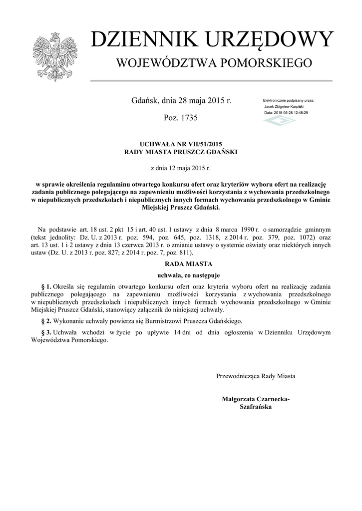 DZIENNIK URZĘDOWY WOJEWÓDZTWA POMORSKIEGO Gdańsk, dnia 28 maja 2015 r. Elektronicznie podpisany przez: Jacek Zbigniew Karpiński Data: 2015-05-28 12:46:29 Poz. 1735 UCHWAŁA NR VII/51/2015 RADY MIASTA PRUSZCZ GDAŃSKI z dnia 12 maja 2015 r. w sprawie określenia regulaminu otwartego konkursu ofert oraz kryteriów wyboru ofert na realizację zadania publicznego polegającego na zapewnieniu możliwości korzystania z wychowania przedszkolnego w niepublicznych przedszkolach i niepublicznych innych formach wychowania przedszkolnego w Gminie Miejskiej Pruszcz Gdański. Na podstawie art. 18 ust. 2 pkt 15 i art. 40 ust. 1 ustawy z dnia 8 marca 1990 r. o samorządzie gminnym (tekst jednolity: Dz. U. z 2013 r. poz. 594, poz. 645, poz. 1318, z 2014 r. poz. 379, poz. 1072) oraz art. 13 ust. 1 i 2 ustawy z dnia 13 czerwca 2013 r. o zmianie ustawy o systemie oświaty oraz niektórych innych ustaw (Dz. U. z 2013 r. poz. 827; z 2014 r. poz. 7, poz. 811). RADA MIASTA uchwala, co następuje § 1. Określa się regulamin otwartego konkursu ofert oraz kryteria wyboru ofert na realizację zadania publicznego polegającego na zapewnieniu możliwości korzystania z wychowania przedszkolnego w niepublicznych przedszkolach i niepublicznych innych formach wychowania przedszkolnego w Gminie Miejskiej Pruszcz Gdański, stanowiący załącznik do niniejszej uchwały. § 2. Wykonanie uchwały powierza się Burmistrzowi Pruszcza Gdańskiego. § 3. Uchwała wchodzi w życie po upływie 14 dni od dnia ogłoszenia w Dzienniku Urzędowym Województwa Pomorskiego. Przewodnicząca Rady Miasta Małgorzata CzarneckaSzafrańska Dziennik Urzędowy Województwa Pomorskiego –2– Poz. 1735 _______________________________________________________________________________________________________________ Załącznik do Uchwały Nr VII/51/2015 Rady Miasta Pruszcz Gdański z dnia 12 maja 2015 r. Regulamin otwartego konkursu ofert na realizację zadania publicznego polegającego na zapewnieniu możliwości korzystania z wychowania przedszkolnego w niepublicznych przedszkolach i niepublicznych innych formach wychowania przedszkolnego w Gminie Miejskiej Pruszcz Gdański. §1 Regulamin otwartego konkursu ofert na realizację zadania polegającego na zapewnieniu możliwości korzystania z wychowania przedszkolnego w niepublicznych przedszkolach i niepublicznych innych formach wychowania przedszkolnego w Gminie Miejskiej Pruszcz Gdański, zwany dalej „regulaminem”, określa tryb przeprowadzania otwartych konkursów ofert mających na celu wyłonienie niepublicznych przedszkoli lub niepublicznych innych form wychowania przedszkolnego, które będą realizowały zadanie organizacji wychowania przedszkolnego na zlecenie Gminy Miejskiej Pruszcz Gdański. § 2. Ilekroć w regulaminie jest mowa o: 1) ustawie – rozumie się przez to ustawę z dnia 7 września 1991 r. o systemie oświaty (tekst jednolity Dz. U. z 2004 r. Nr 256, poz. 2572), 2) ustawie zmieniającej – rozumie się przez to ustawę z dnia 13 czerwca 2013 r. o zmianie ustawy o systemie oświaty oraz niektórych innych ustaw (Dz. U. z 2013 r. poz. 827 z późn. zm.), 3) gminie – rozumie się przez to Gminę Miejską Pruszcz Gdański , 4) burmistrzu – rozumie się przez to Burmistrza Pruszcza Gdańskiego, 5) radzie – rozumie się przez to Radę Miasta Pruszcz Gdański, 6) konkursie – rozumie się przez to otwarty konkurs ofert, o którym mowa w art. 13 ust. 1 ustawy zmieniającej, 7) przedszkolu – rozumie się przez to niepubliczne przedszkole lub niepubliczną inną formę wychowania przedszkolnego, o której mowa w art. 14a ust. 1a ustawy, 8) zadaniu – rozumie się przez to zadanie publiczne polegające na zapewnieniu możliwości korzystania z wychowania przedszkolnego w przedszkolu. § 3. 1. Burmistrz zamierzający powierzyć realizację zadania, ogłasza konkurs. 2. Uprawnionymi do przystąpienia do konkursu są podmioty prowadzące przedszkola, na terenie gminy. § 4. 1. Ogłoszenie o konkursie powinno zawierać informacje o: 1) rodzaju zadania, 2) wysokości środków publicznych przeznaczonych na realizację zadania, w tym o planowanej wysokości dotacji na jedno dziecko objęte wychowaniem przedszkolnym, która będzie przysługiwała podmiotom realizującym zadanie, 3) zasadach przyznawania dotacji, 4) terminach i warunkach realizacji zadania, 5) sposobie i terminach składania ofert, 6) trybie i kryteriach stosowanych przy wyborze ofert oraz terminie dokonania wyboru ofert, 7) zrealizowanych przez gminę w roku ogłoszenia konkursu i w roku poprzednim zadaniach tego samego rodzaju i związanych z nimi kosztami. 2. Konkurs ogłasza się: Dziennik Urzędowy Województwa Pomorskiego –3– Poz. 1735 _______________________________________________________________________________________________________________ 1) w Biuletynie Informacji Publicznej gminy, 2) w siedzibie gminy, 3) na stronie internetowej gminy. 3. Ogłoszenie o konkursie można zamieścić w lokalnych mediach. § 5. 1. Oferta na realizację zadania składana w konkursie, zwana dalej „ofertą”, zawiera w szczególności: 1) dane dotyczące podmiotu prowadzącego przedszkole, wskazane w ogłoszeniu o konkursie, w tym kopia zaświadczenia o wpisie do ewidencji szkół i placówek niepublicznych prowadzonych przez Burmistrza Pruszcza Gdańskiego, 2) lokalizację i adres prowadzonego przedszkola, 3) informację o liczbie dzieci, jaką przedszkole planuje przyjąć w trybie rekrutacji prowadzonej w oparciu o zasadę powszechnej dostępności na dany rok szkolny, 4) szczegółowy opis lokalu, w którym prowadzone jest przedszkole wraz z wyszczególnieniem wyposażenia pomieszczeń (w tym kserokopie dokumentów potwierdzających aktualne przeglądy obiektu), 5) opis posiadanego placu zabaw przed budynkiem przedszkola, 6) zdjęcia budynku, placu zabaw i poszczególnych pomieszczeń przedszkola, 7) plan organizacji pracy przedszkola w planowanym okresie realizacji zadania, w tym: a) planowaną li