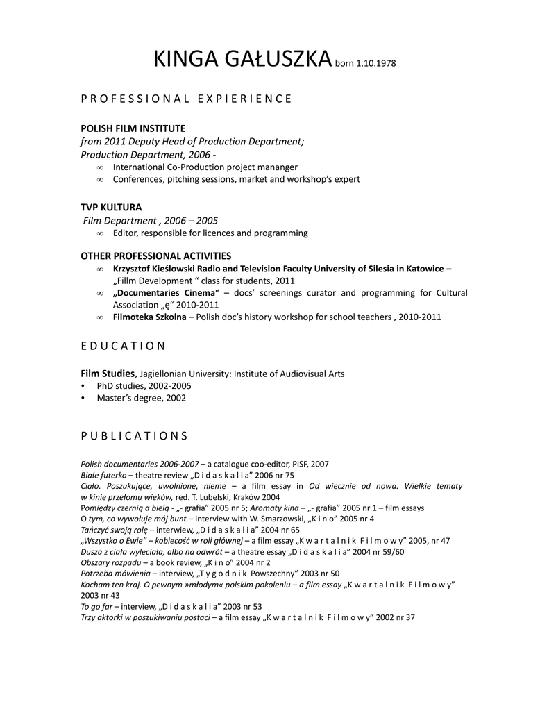 KINGA GAŁUSZKA born 1.10.1978 PROFESSIONAL EXPIERIENCE POLISH FILM INSTITUTE from 2011 Deputy Head of Production Department; Production Department, 2006 • • International Co-Production project mananger Conferences, pitching sessions, market and workshop’s expert TVP KULTURA Film Department , 2006 – 2005 • Editor, responsible for licences and programming OTHER PROFESSIONAL ACTIVITIES • • • Krzysztof Kieślowski Radio and Television Faculty University of Silesia in Katowice – „Fillm Development “ class for students, 2011 „Documentaries Cinema“ – docs’ screenings curator and programming for Cultural Association „ę“ 2010-2011 Filmoteka Szkolna – Polish doc’s history workshop for school teachers , 2010-2011 EDUCATION Film Studies, Jagiellonian University: Institute of Audiovisual Arts PhD studies, 2002-2005 Master’s degree, 2002 PUBLICATIONS Polish documentaries 2006-2007 – a catalogue coo-editor, PISF, 2007 Białe futerko – theatre review „D i d a s k a l i a” 2006 nr 75 Ciało. Poszukujące, uwolnione, nieme – a film essay in Od wiecznie od nowa. Wielkie tematy w kinie przełomu wieków, red. T. Lubelski, Kraków 2004 Pomiędzy czernią a bielą - „- grafia” 2005 nr 5; Aromaty kina – „- grafia” 2005 nr 1 – film essays O tym, co wywołuje mój bunt – interview with W. Smarzowski, „K i n o” 2005 nr 4 Tańczyć swoją rolę – interwiew, „D i d a s k a l i a” 2004 nr 65 „Wszystko o Ewie” – kobiecość w roli głównej – a film essay „K w a r t a l n i k F i l m o w y” 2005, nr 47 Dusza z ciała wyleciała, albo na odwrót – a theatre essay „D i d a s k a l i a” 2004 nr 59/60 Obszary rozpadu – a book review, „K i n o” 2004 nr 2 Potrzeba mówienia – interview, „T y g o d n i k Powszechny” 2003 nr 50 Kocham ten kraj. O pewnym »młodym« polskim pokoleniu – a film essay „K w a r t a l n i k F i l m o w y” 2003 nr 43 To go far – interview, „D i d a s k a l i a” 2003 nr 53 Trzy aktorki w poszukiwaniu postaci – a film essay „K w a r t a l n i k F i l m o w y” 2002 nr 37