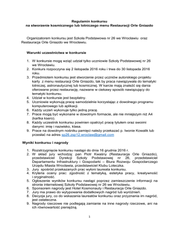 Regulamin konkursu na stworzenie kosmicznego lub lotniczego menu Restauracji Orle Gniazdo Organizatorem konkursu jest Szkoła Podstawowa nr 26 we Wrocławiu oraz Restauracja Orle Gniazdo we Wrocławiu. Warunki uczestnictwa w konkursie 1. W konkursie mogą wziąć udział tylko uczniowie Szkoły Podstawowej nr 26 we Wrocławiu. 2. Konkurs rozpoczyna się 2 listopada 2016 roku i trwa do 30 listopada 2016 roku. 3. Przedmiotem konkursu jest stworzenie przez uczniów autorskiego projektu karty z menu restauracji Orle Gniazdo, tak by praca nawiązywała do tematyki lotniczej, astronautycznej lub kosmicznej. W karcie mają znaleźć się dania oferowane przez restaurację, nazwane w ciekawy sposób nawiązujący do tematyki konkursu. 4. Udział w konkursie jest bezpłatny. 5. Uczniowie wykonują pracę samodzielnie korzystając z dowolnego programu komputerowego lub aplikacji. 6. Każdy uczeń wykonuje tylko jedną pracę. 7. Prace mogą być wykonane w dowolnym formacie, ale nie mniejszym niż A4 (kartka ksero). 8. Każdy uczestnik konkursu powinien opatrzyć pracę tytułem oraz swoimi danymi: imię i nazwisko, klasa. 9. Prace na dowolnym nośniku pamięci należy przekazać p. Iwonie Kowalik lub przesłać na adres [email protected] Wyniki konkursu i nagrody 1. Rozstrzygnięcie konkursu nastąpi do dnia 16 grudnia 2016 r. 2. W skład jury wchodzą: pan Piotr Kwaśny (Restauracja Orle Gniazdo), przedstawiciel Dyrekcji Szkoły Podstawowej nr 26, przedstawiciel Departamentu Infrastruktury i Gospodarki – Biura Rozwoju Gospodarczego Urzędu Miasta Wrocławia, przedstawiciel Klubu Loteczka. 3. Jury spośród przekazanych prac wyłoni laureata konkursu. 4. Kryteria oceny prac: zgodność z tematyką, estetyka pracy, kreatywność i oryginalność. 5. Ogłoszenie wyników konkursu nastąpi poprzez zamieszczenie informacji na stronie internetowej Szkoły Podstawowej nr 26 we Wrocławiu. 6. Sponsorem nagrody jest Hotel Kosmonauty i Restauracja Orle Gniazdo. 7. Jury ma prawo do wytypowania dodatkowych nagród lub wyróżnień. 8. Decyzja jury, co do wskazania laureatów konkursu oraz przyznania im nagród, jest ostateczna. 9. Nagrody rzeczowe nie podlegają zamianie na inne nagrody rzeczowe, ani na ich równowartość pieniężną. 1 Postanowienia końcowe: 1. Przekazując pracę na konkurs, uczestnik zgadza się na wykorzystanie pomysłu do realizacji w bieżącej karcie menu Restauracji oraz ekspozycję pracy na stronie www.zsp12wroclaw.edupage.org i www.restauracjaorlegniazdo.pl oraz na opublikowanie fotografii prac na stronach internetowych szkoły i restauracji (Załącznik nr 1). 2. Biorąc udział w konkursie, uczestnik akceptuje jego regulamin i wyraża zgodę na użyczenie wizerunku poprzez zamieszczenie zdjęć na stronach internetowych organizatorów konkursu (Załącznik nr 1). 2 Załącznik nr 1 …………………………………………… …………………………………………… imię i nazwisko uczestnika konkursu Oświadczenie rodziców/opiekunów prawnych uczestników konkursu na stworzenie kosmicznego lub lotniczego menu Restauracji Orle Gniazdo Wyrażam zgodę na przetwarzanie danych osobowych mojego dziecka …………………………………………………………………………………………………. użyczenie jego wizerunku w wypadku publikacji zdjęć na stronach organizatorów konkursu na stworzenie kosmicznego lub lotniczego menu Restauracji Orle Gniazdo oraz publikowanie i nieodpłatne wykorzystanie całości lub fragmentu jego pracy konkursowej przez organizatorów konkursu. ………………………………………… ………………………………………………. miejscowość, data czytelny podpis rodzica/opiekuna prawnego 3