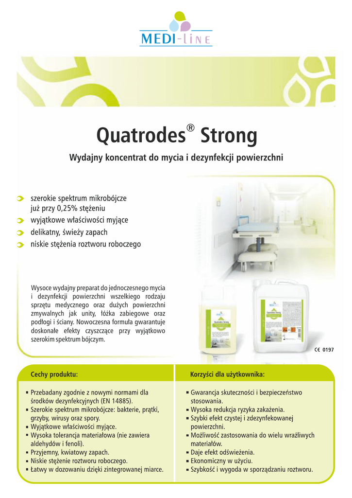 ® Quatrodes Strong Wysoce wydajny preparat do jednoczesnego mycia i dezynfekcji powierzchni wszelkiego rodzaju sprzętu medycznego oraz dużych powierzchni zmywalnych jak unity, łóżka zabiegowe oraz podłogi i ściany. Nowoczesna formuła gwarantuje doskonałe efekty czyszczące przy wyjątkowo szerokim spektrum bójczym. Quatrodes® Strong Zastosowanie: Quatrodes® Strong to wysoce wydajny preparat do jednoczesnego mycia i dezynfekcji powierzchni wszelkiego rodzaju sprzętu medycznego oraz dużych powierzchni zmywalnych jak unity, łóżka zabiegowe oraz podłogi i ściany. Nowoczesna formuła gwarantuje doskonałe efekty czyszczące przy wyjątkowo szerokim spektrum bójczym. Nie zawiera aldehydów i fenoli dzięki czemu może być stosowany w obecności pacjentów. Zalecany do powierzchni ze szkła akrylowego ze względu na dobrą tolerancję materiałową. Roztwór preparatu posiada przyjemny zapach. Może być stosowany do powierzchni mających kontakt z żywnością. Aktywność nieskażonego oraz używanego roztworu roboczego wynosi 14 dni. Bakterie (w tym MRSA, Legionella, Klebsiella) Grzyby i drożdżaki Prątki gruźlicy (M. terrae, M. avium) Wirus BVDV, HCV Wirus Vaccinia, HBV, HIV Wirus Adeno Wirus Polio Spory Badania dla warunków brudnych. *Tylko warunki czyste Tabela dozowania środka Stężenie Proporcje koncentratu do wody Ilość koncentratu w ml Ilość wody w ml 2% 1% 0,5% 20 10 5 980 990 995 Data opracowania: 11.2012 0,25% 2,5 997,5
