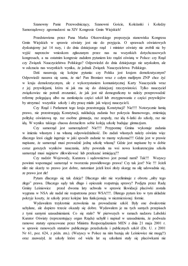 Szanowny Panie Przewodniczący, Szanowni Goście, Samorządowcy zgromadzeni na XIV Kongresie Gmin Wiejskich! Koleżanki i Koledzy Przedstawiona przez Pana Marka Olszewskiego propozycja stanowiska Kongresu Gmin Wiejskich w sprawie oświaty jest nie do przyjęcia. O sprawach oświatowych dyskutujemy już 14 razy, i do dnia dzisiejszego rząd i minister oświaty nie zrobili nic by wyjść naprzeciw wnioskom zgłaszanym przez nas na wszystkich dotychczasowych kongresach, a na ostatnim kongresie zadałem pytaniem kto rządzi oświatą w Polsce: czy Rząd czy Związek Nauczycielstwa Polskiego? Odpowiedzi do dnia dzisiejszego nie uzyskałem, ale w odczuciu nas wszystkich wynika, że jednak Związek Nauczycielstwa Polskiego. Dziś nasuwają się kolejne pytania: czy Polska jest krajem demokratycznym? Odpowiedź nasuwa się sama, że nie! Pan Broniarz wraz z całym mafijnym ZNP chce żyć w kraju demokratycznym, ale z wykorzystaniem komunistycznej Karty Nauczyciela wraz z jej przywilejami, która ni jak ma się do dzisiejszej rzeczywistości. Tylko nauczyciel związkowiec nie potrafi zrozumieć, że jak jest niż demograficzny to należy przeprowadzić reformę polegającą albo na zamknięciu części szkół lub zrezygnowaniu z części przywilejów by utrzymać wszystkie szkoły i aby pracę miało jak więcej nauczycieli. Czy Rząd i Parlament tego kraju przestrzegają Konstytucji? Nie!!!! Notorycznie łamią prawo, nie przestrzegają Konstytucji, nakładają zadania bez pokrycia finansowego, zmieniają politykę oświatową np. raz osobne gimnazja, raz zespoły, raz idą 6-latki do szkoły, raz nie idą. W wyniku takiego chaosu dorzuciłem sobie koleją szkołę budując gimnazjum. Czy samorząd jest samorządem? Nie!!!! Przypomnę Gmina wykonuje zadania w imieniu własnym i na własną odpowiedzialność. Do zadań własnych należy oświata więc dlaczego ktoś ciągle ingeruje w jaki sposób zadanie to mamy wykonać!!! Gdzie jest w prawie napisane, że samorząd musi prowadzić jedną szkołę własną? Gdzie jest napisane by w dobie coraz gorszych wyników nauczania, żeby powstała na wsi nowa konkurencyjna szkoła samorząd musi najpierw zlikwidować lub przekazać istniejącą?? Czy nadzór Wojewody, Kuratora i sądownictwo jest ponad nami? Tak!!! Wszyscy powinni wspomagać samorząd w tworzeniu prawidłowego prawa! Czy tak jest? Nie !!! Jeżeli nikt nie skarży to prawo jest dobre, natomiast jeżeli ktoś złoży skargę na siłę udowadnia się, ze prawo jest złe! Pytam dlaczego się tak dzieje? Dlaczego nikt nie wyeliminuje z obrotu „niby tego złego” prawa. Dlaczego sądy tak długo i opieszale rozpatrują sprawy? Podjęta przez Radę Gminy Leśniowice przed dwoma laty uchwała w sprawie likwidacji placówki została wygrana w NSA ale nadal nie rozpatrzona przez WSA!!!!. Dlatego pytam kto w tym układzie pokryje koszty, że szkoły przez kolejne lata funkcjonują w niezmienionej formie. Wydawałem trzykrotnie zezwolenia na prowadzenie szkół. Były one dwukrotnie uchylane, ale dopiero trzecie okazały się dobre. Wydawałem je na tych samych przepisach z tymi samymi uzasadnieniami. Co się stało? W pierwszych w ramach nadzoru Lubelski Kurator Oświaty (reprezentujący organ Rządu) uchylił i napisał w uzasadnieniu, że podważa ramowe statuty opracowane przez Ministra Rozporządzeniem MEN z dnia 21 maja 2001 r. w sprawie ramowych statutów publicznego przedszkola i publicznych szkół (Dz. U. z 2001 Nr 61, poz. 624, z późn. zm.). (Wszyscy w Polsce na nim bazują ale Leśniowice nie mogą!!) oraz zauważył, że szkoły które od wielu lat są szkołami stały się placówkami nie spełniającymi bezpieczeństwa uczniom. W drugich decyzjach Kurator dalej zabawia się w „kotka i myszkę” i znajduje kolejne błędy w ramowych statutach i nadal twierdzi, że szkoły są niebezpieczne. Trzecie decyzje cudem stają się dobre bo Kurator dokształcił się w przepisach prawa. Zrozumiał kto jest stroną i odmówił ZNP uchylenia decyzji ze względu na to, że nie są stroną postępowania i pouczył ich żeby odczepili się od dobrze funkcjonującej oświaty w gminie Leśniowice. Ale wkroczył niedokształcony Minister, który pomimo roku dalej nie wie co zrobić z drugimi decyzjami pomimo upływy prawie roku czasu. Czy warto było ratować szkoły? Nie wiem !!!! Zgubiłem się, bo nie wiem już ile miałem przeprowadzonych dotychczas różnorodnych kontroli zakresie oświaty. Wielokrotnie kontrolowany byłem przez SANEPID, Państwową Straż Pożarną, Państwową Inspekcje Pracy (różnych szczebli), Policję, Prokuraturę, Kuratorium (wielokrotnie), Regionalną Izbę Obrachunkową oraz Najwyższą Izbę Kontroli (nie ma jeszcze wyniku). Dyskutowali o nas bez nas w Komisji Sejmowej i Sejmie i co? i nic! Najgorzej, że z funkcjonowania wszystkich szkół w gminie Leśniowice zadowoleni są mieszkańcy, a przeszkadza to Panu Broniarzowi i jego Związkowi. Cały czas jest mowa o nas w prasie, radiu i telewizji. Jestem ulubieńcem Pana Broniarza i jego Związku, który najlepiej chciałby mnie zamknąć w więzieniu, odwołać mnie i organy gminy, Wicekuratora, Kuratora, Wojewodę, a ostatnio Panów Ministrów tylko jak dotychczas nieskutecznie, a wszystko w imię obrony Karty Nauczyciela i jej przywilejów, ale czy w imię hasła „Ratowania szkół”. Na zakończenie chcę zapewnić, że samorządom zależy na istnieniu dobrych szkół, przyjaznych dla dzieci, dobrze prowadzących proces edukacyjno-wychowawczy, dobrych nauczycielach oraz na pracy dla nauczycieli. Nie jesteśmy wrogami oświaty! Wiem jak to zrobić! Ale trzeba zaufać samorządowi. Szanowni zgromadzeni chciałem zwrócić uwagę jak traktowany jest samorząd, który postanowił uratować funkcjonowanie wszystkich szkół. Panie Przewodniczący mówił Pan o innych problemach funkcjonowania samorządów i ich traktowania przez Rząd, nakładania zadań bez zapewnienia środków finansowanych. Może przysze