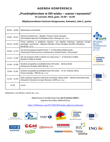 AGENDA KONFERENCJI „Przedsiębiorstwo w XXI wieku – szanse i wyzwania” 14 czerwiec 2016, godz. 10.00 – 14.00 Międzynarodowe Centrum Kongresowe, Katowice, Sala C, parter 09.30 – 10.00 Rejestracja uczestników 10.00 – 10.10 Otwarcie konferencji – Bogdan Traczyk, Prezes Zarządu, Górnośląska Agencja Przedsiębiorczości i Rozwoju sp. z o.o. 10.10 – 10.40 Firma rodzinna, a problemy sukcesji i jej aspekty (sukcesja, najemny zarząd, patologie, wyzwania) – Zbigniew Mendel, Prezes Zarządu, Dyrektor Handlowy, Gerda Sp. z o.o. 10.40 – 11.10 Czy warto budować kapitał marki ? - dr Mirosława Malinowska, Uniwersytet Ekonomiczny w Katowicach, Katedra Rynku i Konsumpcji 11:10 – 11.40 Jak nie przegrać walki o talenty na rynku pracy ? - dr Kazimierz Sedlak, Dyrektor Sedlak & Sedlak 11.40 – 12.00 Studium przypadku przedsiębiorstwa XXI wieku - Bartosz Bród, Wiceprezes Zarządu, Reha-Bed Sp. z o.o. 12.00 - 12.20 Studium przypadku przedsiębiorstwa XXI wieku - dr inż. Andreas Glenz, Prezes Zarządu, PREVAC sp. z o.o. 12.20 – 12.50 Gala rozdania nagród w konkursie Innowator Śląska 2015 – Adriana Kamińska-Flak, Menedżer Enterprise Europe Network, GAPR sp. z o.o. 12.50 Lunch Moderator: Luk Palmen, InnoCo Sp. z o.o. Rejestracja na konferencję trwa do 8 czerwca 2016 r. poprzez formularz elektroniczny: https://b2bharmo.com/INTARG2016/index.php/en/conference