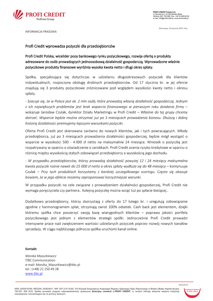 PROFI CREDIT Polska S.A. ul. Browarna 2, 43-300 Bielsko-Biała Infolinia: 801 700 999, Fax: +48 33 499 60 06 e-mail: [email protected], www.proficredit.pl Warszawa, 16 stycznia 2017 roku INFORMACJA PRASOWA Profi Credit wprowadza pożyczki dla przedsiębiorców Profi Credit Polska, wicelider poza bankowego rynku pożyczkowego, rozwija ofertę o produkty adresowane do osób prowadzących jednoosobową działalność gospodarczą. Wprowadzone właśnie pożyczkowe produkty finansowe wyróżnia wysoka kwota netto i długi okres spłaty. Spółka, specjalizująca się dotychczas w udzielaniu długookresowych pożyczek dla klientów indywidualnych, rozpoczyna obsługę drobnych przedsiębiorców. Od 17 stycznia br. w jej ofercie znajdują się 3 produkty pożyczkowe zróżnicowane pod względem wysokości kwoty netto i okresu spłaty. - Szacuje się, że w Polsce jest ok. 2 mln osób, które prowadzą własną działalność gospodarczą. Jednym z ich największych problemów jest brak wsparcia finansowego w pierwszym roku działania firmy – wskazuje Jarosław Czulak, dyrektor Działu Marketingu w Profi Credit – Właśnie do tej grupy chcemy dotrzeć. Wsparcie będzie można otrzymać już po 3 miesiącach prowadzenia biznesu. Dłuższą i dobrą historię działalności premiujemy lepszymi warunkami pożyczki. Oferta Profi Credit jest skierowana zarówno do nowych klientów, jak i tych powracających. Młody przedsiębiorca, już po 3 miesiącach prowadzenia działalności gospodarczej, będzie mógł wystąpić o wsparcie w wysokości 500 - 4 000 zł netto na maksymalnie 24 miesiące. Wniosek o pożyczkę jest rozpatrywany w oparciu o oświadczenie o zarobkach. Profi Credit ocenia ryzyko kredytowe w oparciu o różnicę między wysokością stałych zobowiązań przedsiębiorcy a wysokością jego dochodu. - W przypadku przedsiębiorców, którzy prowadzą działalność powyżej 12 i 24 miesięcy maksymalna kwota pożyczki rośnie nawet do 25 000 zł netto a okres spłaty wydłuża się do 48 miesięcy – kontynuuje Czulak – Przy tych produktach korzystamy z bardziej szczegółowego scoringu. Często się okazuje bowiem, że w jego efekcie możemy zaproponować korzystniejsze warunki. W przypadku pożyczki na cele związane z prowadzeniem działalności gospodarczej, Profi Credit nie wymaga poręczyciela czy partnera.. Kolejną pożyczkę można wziąć tuż po spłacie bieżącej.. Dodatkowo przedsiębiorcy, którzy skorzystają z oferty do 17 lutego br. i uregulują zobowiązanie zgodnie z harmonogramem spłat, otrzymają zwrot 100% odsetek. Cash back jest elementem, dzięki któremu spółka chce poszerzyć swoją bazę wiarygodnych klientów – poprawa jakości portfela pożyczkowego jest jednym z elementów strategii spółki. Jednocześnie Profi Credit prowadzi intensywne prace nad zwiększeniem wartości udzielanych pożyczek poprzez rozwój nowych kanałów sprzedaży. W ciągu najbliższego półrocza spółka uruchomi kanał online. Kontakt: Monika Mazurkiewicz ITBC Communication e-mail: [email protected] tel.: (+48) 22 250 49 28 www.itbc.pl Strona 1 z 2 KRS: 0000518190, REGON: 243624011, NIP: 547-215-10-80, VIII Wydział Gospodarczy Krajowego Rejestru Sądowego Sądu Rejonowego w Bielsku-Białej; Kapitał akcyjny 793 951 000 PLN. Spółka prowadzi program odpowiedzialności społecznej Dziecięcy uśmiech z PROFI CREDIT, w ramach którego aktywnie wspiera instytucje charytatywne, koncentrujące się na pomocy dzieciom. PROFI CREDIT Polska S.A. ul. Browarna 2, 43-300 Bielsko-Biała Infolinia: 801 700 999, Fax: +48 33 499 60 06 e-mail: [email protected], www.proficredit.pl Jarosław Czulak Dyrektor Działu Marketingu Profi Credit Polska S.A. Tel.: +48 33 499 52 41 E-mail: [email protected] Profi Credit Polska Spółka działa na polskim rynku pożyczkowym od 2004 roku. Pod względem udziału jest drugą największą firmą pożyczkową w Polsce. Specjalizuje się w udzielaniu ratalnych pożyczek długoterminowych zarówno dla klienta detalicznego, jak i przedsiębiorców. Wyróżnia się wysokimi kwotami pożyczek (średnio jest to 10 tys. PLN) udzielanymi na okres powyżej 36 miesięcy. Jako jedna z nielicznych realizując oczekiwania 88% pożyczkobiorców, prowadzi sprzedaż poprzez sieć tradycyjnych oddziałów stacjonarnych oraz profesjonalnych doradców finansowych. Rozwija także telefoniczne centrum obsługi oraz kanał online. Spółka należy do międzynarodowej grupy finansowej Profireal Group SE, działającej od 1994 w regionie Europy Środkowo-Wschodniej. W 2015 r. Grupa udzieliła pożyczek o łącznej wartości 391 mln EUR, w tym Profi Credit Polska 137 mln EUR. Profireal Group SE Profireal Group SE tworzą spółki wyspecjalizowane w udzielaniu pożyczek konsumenckich oraz biznesowych, stanowiących alternatywę dla kredytów bankowych. Grupa działa w Polsce, Czechach, Słowacji, Bułgarii i Rosji. Jej plany obejmują rozwój silnej pozycji w regionie CEE i ekspansję na rynku azjatyckim i południowoamerykańskim. Strona 2 z 2 KRS: 0000518190, REGON: 243624011, NIP: 547-215-10-80, VIII Wydział Gospodarczy Krajowego Rejestru Sądowego Sądu Rejonowego w Bielsku-Białej; Kapitał akcyjny 793 951 000 PLN. Spółka prowadzi program odpowiedzialności społecznej Dziecięcy uśmiech z PROFI CREDIT, w ramach którego aktywnie wspiera instytucje charytatywne, koncentrujące się na pomocy dzieciom.