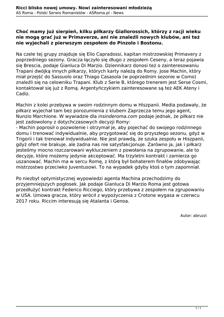Ricci blisko nowej umowy. Nowi zainteresowani młodzieżą AS Roma - Polski Serwis Romanistów - ASRoma.pl - News Choć mamy już sierpień, kilku piłkarzy Giallorossich, którzy z racji wieku nie mogą grać już w Primaverze, ani nie znaleźli nowych klubów, ani też nie wyjechali z pierwszym zespołem do Pinzolo i Bostonu. Na czele tej grupy znajduje się Elio Capradossi, kapitan mistrzowskiej Primavery z poprzedniego sezony. Gracza łączyło się długo z zespołem Ceseny, a teraz pojawia się Brescia, podaje Gianluca Di Marzio. Dziennikarz donosi też o zainteresowaniu Trapani dwójką innych piłkarzy, których karty należą do Romy. Jose Machin, który miał przejść do Sassuolo oraz Thiago Casasola (w poprzednim sezonie w Como) znaleźli się na celowniku Trapani. Klub z Serie B, którego trenerem jest Serse Cosmi, kontaktował się już z Romą. Argentyńczykiem zainteresowane są też AEK Ateny i Cadiz. Machin z kolei przebywa w swoim rodzinnym domu w Hiszpanii. Media podawały, że piłkarz wyjechał tam bez porozumienia z klubem Zaprzecza temu jego agent, Nunzio Marchione. W wywiadzie dla insinderoma.com podaje jednak, że piłkarz nie jest zadowolony z dotychczasowych decyzji Romy: - Machin poprosił o pozwolenie i otrzymał je, aby pojechać do swojego rodzinnego domu i trenować indywidualnie, aby przygotować się do przyszłego sezonu, gdyż w Trigorii i tak trenował indywidualnie. Nie jest prawdą, że szuka zespołu w Hiszpanii, gdyż ofert nie brakuje, ale żadna nas nie satysfakcjonuje. Zarówno ja, jak i piłkarz jesteśmy mocno rozczarowani wykluczeniem z powołania na zgrupowanie, ale to decyzje, które możemy jedynie akceptować. Ma trzyletni kontrakt i zamierza go uszanować. Machin ma w sercu Romę, z którą był bohaterem finałów zdobywając mistrzostwo przeciwko Juventusowi. To na wypadek gdyby ktoś o tym zapomniał. Po niezbyt optymistycznej wypowiedzi agenta Machina przechodzimy do przyjemniejszych pogłosek. Jak podaje Gianluca Di Marzio Roma jest gotowa przedłużyć kontrakt Federico Ricciego, który przebywa z zespołem na zgrupowaniu w USA. Umowa gracza, który wrócił z wypożyczenia z Crotone wygasa w czerwcu 2017 roku. Riccim interesują się Atalanta i Genoa. Autor: abruzzi 1/1 Powered by TCPDF (www.tcpdf.org)