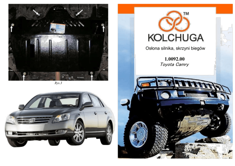 Osłona silnika, skrzyni biegów 1.0092.00 Toyota Camry Rys.3 Osłona 1.0092.00 Montaż osłony Stosowanie: Camry Liczba cylindrów Modyfikacje Camry - Moc KM Skrzynia biegów - Pojemność silnika cm3 - - Kompletność: L.p. Nazwa 1 2 3 4 5 6 7 8 Osłona Nakrętka Amortyzator 30 Śruba Śruba Podkładka Podkładka Oparcie Oznaczenie Liczba 1.0092.00 М10 М10х100 М6х18 А6 А 10 1 4 4 4 2 2 8 4 Uwagi Н=20mm Schemat montażu osłony 5 6 2 4 7 8 Rys.1 1. Zdjąć dwie spinki w centralnej części osłony plastikowej. 2. Przystawić osłonę, włożyć śruby 4 z nakrętkami 2 przez oparcia 8 w przelotowe boczne otwory ramy pomocniczej silnika, rys.1. 3. Osłonę plastikową zamocować nad osłoną stalową śrubami 5. 4. Dokręcić wszystkie miejsca mocowania. 1 3 2 4 7 8 Rys.2
