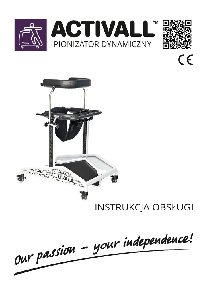 ACTIVALL ™ PIONIZATOR DYNAMICZNY INSTRUKCJA OBSŁUGI R 5 903240 632473 UWAGA! Producent ponosi odpowiedzialność za właściwe funkcjonowanie sprzętu wyłącznie w wypadku jego zakupu u wykwalifikowanego pracownika firmy Akces-MED sp. z o.o. lub w wyspecjalizowanym sklepie medycznym! UWAGA! AKCES-MED Sp. z o.o. zastrzega sobie prawo do wprowadzania zmian technicznych i handlowych w treści instrukcji bez wcześniejszego uprzedzenia. Wyrób medyczny klasy I zgodny z Dyrektywą 93/42/EWG Parlamentu Europejskiego i Rady w sprawie wyrobów medycznych oraz z ustawą z dnia 20 maja 2010 r. o wyrobach medycznych (Dz.U. z 2010 r,Nr 107, poz. 679). Na wyrób producent wystawił stosowaną deklarację zgodności. Oznaczenie producenta w Urzędzie Rejestracji Produktów Leczniczych, Wyrobów Medycznych i Produktów Biobójczych: PL/CA01 04088/W Firma Akces-Med Sp. z o.o. wdrożyła system zarządzania jakością zgodny z normą ISO 13485 w zakresie projektowania całości produkcji, sprzedaży i serwisu. System certyfikowany przez Det Norske Veritas. ACTIVALL SPIS TREŚCI 1. Przeznaczenie instrukcji........................................................................................5 2. Wskazania do stosowania wyrobu.......................................................................5 3. Ogólna budowa pionizatora ................................................................................6 3.1 Wyposażenie standardowe.......................................................................6 3.2 Wyposażenie ponadstandardowe............................................................7 4. Tabela wymiarowa.................................................................................................9 5. Opis montażu pionzatora ..................................................................................10 6. Opis obsługi pionizatora.....................................................................................14 7. Nauka chodzenia.................................................................................................18 8. Wyposażenie ponadstandardowe.....................................................................20 9. Użytkowanie wyrobu...........................................................................................27 9.1 Przygotowanie pacjenta............................................................................27 9.2 Instrukcja użytkowania pionizatora........................................................28 9.3 Pionizacja....................................................................................................29 10. Zasady bezpieczeństwa....................................................................................31 11. Konserwacja i czyszczenie ...............................................................................34 : www.akces-med.com ' +48 17 864 04 70 * [email protected] ACTIVALL WSTĘP Pionizator ACTIVALL™ jest szczególnie doceniany w codziennej rehabilitacji pacjentów zarówno w warunkach domowych jak i szpitalnych. Urządzenie pozwala na pełną pionizację pacjenta dzięki zastosowaniu stabilizatora kończyn dolnych. Umożliwia także samodzielne swobodne przemieszczanie się, a separator stóp zapobiega krzyżowaniu się nóg. Dzięki pracy z pionizatorem ACTIVALL™ dzieci mogą stawiać swoje pierwsze kroki, a osoby starsze utrzymywać lub stopniowo odzyskiwać utraconą sprawność. Lekka i bardzo stabilna podstawa pozwala na łatwe, samodzielne przemieszczanie się przy niewielkim zaangażowaniu sił. Dobre dopasowanie obejm z bezpiecznym zamknięciem, daje poczucie bezpieczeństwa i swobodę wykonywanych ruchów. Szeroka gama rozmiarowa sprawa, że urządzenie to znajduje odbiorców o różnym wzroście i wieku. Pozwala użytkownikom zdobywać nowe doświadczenia i prowadzić w miarę możliwości, samodzielne i niezależne życie. Prosimy o uważne przeczytanie tej instrukcji. Znajdziecie w niej Państwo informacje o naszym produkcie oraz dowiecie się, jak bezpiecznie i efektywnie z niego korzystać. Jeśli macie Państwo pytania lub uwagi skontaktujcie się z doradcą medycznym naszej firmy (tel. 0508 382 509) lub bezpośrednio z AKCES-MED Sp. z o.o. (tel. 0-17 864 04 70). Dziękujemy za zakup produktu naszej firmy. UWAGA! Przed przystąpieniem do użytkowania wyrobu, użytkownik jest zobowiązany do zaznajomienia się z niniejszą instrukcją obsługi. Prosimy pamiętać, że stosowanie się do wskazówek zawartych w tej instrukcji pozwoli na bezpieczne korzystanie z wyrobu, przedłuży jego trwałość oraz estetykę. 4 : www.akces-med.com ' +48 17 864 04 70 * [email protected] ACTIVALL PRZEZNACZENIE INSTRUKCJI Niniejsza instrukcja zawiera podstawowe informacje niezbędne do prawidłowego użytkowania pionizatora ACTIVALL™, przygotowania urządzenia do pracy, sposobu konserwacji i czyszczenia. Podręcznik ten należy przechowywać w łatwo dostępnym miejscu. Instrukcja przeznaczona jest dla osób sprawujących bezpośrednią opiekę nad osobami niepełnosprawnymi oraz lekarzy i fizjoterapeutów obsługujących urządzenie. UWAGA! Przed przystąpieniem do użytkowania pionizatora ACTIVALL™ użytkownik jest zobowiązany do zapoznania się z treścią niniejszej instrukcji. Prosimy pamiętać, że stosowanie się do wskazówek zawartych w tej instrukcji pozwoli na bezpieczne korzystanie z wyrobu, przedłuży jego trwałość oraz estetykę. WSKAZANIA DO STOSOWANIA WYROBU Wyrób zalecany jest dla osób u których rozpoznano: ■Choroby zwyrodnieniowe i motodestrukcyjne stawów. ■Chorobowe lub naczyniowe uszkodzenia mózgu i rdzenia kręgowego z niedowładami kończyn dolnych, niedowładami czterokończynowymi, ciężkimi zaburzeniami równowagi i koordynacji ruchów. ■ Zaawansowane choroby demielinizacyjne (stwardnienie rozsiane, stwardnienie zanikowe boczne). ■Przepuklinę oponowo-rdzeniową. ■Choroby mięśni – dystrofie, miastenie, zapalenie wielomięśniowe. ■Zespoły genet