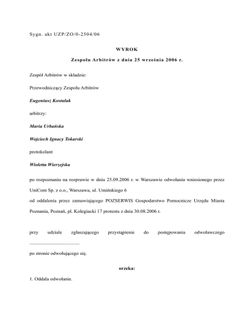 Sygn. akt UZP/ZO/0-2504/06 WYROK Zespołu Arbitrów z dnia 25 września 2006 r. Zespół Arbitrów w składzie: Przewodniczący Zespołu Arbitrów Eugeniusz Kostulak arbitrzy: Maria Urbańska Wojciech Ignacy Tokarski protokolant Wioletta Wierzejska po rozpoznaniu na rozprawie w dniu 25.09.2006 r. w Warszawie odwołania wniesionego przez UniCom Sp. z o.o., Warszawa, ul. Umińskiego 6 od oddalenia przez zamawiającego POZSERWIS Gospodarstwo Pomocnicze Urzędu Miasta Poznania, Poznań, pl. Kolegiacki 17 protestu z dnia 30.08.2006 r. przy udziale zgłaszającego przystąpienie ........................................ po stronie odwołującego się. orzeka: 1. Oddala odwołanie. do postępowania odwoławczego 2. Kosztami postępowania obciąża UniCom Sp. z o.o., Warszawa, ul. Umińskiego 6 i nakazuje: 1) zaliczyć na rzecz Urzędu Zamówień Publicznych koszty w wysokości 3981 zł 25 gr (słownie: trzy tysiące dziewięćset osiemdziesiąt jeden złotych dwadzieścia pięć groszy) z kwoty wpisu uiszczonego przez UniCom Sp. z o.o., Warszawa, ul. Umińskiego 6 2) dokonać wpłaty kwoty 828 zł 0 gr (słownie: osiemset dwadzieścia osiem złotych zero groszy) przez UniCom Sp. z o.o., Warszawa, ul. Umińskiego 6 na rzecz POZSERWIS Gospodarstwo Pomocnicze Urzędu Miasta Poznania, Poznań, pl. Kolegiacki 17, stanowiącej uzasadnione koszty uczestnika postępowania odwoławczego poniesione z tytułu kosztów dojazdu 3) dokonać wpłaty kwoty zł gr (słownie: ......................................................) przez ...................................................... na rzecz Urzędu Zamówień Publicznych na rachunek dochodów własnych UZP 4) dokonać zwrotu kwoty 6018 zł 75 gr (słownie: sześć tysięcy osiemnaście złotych siedemdziesiąt pięć groszy) z rachunku dochodów własnych Urzędu Zamówień Publicznych na rzecz UniCom Sp. z o.o., Warszawa, ul. Umińskiego 6 . 3. Uzasadnienie Firma Unicom sp. z o.o., z siedzibą w Warszawie, po zapoznaniu się z treścią ogłoszenia opublikowanego w BZP z dnia 29.08.2006r., nr 222, pod pozycją 44271 przez POZSERWIS (jednostka organizacyjna Urzędu Miasta Poznania) o wszczęciu postępowania o udzielenie zamówienia publicznego w trybie przetargu nieograniczonego na „Drugi etap modernizacji systemu łączności, dotyczący modernizacji systemu łączności Ericsson MD 110 obsługującego obecnie Urząd Miasta Poznania na placu Kolegiackim 17 w Poznaniu wraz z modułami Strona 2 z 9 wniesionymi zainstalowanymi w budynkach UMP na terenie Poznania: ul. Libelta 16/20, ul. Wierzbięcice 45, ul. Gronowa 22a”, a następnie nabyciu Specyfikacji Istotnych Warunków Zamówienia (SIWZ) dla tego postępowania, wniosła do Zamawiającego w dniu 31.08.2006r., pisemny protest wobec ich treści. Protest oparty został na zarzutach, iż Zamawiający formułując w treści wskazanych dokumentów warunki udziału w postępowaniu, naruszył art. 7, art. 22 oraz art. 25 ustawy z dnia 29.01.2004r., Prawo zamówień publicznych (j.t Dz. U. 2006, nr 164, poz. 1163) poprzez: 1) żądanie (zawarte w s.III pkt 2 lit. a ogłoszenia oraz dz. 3 pkt 1 lit. a SIWZ), aby wykonawca posiadał zorganizowany w rozumieniu ustawy z dnia 22.01.1999r., o ochronie informacji niejawnych (j.t Dz. U. z 2005r., nr 196, poz. 1631, z póź. zm.) „pion ochrony informacji niejawnych”, a także „zdolność do przetwarzania informacji niejawnych do klauzuli poufne w systemie informatycznym”, pomimo, że „posiadanie ww uprawnień i zdolności nie jest niezbędne” w związku z wykonywaniem usługi stanowiącej przedmiot zamówienia; 2) wymóg (zawarty w s. III pkt 2 lit. c poz. IV ogłoszenia oraz dz. 3 pkt 2 lit. b poz. 4 i 6 SIWZ), aby wykonawca złożył wraz z ofertą „Dokument wydany przez Departament Bezpieczeństwa Teleinformatycznego Agencji Bezpieczeństwa Wewnętrznego potwierdzający, że wykonawca posiada zdolność do przetwarzania informacji niejawnych do klauzuli poufne w systemie teleinformatycznym”, a nadto, aby złożył oświadczenie, że posiada Pełnomocnika ds. Ochrony Informacji Niejawnych, które to żądanie nie znajduje oparcia w art. 25 pzp oraz rozporządzeniu Prezesa Rady Ministrów z dnia 19.05.2006r., w sprawie rodzaju dokumentów, jakich może żądać zamawiający od wykonawców oraz form w jakich te dokumenty mogą być składane (Dz. U. Nr 87, poz. 605); 3) żądanie (zawarte w s. III pkt 2 lit. b ogłoszenia oraz w dz. 3 pkt 1 lit. b SIWZ), aby wykonawca wykazał, że „w terminie od 21.08.2003 do 21.08.2006 zrealizował należycie Strona 3 z 9 przynajmniej 3 zamówienia polegające na modernizacji i rozbudowie centrali MD 110 od minimum wersji BC 10 (wykorzystaniem Group Switch Module) składających się z minimum 9 LIM wraz z rozbudową o wartości łącznej nie mniejszej niż 300.000zł., brutto (nazwy użyte należy traktować jako typu)”, a nadto (sekcja s. III pkt 3, poz. VIII ogłoszenia i dz. 3 pkt 2 lit. b poz. VIII SIWZ), aby przedłożył wykaz potwierdzający wykonanie wskazanych wyżej usług, które to żądanie ”jest warunkiem nieadekwatnie szczegółowym do przedmiotu zamówienia i ma na celu jedynie utrudnianie uczciwej konkurencji i uniemożliwienie Unicom sp. z o.o., realizacji przedmiotowego zamówienia„; 4) żądanie (zawarte w s. III oraz dz. 3 pkt 2 lit. b SIWZ in fine) zobowiązujące wykonawców do przedstawienia wymaganych dokumentów opisanych w poz. I, III, VI, VII, VIII, IX, w oryginałach, wbrew treści par. 4 ust. 1 wyżej cytowanego rozporządzenia Prezesa Rady Ministrów z dnia 19.05.2006r., który dopuszcza ich składanie również w formie kopii poświadczonej za zgodność z oryginałem przez wykonawcę. Zdaniem firmy wnoszącej protest, wskazane w jego treści wady uniemożliwiają przeprowadzenie przedmiotowego postępowania zgodnie z przepisami pzp. Fakt, iż wskazane nieprawidłowości dotyczą warunków udziału w postępowaniu oraz sposobu ich oceny wyklucza możliwość ich usunięcia 