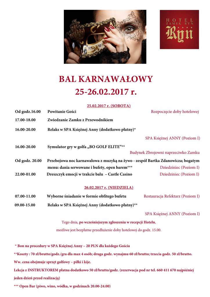 BAL KARNAWAŁOWY 25-26.02.2017 r. 25.02.2017 r. (SOBOTA) Od godz.16.00 Powitanie Gości 17.00-18.00 Zwiedzanie Zamku z Przewodnikiem 16.00-20.00 Relaks w SPA Księżnej Anny (dodatkowo płatny)* Rozpoczęcie doby hotelowej SPA Księżnej ANNY (Poziom I) 16.00-20.00 Symulator gry w golfa „BO GOLF ELITE”** Budynek Zbrojowni naprzeciwko Zamku Od godz. 20.00 22.00-01.00 Przebojowa noc karnawałowa z muzyką na żywo - zespół Bartka Zdanowicza; bogatym menu: dania serwowane i bufety, open barem*** Dziedziniec (Poziom I) Dreszczyk emocji w trakcie balu – Castle Casino Dziedziniec (Poziom I) 26.02.2017 r. (NIEDZIELA) 07.00-11.00 Wyborne śniadanie w formie obfitego bufetu 09.00-15.00 Relaks w SPA Księżnej Anny (dodatkowo płatny)** Restauracja Refektarz (Poziom I) SPA Księżnej ANNY (Poziom I) Tego dnia, po wcześniejszym zgłoszeniu w recepcji Hotelu, możliwe jest bezpłatne przedłużenie doby hotelowej do godz. 15.00. * Bon na procedury w SPA Księżnej Anny – 20 PLN dla każdego Gościa **Koszty : 70 zł/brutto/godz./gra dla max 4 osób; druga godz. wynajmu 60 zł/brutto; trzecia godz. 50 zł/brutto. Ww. cena obejmuje sprzęt golfowy – piłki i kije. Lekcja z INSTRUKTOREM płatna dodatkowo 50 zł/brutto/godz. (rezerwacja pod nr tel. 660 411 670 najpóźniej jeden dzień przed realizacją) *** Open Bar (piwo, wino, wódka, w godzinach 20.00-24.00) PONADTO ZAPRASZAMY DO SKORZYSTANIA Z DODATKOWYCH ATRAKCJI W HOTELU: CENTRUM REKREACJI (w cenie pobytu) basen, sauny czynne codziennie od 08.00-22.00 Sala Fitness, stół do tenisa (w cenie pobytu) codziennie 7.00-22.00 (bezpłatnie) –Budynek Zbrojowni Zbrojownia (kręgielnia, bilard) – sobota-niedziela w godz. 15.00-22.00 ATRAKCJE W POBLIŻU ZAMKU (PŁATNE DODATKOWO) KRYTE LODOWISKO (GIŻYCKO – 20 KM od Hotelu ZAMEK RYN****) tel. 503 080 302 w godzinach 7.00 - 15.00 oraz 507 044 808 GÓRA CZTERECH WIATRÓW (MRĄGOWO – 20 KM od Hotelu ZAMEK RYN****) – CAŁOROCZNY OŚRODEK SPORTOWY tel. 89 741-29-24, 89 741-25-53, 506 141 528 oraz 604 816 246 WYCIECZKI PO WARMII I MAZURACH (PRZEWODNIK TURYSTYCZNY PO WARMII I MAZURACH) OFF-ROAD PO MAZURSKICH BEZDROŻACH