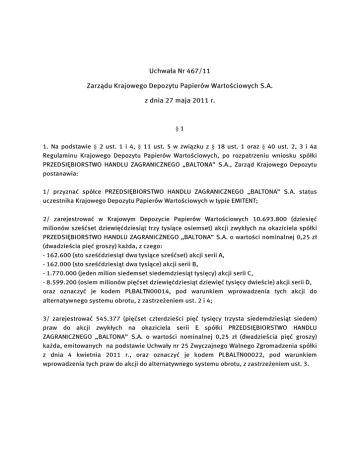Uchwała Nr 467/11 Zarządu Krajowego Depozytu Papierów Wartościowych S.A. z dnia 27 maja 2011 r. §1 1. Na podstawie § 2 ust. 1 i 4, § 11 ust. 5 w związku z § 18 ust. 1 oraz § 40 ust. 2, 3 i 4a Regulaminu Krajowego Depozytu Papierów Wartościowych, po rozpatrzeniu wniosku spółki PRZEDSIĘBIORSTWO HANDLU ZAGRANICZNEGO „BALTONA” S.A., Zarząd Krajowego Depozytu postanawia: 1/ przyznać spółce PRZEDSIĘBIORSTWO HANDLU ZAGRANICZNEGO „BALTONA” S.A. status uczestnika Krajowego Depozytu Papierów Wartościowych w typie EMITENT; 2/ zarejestrować w Krajowym Depozycie Papierów Wartościowych 10.693.800 (dziesięć milionów sześćset dziewięćdziesiąt trzy tysiące osiemset) akcji zwykłych na okaziciela spółki PRZEDSIĘBIORSTWO HANDLU ZAGRANICZNEGO „BALTONA” S.A. o wartości nominalnej 0,25 zł (dwadzieścia pięć groszy) każda, z czego: - 162.600 (sto sześćdziesiąt dwa tysiące sześćset) akcji serii A, - 162.000 (sto sześćdziesiąt dwa tysiące) akcji serii B, - 1.770.000 (jeden milion siedemset siedemdziesiąt tysięcy) akcji serii C, - 8.599.200 (osiem milionów pięćset dziewięćdziesiąt dziewięć tysięcy dwieście) akcji serii D, oraz oznaczyć je kodem PLBALTN00014, pod warunkiem wprowadzenia tych akcji do alternatywnego systemu obrotu, z zastrzeżeniem ust. 2 i 4; 3/ zarejestrować 545.377 (pięćset czterdzieści pięć tysięcy trzysta siedemdziesiąt siedem) praw do akcji zwykłych na okaziciela serii E spółki PRZEDSIĘBIORSTWO HANDLU ZAGRANICZNEGO „BALTONA” S.A. o wartości nominalnej 0,25 zł (dwadzieścia pięć groszy) każda, emitowanych na podstawie Uchwały nr 25 Zwyczajnego Walnego Zgromadzenia spółki z dnia 4 kwietnia 2011 r., oraz oznaczyć je kodem PLBALTN00022, pod warunkiem wprowadzenia tych praw do akcji do alternatywnego systemu obrotu, z zastrzeżeniem ust. 3. 2. Zarejestrowanie wskazanych w ust. 1 pkt 2 akcji zwykłych na okaziciela serii A, B, C i D spółki PRZEDSIĘBIORSTWO HANDLU ZAGRANICZNEGO „BALTONA” S.A. w Krajowym Depozycie Papierów Wartościowych nastąpi w terminie trzech dni od otrzymania przez Krajowy Depozyt dokumentów potwierdzających wprowadzenie tych akcji do alternatywnego systemu obrotu. 3. Zarejestrowanie wskazanych w ust. 1 pkt 3 praw do akcji zwykłych na okaziciela serii E spółki PRZEDSIĘBIORSTWO HANDLU ZAGRANICZNEGO „BALTONA” S.A. w Krajowym Depozycie Papierów Wartościowych nastąpi w terminie trzech dni od otrzymania przez Krajowy Depozyt dokumentów potwierdzających wprowadzenie tych praw do akcji do alternatywnego systemu obrotu. 4. W przypadku podjęcia przez spółkę organizującą alternatywny system obrotu decyzji o wyznaczeniu pierwszego dnia notowania w tym systemie nie wszystkich akcji, o których mowa w ust. 1 pkt 2, zarejestrowanie pod kodem PLBALTN00014 akcji, co do których nie została podjęta decyzja o wyznaczeniu pierwszego dnia notowania w tym systemie, nastąpi pod warunkiem podjęcia tej decyzji, nie wcześniej jednak niż w dniu wskazanym w decyzji spółki organizującej ten system, jako dzień pierwszego notowania tych akcji w tym systemie. §2 Informacje o zarejestrowaniu akcji, o których mowa w ust. 1 pkt 2, pod kodem PLBALTN00014 oraz o zarejestrowaniu praw do akcji, o których mowa w ust. 1 pkt 3, pod kodem PLBALTN00022, zostaną przekazane w formie komunikatów Krajowego Depozytu. §3 Uchwała wchodzi w życie z dniem podjęcia. Sławomir Panasiuk Wiceprezes Zarządu Michał Stępniewski Członek Zarządu