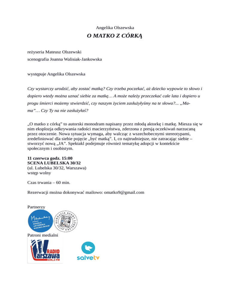 Angelika Olszewska O MATKO Z CÓRKĄ reżyseria Mateusz Olszewski scenografia Joanna Walisiak-Jankowska występuje Angelika Olszewska Czy wystarczy urodzić, aby zostać matką? Czy trzeba poczekać, aż dziecko wypowie to słowo i dopiero wtedy można uznać siebie za matkę… A może należy przeczekać całe lata i dopiero u progu śmierci możemy stwierdzić, czy naszym życiem zasłużyłyśmy na te słowa?... „Mama”… Czy Ty na nie zasłużyłaś? „O matko z córką” to autorski monodram napisany przez młodą aktorkę i matkę. Miesza się w nim eksplozja odkrywania radości macierzyństwa, zderzona z presją oczekiwań narzucaną przez otoczenie. Nowa sytuacja wymaga, aby walcząc z wszechobecnymi stereotypami, zredefiniować dla siebie pojęcie „być matką”. I, co najtrudniejsze, nie zatracając siebie – stworzyć nową „JA”. Spektakl podejmuje również tematykę adopcji w kontekście społecznym i osobistym. 11 czerwca godz. 15:00 SCENA LUBELSKA 30/32 (ul. Lubelska 30/32, Warszawa) wstęp wolny Czas trwania – 60 min. Rezerwacji można dokonywać mailowo: [email protected] Partnerzy Patroni medialni