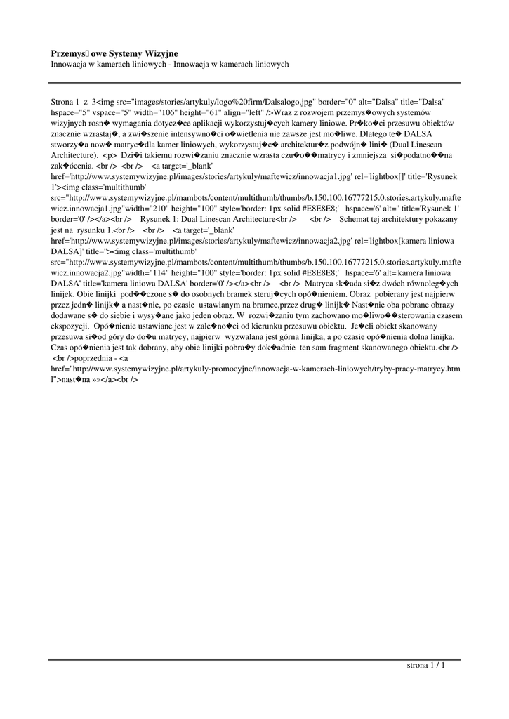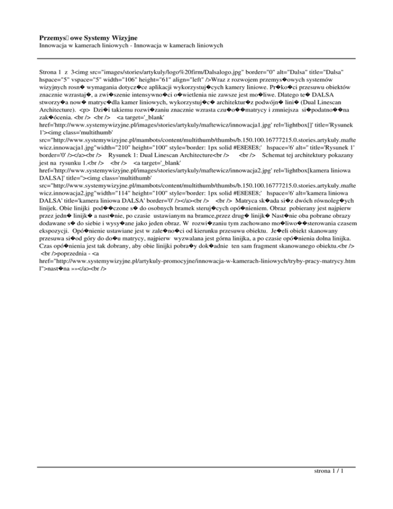 Przemys�owe Systemy Wizyjne Innowacja w kamerach liniowych - Innowacja w kamerach liniowych Strona 1 z 3<img src="images/stories/artykuly/logo%20firm/Dalsalogo.jpg" border="0" alt="Dalsa" title="Dalsa" hspace="5" vspace="5" width="106" height="61" align="left" />Wraz z rozwojem przemys�owych systemów wizyjnych rosn� wymagania dotycz�ce aplikacji wykorzystuj�cych kamery liniowe. Pr�ko�ci przesuwu obiektów znacznie wzrastaj�, a zwi�szenie intensywno�ci o�wietlenia nie zawsze jest mo�liwe. Dlatego te� DALSA stworzy�a now� matryc�dla kamer liniowych, wykorzystuj�c� architektur�z podwójn� lini� (Dual Linescan Architecture). <p> Dzi�i takiemu rozwi�zaniu znacznie wzrasta czu�o��matrycy i zmniejsza si�podatno��na zak�ócenia. <br /> <br /> <a target='_blank' href='http://www.systemywizyjne.pl/images/stories/artykuly/maftewicz/innowacja1.jpg' rel='lightbox[]' title='Rysunek 1'><img class='multithumb' src="http://www.systemywizyjne.pl/mambots/content/multithumb/thumbs/b.150.100.16777215.0.stories.artykuly.mafte wicz.innowacja1.jpg"width="210" height="100" style='border: 1px solid #E8E8E8;' hspace='6' alt='' title='Rysunek 1' border='0' /></a><br /> Rysunek 1: Dual Linescan Architecture<br /> <br /> Schemat tej architektury pokazany jest na rysunku 1.<br /> <br /> <a target='_blank' href='http://www.systemywizyjne.pl/images/stories/artykuly/maftewicz/innowacja2.jpg' rel='lightbox[kamera liniowa DALSA]' title=''><img class='multithumb' src="http://www.systemywizyjne.pl/mambots/content/multithumb/thumbs/b.150.100.16777215.0.stories.artykuly.mafte wicz.innowacja2.jpg"width="114" height="100" style='border: 1px solid #E8E8E8;' hspace='6' alt='kamera liniowa DALSA' title='kamera liniowa DALSA' border='0' /></a><br /> <br /> Matryca sk�ada si�z dwóch równoleg�ych linijek. Obie linijki pod��czone s� do osobnych bramek steruj�cych opó�nieniem. Obraz pobierany jest najpierw przez jedn� linijk� a nast�nie, po czasie ustawianym na bramce,przez drug� linijk� Nast�nie oba pobrane obrazy dodawane s� do siebie i wysy�ane jako jeden obraz. W rozwi�zaniu tym zachowano mo�liwo��sterowania czasem ekspozycji. Opó�nienie ustawiane jest w zale�no�ci od kierunku przesuwu obiektu. Je�eli obiekt skanowany przesuwa si�od góry do do�u matrycy, najpierw wyzwalana jest górna linijka, a po czasie opó�nienia dolna linijka. Czas opó�nienia jest tak dobrany, aby obie linijki pobra�y dok�adnie ten sam fragment skanowanego obiektu.<br /> <br />poprzednia - <a href="http://www.systemywizyjne.pl/artykuly-promocyjne/innowacja-w-kamerach-liniowych/tryby-pracy-matrycy.htm l">nast�na »»</a><br /> strona 1 / 1