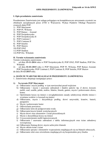 Załącznik nr 16 do SIWZ OPIS PRZEDMIOTU ZAMÓWIENIA I. Opis przedmiotu zamówienia Przedmiotem Zamówienia jest usługa polegająca na kompleksowym utrzymaniu czystości na obiektach zarządzanych przez ZTM w Warszawie. Wykaz Punktów Obsługi Pasażerów zwanych dalej POP: 1) POP Marymont 2) POP Pl. Wilsona 3) POP Ratusz – Arsenał 4) POP Świętokrzyska 5) POP Świętokrzyska II 6) POP Centrum I 7) POP Centrum II 8) POP Imielin 9) POP Służew 10) POP ONZ 11) POP Stadion 12) POP Dw. Wileński II. Termin wykonania zamówienia Termin wykonania zamówienia: 1) od dnia 15-11-2014 roku w POP Świętokrzyska II, POP ONZ, POP Stadion, POP Dw. Wileński 2) od dnia 01-01-2015 roku w POP Marymont, POP Pl. Wilsona, POP Ratusz Arsenał, POP Świętokrzyska, POP Centrum I, POP Centrum II, POP Imielin, POP Służew do dnia 31-12-2015 roku. A. OGÓLNE WARUNKI REALIZACJI PRZEDMIOTU ZAMÓWIENIA 1. Zamówienie obejmuje następujące prace: 1) Na terenie POP Marymont: a) Odkurzanie i mycie podłóg w tym nawierzchni przed wejściem b) Odkurzanie / mycie i usuwanie zabrudzeń i śladów palców itp. Z drzwi, krzeseł, mebli, szaf, szafek, półek, stołów, blatów, biurek, gaśnic, mycie i polerowanie zlewu, kranu. c) Opróżnianie koszy na śmieci z uwzględnieniem zasady selektywnej zbiórki śmieci i wymiana worków w koszach na śmieci d) Odkurzanie, mycie i dezynfekcja podłóg, drzwi umywalek, kranów, baterii, parapetów e) Mycie i polerowanie luster f) Odświeżanie powietrza g) Odkurzanie term do podgrzewania wody h) Odkurzanie/mycie kratek wentylacyjnych i) Mycie drzwi oraz elementów i ścian przeszklonych j) Mycie o dezynfekcja koszy na śmieci k) Czyszczenie/pranie mebli tapicerowanych l) Odkurzanie i usuwanie zabrudzeń z tablic informacyjnych oraz ścian zabudowy wewnętrznej m) Odkurzanie framug drzwi, mycie uchwytów klamek n) Mycie oklein ścian i ścian o) Odkurzanie sprzętu i elementów wyposażenia znajdujących się na blatach roboczych, p) Odkurzanie rolet oraz oświetlenia znajdujących się bezpośrednio przy biurku 1 q) Bieżące usuwanie zanieczyszczeń 2) Na terenie POP Pl. Wilsona: a) Odkurzanie i mycie podłóg w tym nawierzchni przed wejściem b) Odkurzanie / mycie i usuwanie zabrudzeń i śladów palców itp. Z drzwi, krzeseł, mebli, szaf, szafek, półek, stołów, blatów, biurek, gaśnic, mycie i polerowanie zlewu, kranu. c) Opróżnianie koszy na śmieci z uwzględnieniem zasady selektywnej zbiórki śmieci i wymiana worków w koszach na śmieci d) Odkurzanie, mycie i dezynfekcja podłóg, drzwi umywalek, kranów, baterii, parapetów e) Mycie i polerowanie luster f) Odświeżanie powietrza g) Odkurzanie / mycie kratek wentylacyjnych h) Mycie drzwi oraz elementów i ścian przeszklonych i) Mycie o dezynfekcja koszy na śmieci j) Czyszczenie/pranie mebli tapicerowanych k) Odkurzanie i usuwanie zabrudzeń z tablic informacyjnych oraz ścian zabudowy wewnętrznej l) Odkurzanie framug drzwi, mycie uchwytów klamek m) Mycie oklein ścian i ścian n) Odkurzanie sprzętu i elementów wyposażenia znajdujących się na blatach roboczych, o) Odkurzanie rolet oraz oświetlenia znajdujących się bezpośrednio przy biurku p) Bieżące usuwanie zanieczyszczeń 3) Na terenie POP Świętokrzyska I: a) Odkurzanie i mycie podłóg w tym nawierzchni przed wejściem b) Odkurzanie / mycie i usuwanie zabrudzeń i śladów palców itp. Z drzwi, krzeseł, mebli, szaf, szafek, półek, stołów, blatów, biurek, gaśnic, mycie i polerowanie zlewu, kranu. c) Opróżnianie koszy na śmieci z uwzględnieniem zasady selektywnej zbiórki śmieci i wymiana worków w koszach na śmieci d) Odkurzanie, mycie i dezynfekcja podłóg, drzwi umywalek, kranów, baterii, parapetów e) Mycie i polerowanie luster f) Odświeżanie powietrza g) Mycie i dezynfekcja ścian wyłożonych glazurą h) Odkurzanie term do podgrzewania wody i) Odkurzanie/mycie kratek wentylacyjnych j) Mycie drzwi oraz elementów i ścian przeszklonych k) Mycie i dezynfekcja koszy na śmieci l) Czyszczenie/pranie mebli tapicerowanych m) Odkurzanie i usuwanie zabrudzeń z tablic informacyjnych oraz ścian zabudowy wewnętrznej n) Odkurzanie framug drzwi, mycie uchwytów klamek o) Mycie oklein ścian i ścian p) Odkurzanie sprzętu i elementów wyposażenia znajdujących się na blatach roboczych, q) Odkurzanie rolet oraz oświetlenia znajdujących się bezpośrednio przy biurku r) Bieżące usuwanie zanieczyszczeń 4) Na terenie POP Świętokrzyska II: a) Odkurzanie i mycie podłóg w tym nawierzchni przed wejściem 2 b) Odkurzanie / mycie i usuwanie zabrudzeń i śladów palców itp. Z drzwi, krzeseł, mebli, szaf, szafek, półek, stołów, blatów, biurek, gaśnic, mycie i polerowanie zlewu, kranu. c) Opróżnianie koszy na śmieci z uwzględnieniem zasady selektywnej zbiórki śmieci i wymiana worków w koszach na śmieci d) Odkurzanie, mycie i dezynfekcja podłóg, drzwi umywalek, kranów, baterii, parapetów e) Mycie i polerowanie luster f) Odświeżanie powietrza g) Mycie i dezynfekcja ścian wyłożonych glazurą h) Odkurzanie term do podgrzewania wody i) Odkurzanie/mycie kratek wentylacyjnych j) Mycie drzwi oraz elementów i ścian przeszklonych k) Mycie i dezynfekcja koszy na śmieci l) Czyszczenie/pranie mebli tapicerowanych m) Odkurzanie i usuwanie zabrudzeń z tablic informacyjnych oraz ścian zabudowy wewnętrznej n) Odkurzanie framug drzwi, mycie uchwytów klamek o) Mycie oklein ścian i ścian p) Odkurzanie sprzętu i elementów wyposażenia znajdujących się na blatach roboczych, q) Odkurzanie rolet oraz oświetlenia znajdujących się bezpośrednio przy biurku r) Bieżące usuwanie zanieczyszczeń 5) Na terenie POP Ratusz -Arsenał: a) Odkurzanie i mycie podłóg w tym nawierzchni przed wejściem b) Odkurzanie / mycie i usuwanie zabrudzeń i śladów palców itp. Z drzwi, krzeseł, mebli, szaf, szafek, półek, stołów, blatów, biurek, gaśnic, mycie i polerowanie zlewu, kranu. c) Opróżnianie koszy na śmieci 