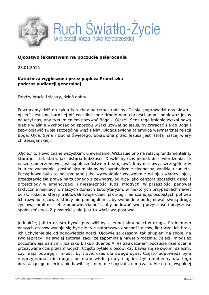 Ojcostwo lekarstwem na poczucie osierocenia 28.01.2015 Katecheza wygłoszona przez papieża Franciszka podczas audiencji generalnej Drodzy bracia i siostry, dzień dobry. Powracamy dziś do cyklu katechez na temat rodziny. Dzisiaj poprowadzi nas słowo „ ojciec”. Jest ono bardziej niż wszelkie inne drogie nam chrześcijanom, ponieważ Jezus nauczył nas, aby tym imieniem nazywać Boga - „Ojcze”. Sens tego imienia zyskał nową głębię właśnie wychodząc od sposobu w jaki używał go Jezus, by zwracać się do Boga i żeby objawić swoją szczególną więź z Nim. Błogosławiona tajemnica wewnętrznej relacji Boga, Ojca, Syna i Ducha Świętego, objawiona przez Jezusa jest istotą naszej wiary chrześcijańskiej. „Ojciec” to słowo znane wszystkim, uniwersalne. Wskazuje ono na relację fundamentalną, która jest tak stara, jak historia ludzkości. Doszliśmy dziś jednak do stwierdzenia, że nasze społeczeństwo jest „społeczeństwem bez ojców”. Innymi słowy, szczególnie w kulturze zachodniej, postać ojca miała by być symbolicznie nieobecna, zanikła, usunięta. Początkowo było to postrzegane jako wyzwolenie: wyzwolenie od ojca-władcy, ojca, przedstawiciela prawa narzuconego z zewnątrz, od ojca jako cenzora szczęścia dzieci i przeszkody w emancypacji i niezależności ludzi młodych. W przeszłości panował faktycznie niekiedy w naszych domach autorytaryzm, w niektórych przypadkach nawet ucisk: rodzice, którzy traktowali swoje dzieci jak sługi, nie szanując osobistych potrzeb ich rozwoju; ojcowie, którzy nie pomagali im, aby swobodnie podejmowali swoją drogę życiową, brali na siebie odpowiedzialność, aby budować swoją przyszłość i przyszłość społeczeństwa. Z pewnością nie jest to właściwa postawa. Jednakże, jak to często bywa, przeszliśmy z jednej skrajności w drugą. Problemem naszych czasów wydaje się być nie tyle natarczywa obecność ojców, ile raczej ich brak, ich uchylenie się od odpowiedzialności. Ojcowie są czasami tak skupieni na sobie, na swojej pracy i na swojej autorealizacji, że zapominają nawet o rodzinie. Dzieci i młodzież pozostawiają samymi. Już jako biskup Buenos Aires zauważałem poczucie osierocenia przeżywane dziś przez młodych. Często pytałem ojców, czy bawią się ze swoimi dziećmi, czy mają odwagę i miłość, by tracić czas dla swego syna. Często odpowiedź była nieprzyjemna: nie mogę, bo mam wiele pracy i ojciec był nieobecny dla tego dorastającego dziecka, nie bawił się z nim, nie spędzał z nim czasu. Ale na tej wspólnej Ruch Światło-Życie w diecezji koszalińsko-kołobrzeskiej: www.koszalin.oaza.pl; realizacja: kokoma.pl Strona 1 drodze refleksji na temat rodziny, chciałbym powiedzieć wszystkim wspólnotom chrześcijańskim, że musimy być bardziej ostrożni: brak postaci ojca w życiu dzieci i młodzieży powoduje luki i urazy, które mogą być bardzo poważne. I rzeczywiście zaburzenia dzieci i młodzieży można w dużej mierze przypisać temu niedostatkowi, brakowi wzorców i obdarzonych autorytetem przewodników w ich codziennym życiu, brakowi bliskości, brakowi miłości ojców. Poczucie osierocenia przeżywane przez wielu młodych jest znacznie głębsze, niż to sobie wyobrażamy. Są oni sierotami, ale w rodzinie, bo ojcowie są często w domu nieobecni, nawet fizycznie, ale nade wszystko dlatego, że kiedy są obecni, nie zachowują się jak ojcowie, nie podejmują dialogu z dziećmi, nie wypełniają swojego zadania edukacyjnego, nie dają dzieciom, swoim przykładem wspartym słowami, tych zasad, tych wartości, tych reguł życia, których potrzebują oni jak chleba. Edukacyjna funkcja obecności ojcowskiej jest tym bardziej konieczna, im bardziej ojciec jest zmuszony z powodu pracy do przebywania z daleka od domu. Czasami wydaje się, że ojcowie nie za dobrze wiedzą, jakie miejsce zająć w rodzinie i jak wychowywać dzieci. Wtedy mając wątpliwości, powstrzymują się, wycofują i zaniedbują swoje obowiązki, choćby chroniąc się w wątpliwej relacji bycia „na równi” z dziećmi. To prawda, że powinieneś być towarzyszem swego dziecka, nie zapominając jednak, że jesteś ojcem. Kiedy bowiem zachowujesz się tylko jak równy z dzieckiem, to nie wychodzi to jemu na dobre. Ale widzimy to także we wspólnocie obywatelskiej ze swoimi instytucjami, ma odpowiedzialność wobec ludzi młodych, odpowiedzialność, którą czasami zaniedbuje lub wypełnia źle. Także ona często pozostawia ich osieroconymi i nie proponuje im perspektywicznej prawdy. W ten sposób ludzie młodzi pozostają sierotami pozbawionymi bezpiecznych dróg, jakimi należy iść, nauczycieli, którym można zaufać, sierotami bez ideałów rozpalających serce, sierotami bez wartości i nadziei wspierających ich każdego dnia. Wypełnia się ich może bożkami, ale kradnie się ich serce; pobudza się ich do marzeń o rozrywkach i przyjemnościach, ale nie daje się im pracy; są zwodzeni bożkiem pieniądzem, a odmawia się im prawdziwych bogactw. Warto więc, aby ojcowie i dzieci usłyszeli na nowo obietnicę, jaką Jezus złożył swoim uczniom: „Nie zostawię was sierotami” (J 14,18). To On jest bowiem Drogą, którą należy pójść, Nauczycielem, którego trzeba słuchać, Nadzieją, że świat może się zmienić, że miłość zwycięża nienawiść, że może być przyszłość braterstwa i pokoju dla wszystkich. Ktoś z was mógłby mi dziś powiedzieć: Ojcze, dzisiaj byłeś zbyt pesymistyczny. Mówiłeś tylko o nieobecności ojców i co się dzieje, gdy ojcowie nie są blisko swych dzieci. To prawda. Chciałem to podkreślić, bo w przyszłą środę będę kontynuował tę katechezę, podkreślając piękno ojcostwa. Dlatego postanowiłem rozpocząć od ciemności, aby dojść do światła. Niech Pan nam pomoże w dobrym zrozumieniu tych spraw. Dziękuję. tłumaczenie za: wiara.pl Ruch Światło-Życie w diecezji koszalińsko-kołobrzes