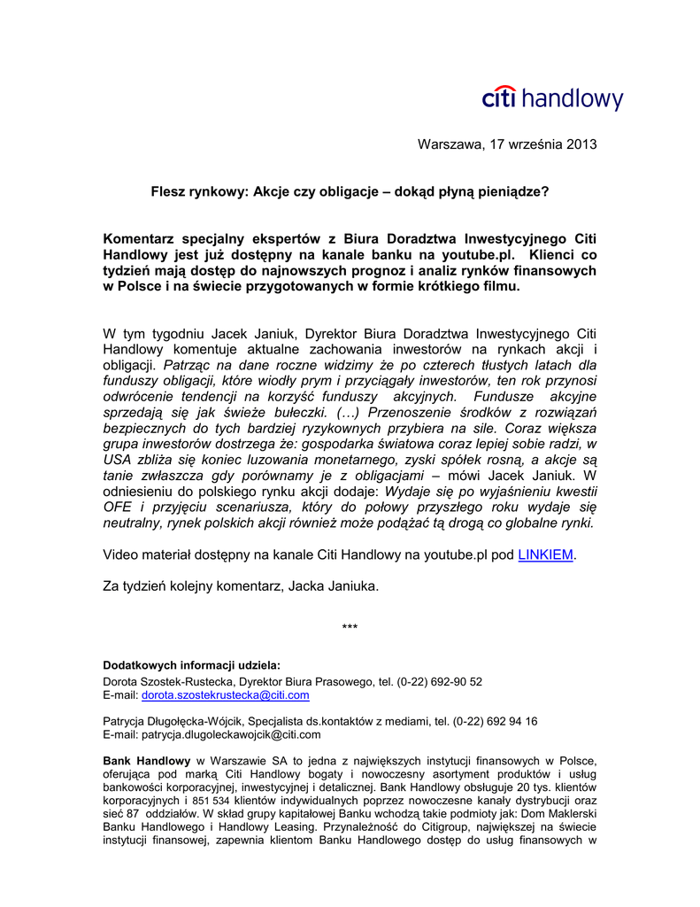 Warszawa, 17 września 2013 Flesz rynkowy: Akcje czy obligacje – dokąd płyną pieniądze? Komentarz specjalny ekspertów z Biura Doradztwa Inwestycyjnego Citi Handlowy jest już dostępny na kanale banku na youtube.pl. Klienci co tydzień mają dostęp do najnowszych prognoz i analiz rynków finansowych w Polsce i na świecie przygotowanych w formie krótkiego filmu. W tym tygodniu Jacek Janiuk, Dyrektor Biura Doradztwa Inwestycyjnego Citi Handlowy komentuje aktualne zachowania inwestorów na rynkach akcji i obligacji. Patrząc na dane roczne widzimy że po czterech tłustych latach dla funduszy obligacji, które wiodły prym i przyciągały inwestorów, ten rok przynosi odwrócenie tendencji na korzyść funduszy akcyjnych. Fundusze akcyjne sprzedają się jak świeże bułeczki. (…) Przenoszenie środków z rozwiązań bezpiecznych do tych bardziej ryzykownych przybiera na sile. Coraz większa grupa inwestorów dostrzega że: gospodarka światowa coraz lepiej sobie radzi, w USA zbliża się koniec luzowania monetarnego, zyski spółek rosną, a akcje są tanie zwłaszcza gdy porównamy je z obligacjami – mówi Jacek Janiuk. W odniesieniu do polskiego rynku akcji dodaje: Wydaje się po wyjaśnieniu kwestii OFE i przyjęciu scenariusza, który do połowy przyszłego roku wydaje się neutralny, rynek polskich akcji również może podążać tą drogą co globalne rynki. Video materiał dostępny na kanale Citi Handlowy na youtube.pl pod LINKIEM. Za tydzień kolejny komentarz, Jacka Janiuka. *** Dodatkowych informacji udziela: Dorota Szostek-Rustecka, Dyrektor Biura Prasowego, tel. (0-22) 692-90 52 E-mail: [email protected] Patrycja Długołęcka-Wójcik, Specjalista ds.kontaktów z mediami, tel. (0-22) 692 94 16 E-mail: [email protected] Bank Handlowy w Warszawie SA to jedna z największych instytucji finansowych w Polsce, oferująca pod marką Citi Handlowy bogaty i nowoczesny asortyment produktów i usług bankowości korporacyjnej, inwestycyjnej i detalicznej. Bank Handlowy obsługuje 20 tys. klientów korporacyjnych i 851 534 klientów indywidualnych poprzez nowoczesne kanały dystrybucji oraz sieć 87 oddziałów. W skład grupy kapitałowej Banku wchodzą takie podmioty jak: Dom Maklerski Banku Handlowego i Handlowy Leasing. Przynależność do Citigroup, największej na świecie instytucji finansowej, zapewnia klientom Banku Handlowego dostęp do usług finansowych w ponad 100 krajach. Dodatkowe informacje można uzyskać na stronie internetowej www.citihandlowy.pl. Citi (NYSE:C) to wiodąca globalna instytucja finansowa, mająca około 200 milionów klientów w ponad 140 krajach. Poprzez swoje dwie odrębne jednostki operacyjne: Citicorp i Citi Holdings, Citi obsługuje klientów indywidualnych, korporacyjnych, rządowych i instytucjonalnych zapewniając im bogaty wachlarz produktów i usług finansowych w zakresie bankowości detalicznej, bankowości korporacyjnej i inwestycyjnej, usług maklerskich i zarządzania aktywami. Dodatkowe informacje można uzyskać na stronie internetowej www.citigroup.com lub or www.citi.com.