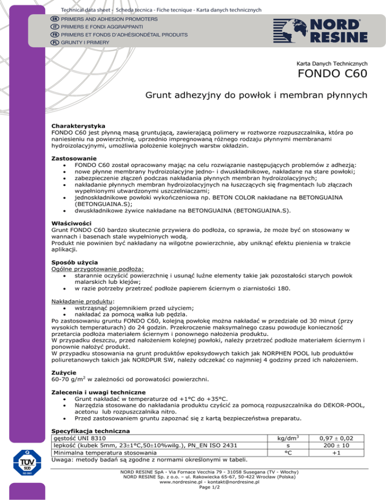 Technical data sheet - Scheda tecnica - Fiche tecnique - Karta danych technicznych PRIMERS AND ADHESION PROMOTERS PRIMERS E FONDI AGGRAPPANTI PRIMERS ET FONDS D'ADHÉSIONDÉTAIL PRODUITS GRUNTY I PRIMERY Karta Danych Technicznych FONDO C60 Grunt adhezyjny do powłok i membran płynnych Charakterystyka FONDO C60 jest płynną masą gruntującą, zawierającą polimery w roztworze rozpuszczalnika, która po naniesieniu na powierzchnię, uprzednio impregnowaną różnego rodzaju płynnymi membranami hydroizolacyjnymi, umożliwia położenie kolejnych warstw okładzin. Zastosowanie • FONDO C60 został opracowany mając na celu rozwiązanie następujących problemów z adhezją: • nowe płynne membrany hydroizolacyjne jedno- i dwuskładnikowe, nakładane na stare powłoki; • zabezpieczenie złączeń podczas nakładania płynnych membran hydroizolacyjnych; • nakładanie płynnych membran hydroizolacyjnych na łuszczących się fragmentach lub złączach wypełnionymi utwardzonymi uszczelniaczami; • jednoskładnikowe powłoki wykończeniowa np. BETON COLOR nakładane na BETONGUAINA (BETONGUAINA.S); • dwuskładnikowe żywice nakładane na BETONGUAINA (BETONGUAINA.S). Właściwości Grunt FONDO C60 bardzo skutecznie przywiera do podłoża, co sprawia, że może być on stosowany w wannach i basenach stale wypełnionych wodą. Produkt nie powinien być nakładany na wilgotne powierzchnie, aby uniknąć efektu pienienia w trakcie aplikacji. Sposób użycia Ogólne przygotowanie podłoża: • starannie oczyścić powierzchnię i usunąć luźne elementy takie jak pozostałości starych powłok malarskich lub klejów; • w razie potrzeby przetrzeć podłoże papierem ściernym o ziarnistości 180. Nakładanie produktu: • wstrząsnąć pojemnikiem przed użyciem; • nakładać za pomocą wałka lub pędzla. Po zastosowaniu gruntu FONDO C60, kolejną powłokę można nakładać w przedziale od 30 minut (przy wysokich temperaturach) do 24 godzin. Przekroczenie maksymalnego czasu powoduje konieczność przetarcia podłoża materiałem ściernym i ponownego nałożenia produktu. W przypadku deszczu, przed nałożeniem kolejnej powłoki, należy przetrzeć podłoże materiałem ściernym i ponownie nałożyć produkt. W przypadku stosowania na grunt produktów epoksydowych takich jak NORPHEN POOL lub produktów poliuretanowych takich jak NORDPUR SW, należy odczekać co najmniej 4 godziny przed ich nałożeniem. Zużycie 60-70 g/m2 w zależności od porowatości powierzchni. Zalecenia i uwagi techniczne • Grunt nakładać w temperaturze od +1°C do +35°C. • Narzędzia stosowane do nakładania produktu czyścić za pomocą rozpuszczalnika do DEKOR-POOL, acetonu lub rozpuszczalnika nitro. • Przed zastosowaniem gruntu zapoznać się z kartą bezpieczeństwa preparatu. Specyfikacja techniczna gęstość UNI 8310 lepkość (kubek 5mm, 23±1°C,50±10%wilg.), PN_EN ISO 2431 Minimalna temperatura stosowania Uwaga: metody badań są zgodne z normami określonymi w tabeli. kg/dm3 s °C NORD RESINE SpA - Via Fornace Vecchia 79 - 31058 Susegana (TV - Włochy) NORD RESINE Sp. z o.o. – ul. Rakowiecka 65-67, 50-422 Wrocław (Polska) www.nordresine.pl - [email protected] Page 1/2 0,97 ± 0,02 200 ± 10 +1 Technical data sheet - Scheda tecnica - Fiche tecnique - Karta danych technicznych PRIMERS AND ADHESION PROMOTERS PRIMERS E FONDI AGGRAPPANTI PRIMERS ET FONDS D'ADHÉSIONDÉTAIL PRODUITS GRUNTY I PRIMERY Karta Danych Technicznych FONDO C60 Grunt adhezyjny do powłok i membran płynnych Oznaczenia, pakowanie i magazynowanie Określenie zagrożenia Xn Opakowanie jednostkowe Pojemniki metalowe 1,5 i 20 litrów 6 miesięcy w oryginalnym opakowaniu w suchym pomieszczeniu przy Składowanie temperaturze +5°C do +35°C. Zastrzeżenia prawne Zalecenia dotyczące sposobu stosowania naszych produktów są zgodne z aktualnym stanem wiedzy i nie skutkują przejęciem jakiejkolwiek gwarancji i/lub odpowiedzialności co do końcowego wyniku wykonywanych prac. Nie zwalniają więc one klienta od odpowiedzialności związanej ze sprawdzeniem przydatności produktów w zakresie ich planowanego zastosowania poprzez przeprowadzenie wstępnych prób. Na stronie internetowej pod adresem www.nordresine.pl dostępna jest najnowsza wersja niniejszej karty technicznej: w razie wątpliwości, sprawdzić w dziale “KATALOG” datę edycji. Edycja 28.09.2012 NORD RESINE SpA - Via Fornace Vecchia 79 - 31058 Susegana (TV - Włochy) NORD RESINE Sp. z o.o. – ul. Rakowiecka 65-67, 50-422 Wrocław (Polska) www.nordresine.pl - [email protected] Page 2/2