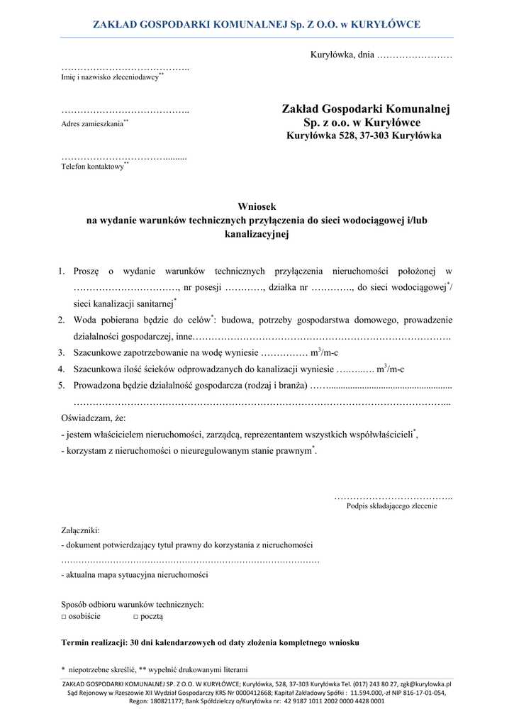 ZAKŁAD GOSPODARKI KOMUNALNEJ Sp. Z O.O. w KURYŁÓWCE Kuryłówka, dnia …………………… ………………………………….. Imię i nazwisko zleceniodawcy** Zakład Gospodarki Komunalnej Sp. z o.o. w Kuryłówce ………………………………….. Adres zamieszkania ** Kuryłówka 528, 37-303 Kuryłówka ……………………………......... Telefon kontaktowy** Wniosek na wydanie warunków technicznych przyłączenia do sieci wodociągowej i/lub kanalizacyjnej 1. Proszę o wydanie warunków technicznych przyłączenia nieruchomości położonej w ……………………………, nr posesji …………, działka nr …………., do sieci wodociągowej */ sieci kanalizacji sanitarnej* 2. Woda pobierana będzie do celów*: budowa, potrzeby gospodarstwa domowego, prowadzenie działalności gospodarczej, inne………………………………………………………………………. 3. Szacunkowe zapotrzebowanie na wodę wyniesie …………… m3/m-c 4. Szacunkowa ilość ścieków odprowadzanych do kanalizacji wyniesie ….…..…. m3/m-c 5. Prowadzona będzie działalność gospodarcza (rodzaj i branża) …….................................................... ………………………………………………………………………………………………………... Oświadczam, że: - jestem właścicielem nieruchomości, zarządcą, reprezentantem wszystkich współwłaścicieli*, - korzystam z nieruchomości o nieuregulowanym stanie prawnym*. ……………………………….. Podpis składającego zlecenie Załączniki: - dokument potwierdzający tytuł prawny do korzystania z nieruchomości ……………………………………………………………………………… - aktualna mapa sytuacyjna nieruchomości Sposób odbioru warunków technicznych: □ osobiście □ pocztą Termin realizacji: 30 dni kalendarzowych od daty złożenia kompletnego wniosku * niepotrzebne skreślić, ** wypełnić drukowanymi literami ZAKŁAD GOSPODARKI KOMUNALNEJ SP. Z O.O. W KURYŁÓWCE; Kuryłówka, 528, 37-303 Kuryłówka Tel. (017) 243 80 27, [email protected] Sąd Rejonowy w Rzeszowie XII Wydział Gospodarczy KRS Nr 0000412668; Kapitał Zakładowy Spółki : 11.594.000,-zł NIP 816-17-01-054, Regon: 180821177; Bank Spółdzielczy o/Kuryłówka nr: 42 9187 1011 2002 0000 4428 0001 ZAKŁAD GOSPODARKI KOMUNALNEJ Sp. Z O.O. w KURYŁÓWCE ZOBOWIĄZANIE PONIESIENIA KOSZTÓW USŁUGI Proszę o wystawienie faktury VAT za wydanie warunków technicznych przyłączenia do sieci wodociągowej i/lub kanalizacyjnej dla: nazwa inwestycji: ………………………………………………………………………………………............................... adres inwestycji: …………………………………………………………………………………………………………… Fakturę wystawić na: ………………………………………………………………………………………………………........ Zobowiązuję się do dokonania płatności za powyższą usługę w terminie określonym na fakturze ….…………………………………… podpis wnioskodawcy * /inwestora * ZGK Sp. z o. o. informuje: 1. Dane będą przetwarzane zgodnie z ustawą z dnia 29 sierpnia 1997r. O ochronie danych osobowych (Dz. U. z 2002r. Nr 101, poz. 926 ze zm.) w celu realizacji niniejszego zlecenia na usługę. 2. Dane będą udostępniane jedynie uprawnionym podmiotom, w okolicznościach przewidzianych w powszechnie obowiązujących przepisach. 3. Osoba, której dane dotyczą, ma prawo dostępu do treści swoich danych oraz ich poprawiania. 4. Podanie danych jest dobrowolne ale konieczne do realizacji niniejszego zlecenia. …….…............................................. Podpis zleceniodawcy*/inwestora* ZAKŁAD GOSPODARKI KOMUNALNEJ SP. Z O.O. W KURYŁÓWCE; Kuryłówka, 528, 37-303 Kuryłówka Tel. (017) 243 80 27, [email protected] Sąd Rejonowy w Rzeszowie XII Wydział Gospodarczy KRS Nr 0000412668; Kapitał Zakładowy Spółki : 11.594.000,-zł NIP 816-17-01-054, Regon: 180821177; Bank Spółdzielczy o/Kuryłówka nr: 42 9187 1011 2002 0000 4428 0001