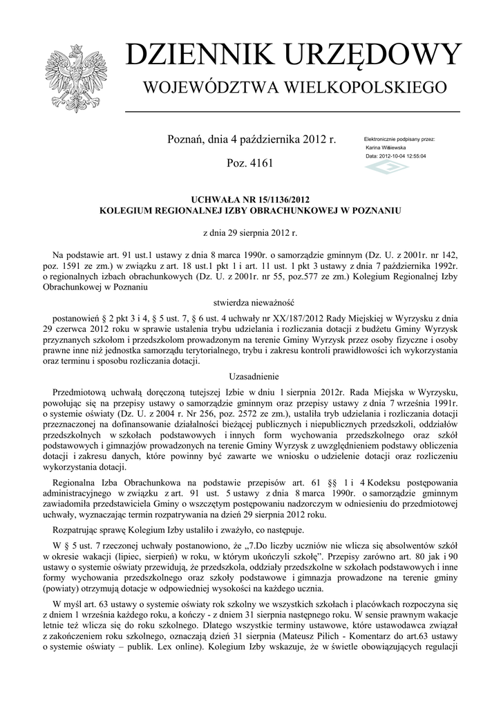 DZIENNIK URZĘDOWY WOJEWÓDZTWA WIELKOPOLSKIEGO Poznań, dnia 4 października 2012 r. Elektronicznie podpisany przez: Karina Wiśniewska Poz. 4161 Data: 2012-10-04 12:55:04 UCHWAŁA NR 15/1136/2012 KOLEGIUM REGIONALNEJ IZBY OBRACHUNKOWEJ W POZNANIU z dnia 29 sierpnia 2012 r. Na podstawie art. 91 ust.1 ustawy z dnia 8 marca 1990r. o samorządzie gminnym (Dz. U. z 2001r. nr 142, poz. 1591 ze zm.) w związku z art. 18 ust.1 pkt 1 i art. 11 ust. 1 pkt 3 ustawy z dnia 7 października 1992r. o regionalnych izbach obrachunkowych (Dz. U. z 2001r. nr 55, poz.577 ze zm.) Kolegium Regionalnej Izby Obrachunkowej w Poznaniu stwierdza nieważność postanowień § 2 pkt 3 i 4, § 5 ust. 7, § 6 ust. 4 uchwały nr XX/187/2012 Rady Miejskiej w Wyrzysku z dnia 29 czerwca 2012 roku w sprawie ustalenia trybu udzielania i rozliczania dotacji z budżetu Gminy Wyrzysk przyznanych szkołom i przedszkolom prowadzonym na terenie Gminy Wyrzysk przez osoby fizyczne i osoby prawne inne niż jednostka samorządu terytorialnego, trybu i zakresu kontroli prawidłowości ich wykorzystania oraz terminu i sposobu rozliczania dotacji. Uzasadnienie Przedmiotową uchwałą doręczoną tutejszej Izbie w dniu 1 sierpnia 2012r. Rada Miejska w Wyrzysku, powołując się na przepisy ustawy o samorządzie gminnym oraz przepisy ustawy z dnia 7 września 1991r. o systemie oświaty (Dz. U. z 2004 r. Nr 256, poz. 2572 ze zm.), ustaliła tryb udzielania i rozliczania dotacji przeznaczonej na dofinansowanie działalności bieżącej publicznych i niepublicznych przedszkoli, oddziałów przedszkolnych w szkołach podstawowych i innych form wychowania przedszkolnego oraz szkół podstawowych i gimnazjów prowadzonych na terenie Gminy Wyrzysk z uwzględnieniem podstawy obliczenia dotacji i zakresu danych, które powinny być zawarte we wniosku o udzielenie dotacji oraz rozliczeniu wykorzystania dotacji. Regionalna Izba Obrachunkowa na podstawie przepisów art. 61 §§ 1 i 4 Kodeksu postępowania administracyjnego w związku z art. 91 ust. 5 ustawy z dnia 8 marca 1990r. o samorządzie gminnym zawiadomiła przedstawiciela Gminy o wszczętym postępowaniu nadzorczym w odniesieniu do przedmiotowej uchwały, wyznaczając termin rozpatrywania na dzień 29 sierpnia 2012 roku. Rozpatrując sprawę Kolegium Izby ustaliło i zważyło, co następuje. W § 5 ust. 7 rzeczonej uchwały postanowiono, że „7.Do liczby uczniów nie wlicza się absolwentów szkół w okresie wakacji (lipiec, sierpień) w roku, w którym ukończyli szkołę”. Przepisy zarówno art. 80 jak i 90 ustawy o systemie oświaty przewidują, że przedszkola, oddziały przedszkolne w szkołach podstawowych i inne formy wychowania przedszkolnego oraz szkoły podstawowe i gimnazja prowadzone na terenie gminy (powiaty) otrzymują dotacje w odpowiedniej wysokości na każdego ucznia. W myśl art. 63 ustawy o systemie oświaty rok szkolny we wszystkich szkołach i placówkach rozpoczyna się z dniem 1 września każdego roku, a kończy - z dniem 31 sierpnia następnego roku. W sensie prawnym wakacje letnie też wlicza się do roku szkolnego. Dlatego wszystkie terminy ustawowe, które ustawodawca związał z zakończeniem roku szkolnego, oznaczają dzień 31 sierpnia (Mateusz Pilich - Komentarz do art.63 ustawy o systemie oświaty – publik. Lex online). Kolegium Izby wskazuje, że w świetle obowiązujących regulacji Dziennik Urzędowy Województwa Wielkopolskiego –2– Poz. 4161 prawnych nie ma podstaw prawnych do pomniejszania w lipcu i sierpniu planowanej liczby uczniów stanowiących podstawę naliczania wysokości dotacji o absolwentów, którzy ukończyli szkołę. Wątpliwości interpretacyjne przedstawionego zagadnienia zostały wyeliminowane ustawą z dnia 27 lipca 2012r. o zmianie ustawy o systemie oświaty oraz ustawy o zmianie ustawy o systemie oświaty oraz niektórych innych ustaw (Dz. U. z 30.08.2012r. poz. 979). Ustawą tą wprowadzone zostały m.in. zmiany przepisów: art. 80 poprzez dodanie ustępu 3i w brzmieniu: „3i. W przypadku szkół, w których zajęcia dydaktycznowychowawcze w klasach (semestrach) programowo najwyższych kończą się w kwietniu lub czerwcu, dotacja, o której mowa w ust. 3, przysługuje również na każdego absolwenta szkoły w okresie od miesiąca następującego po miesiącu, w którym ukończył szkołę, do końca roku szkolnego, w którym absolwent ukończył szkołę.”; art. 90 poprzez dodanie ustępu 2f w brzmieniu: „2f. W przypadku szkół niepublicznych o uprawnieniach szkół publicznych, w których zajęcia dydaktyczno-wychowawcze w klasach (semestrach) programowo najwyższych kończą się w kwietniu lub czerwcu, dotacja, o której mowa w ust. 2a, przysługuje również na każdego absolwenta szkoły w okresie od miesiąca następującego po miesiącu, w którym ukończył szkołę, do końca roku szkolnego, w którym absolwent ukończył szkołę”. W § 6 ust. 4. uchwały postanowiono, że „W przypadku nadpłacenia dotacji, dotacja podlega zwrotowi zgodnie z art. 252 ust. 1 pkt 2 ustawy z dnia 27 sierpnia 2009 r. o finansach publicznych (…)”. Kolegium podnosi, że ustawodawca w przepisach ustawy o finansach publicznych posługuje się pojęciami: dotacje niewykorzystane do końca roku budżetowego, wykorzystane niezgodnie z przeznaczeniem, pobrane nienależnie lub w nadmiernej wysokości. W przepisach nie występuje wyrażenie „nadpłacenie dotacji”. Zacytowanym postanowieniem został naruszony § 6 rozporządzenia Prezesa Rady Ministrów z dnia 20 czerwca 2002r. w sprawie „Zasad techniki prawodawczej” (Dz. U. Nr 100, poz. 908) – mających zastosowanie do aktów prawa miejscowego (§ 143) – który stanowi, że przepisy prawne redaguje się tak, aby były one czytelne i zrozumiałe dla adresatów. W orzecznictwie sądów administracyjnych ugruntowany jest pogląd, że uchwała jako akt prawa miejscowego, a takim aktem jest niewątpliwe uchwała Rady Miejskiej w sprawie trybu udzielania i rozliczania
