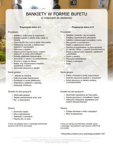 BANKIETY W FORMIE BUFETU (z miejscami do siedzenia) Propozycja menu nr I Przystawki: Propozycja menu nr II Przystawki: ? Sałatka z kukurydzy w majonezie ? Sałatka grecka z serem feta i świeżą bazylią ? Ziemniaczki drążone w sosie francuskim ? Grillowany kurczak z makaronem sojowym i warzywami ? Warzywa z dipami ? Wieprzowina zasmażana z sosem sojowym ze świeżymi kiełkami ? Rolady chlebowe nadziewane ? Szczupak w całości na postumencie ? Szynka z nogą na desce ? Bakłażany faszerowane mięsem, zapiekane z serem ? Ziemniaki pieczone z serem Dania gorące: ? Sałatka z brokułu i jaj na twardo ? Sałatka z gotowanych pieczarek ? Sałatka z pieczonego kurczaka z curry ? Mozzarella z pomidorami ? Deski z wędzonymi rybami ? Śledzie przygotowane na dwa sposoby (z cebulą i oliwą i z sosem pomidorowym) ? Deski z pieczonymi mięsami, wędlinami i pasztetem ? Deski z serami ? Pieczywo bankietowe ? Patery z owocami ? Sosy Dania gorące: ? Żeberka w miodzie ? Udka kurczaka faszerwane ? Eskalopki w sosie jabłkowym ? Wątróbka z jabłkami i cebulką ? Szaszłyki drobiowe Dodatki do dań gorących: ? Ziemniaki grappa ? Talarki panierowane smażone ? Ryż z warzywami ? Filety z łososia w sosie cytrynowym ? Golonki pieczone podane z chrzanem ? Indyk pieczony w całości podany z brzoskwiniami Dodatki do dań gorących: ? Ziemniaki zapiekane po francusku ? Kasza gryczana z kawałkami mięsa ? Warzywa mieszane zapiekane pod sosem beszamelowym Desery: Desery: ? Domowe ciasta ? Mus czekoladowy ? Sakiewki z owocami ? Pączki drożdżowe Cena za zestaw wraz z obsługą kelnerską wynosi 119 PLN od osoby ? Ciasta domowe w kilku rodzajach ? Mus truskawkowy Cena za wyżej wymieniony zestaw wraz z obsługą i wynajmem sali wynosi 109 PLN od osoby Wszystkie podane ceny zawierają podatek VAT CS Szkolenie i Doradztwo Sp. z o.o. w Warszawie – Wydział Obsługi Klienta Warszawa Ul. Edisona 2, 04-510 Warszawa, tel.: 022 612 13 57-58, 022 815 39 42, fax: 022 473 10 17 [email protected] NIP: 952-18-66-706 Regon: 017264496
