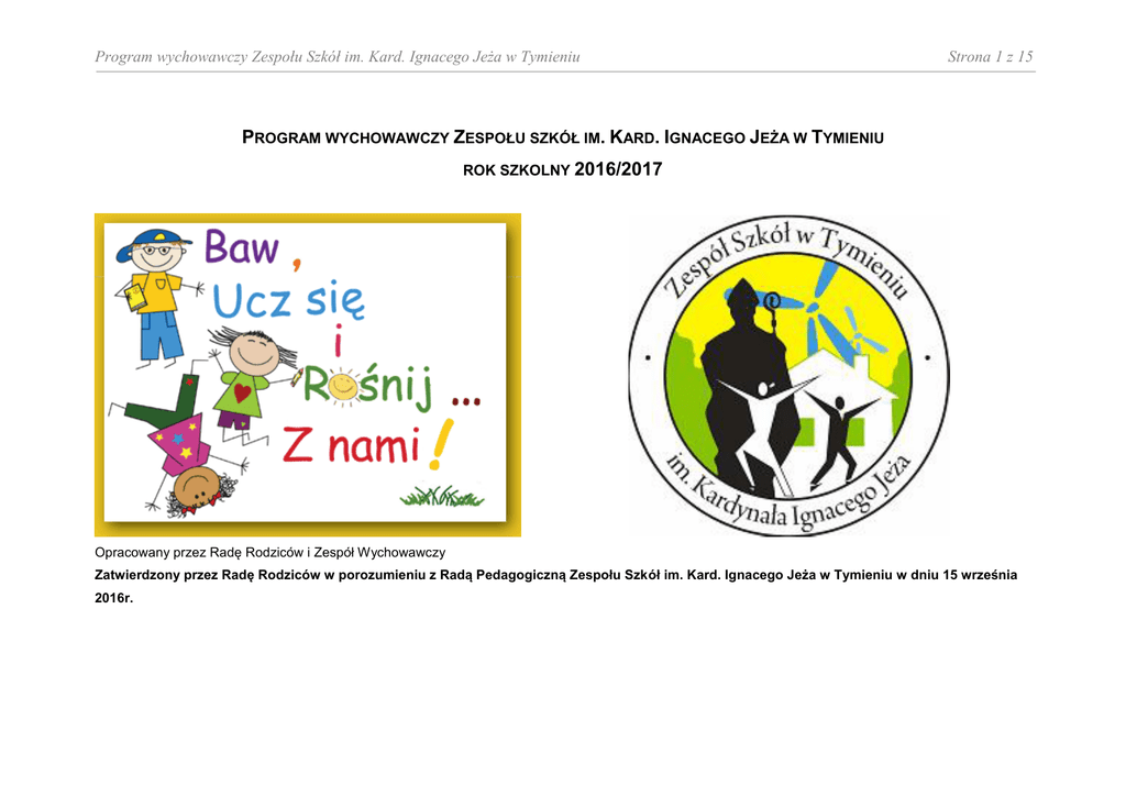 Program wychowawczy Zespołu Szkół im. Kard. Ignacego Jeża w Tymieniu Strona 1 z 15 PROGRAM WYCHOWAWCZY ZESPOŁU SZKÓŁ IM. KARD. IGNACEGO JEŻA W TYMIENIU ROK SZKOLNY 2016/2017 Opracowany przez Radę Rodziców i Zespół Wychowawczy Zatwierdzony przez Radę Rodziców w porozumieniu z Radą Pedagogiczną Zespołu Szkół im. Kard. Ignacego Jeża w Tymieniu w dniu 15 września 2016r. Program wychowawczy Zespołu Szkół im. Kard. Ignacego Jeża w Tymieniu Strona 2 z 15 cele główne: 1. Budowanie więzi uczniowskich: przyjaźni, szacunku, tolerancji oraz prawidłowego komunikowania się i znajdowanie sposobów przezwyciężania stresów. 2. Zapewnienie optymalnych warunków do wszechstronnego rozwoju osobowości dziecka w bezpiecznym i przyjaznym środowisku. 3. Rozbudzenie i rozwijanie indywidualnych zdolności twórczych oraz samodzielnego myślenia i sprawnego działania. 4. Rozwijanie efektywnej współpracy z domem i integracja ze środowiskiem lokalnym. 5. Rozwijanie kompetencji czytelniczych u uczniów Program został dostosowany do przepisów rozporządzenia Ministra Edukacji Narodowej z dnia 18 sierpnia 2015r. w sprawie zakresu i form prowadzenia w szkołach i placówkach systemu oświaty działalności wychowawczej, edukacyjnej, informacyjnej i profilaktycznej w celu przeciwdziałania narkomani (Dz. U. poz. 1249). PLAN DZIAŁAŃ WYCHOWAWCZYCH DLA KLAS 0 – III Cele wychowawcze dla klas 0 – III 1. Przygotowanie ucznia do funkcjonowania w grupie szkolnej i efektywnego w niej działania. 2. Kształtowanie nawyków dobrego zachowania i efektywnej współpracy, komunikowania się z rówieśnikami i dorosłymi. 3. Umacnianie wiary we własne możliwości i wskazywanie prawidłowych zachowań w trudnych sytuacjach. 4. Umacnianie przynależności do społeczności lokalnej i świadomości narodowej. 5. Kształtowanie poczucia odpowiedzialności za otaczająca nas przyrodę. 6. Rozwijanie kompetencji czytelniczych oraz upowszechnianie czytelnictwa wśród dzieci. Cele operacyjne Zadania nauczyciela Sposoby realizacji Osoby realizujące Ewaluacja KLASA 0 - I Ma poczucie przynależności 1. Zorganizowanie do grupy, klasy, szkoły i uroczystości ślubowania na rodziny. ucznia. Apel, pasowanie na ucznia naszej szkoły. Karta informacji wstępnej, Nauczyciele, uczniowie ze starszych klas, bibliotekarz, wychowawcy świetlicy , wystawa: Moi koledzy Program wychowawczy Zespołu Szkół im. Kard. Ignacego Jeża w Tymieniu Umie współdziałać w klasie i grupie rówieśniczej. 2. Rozpoznanie środowiska rodzinnego, diagnoza potrzeb 3. Wzajemne poznawanie się oraz integracja zespołu klasowego. 4. Rozpoznawanie zespołu klasowego i dostosowanie działań wychowawczych i edukacyjnych do potrzeb ze szczególnym uwzględnieniem obniżenia wieku realizacji obowiązku szkolnego. wizyta w domu ucznia wychowawca, w zależności od potrzeb, rodzice zasięgnięcie informacji dzieci, od pedagoga, psychologa oraz w instytucjach tj. GOPS, policja. Wspólne gry i zabawy. Odpowiedzi na pytania np. Jaki jestem? Jakie są moje ulubione gry, zabawki. Portrety własne i kolegów. Wspólne organizowanie imprez klasowych oraz świąt rodzinnych (urodziny, Andrzejki, Mikołajki, Wigilia klasowa, Dzień Babci i Dziadka, Dzień Matki, Dzień Dziecka, Święto Rodziny) przez uczniów i członków ich rodzin. 1.Opracowanie zestawu norm panujących w grupie Wspólne z uczniami wychowawca, dzieci stworzenie, zaakceptowanie i konsekwentne przestrzeganie Kodeksu Postępowania Ucznia dotyczącego praw i obowiązków: - staranności w wykonywaniu obowiązków – bezpieczeństwa i zdrowia - dbałości o wygląd zewnętrzny – prawa do korzystania z pomocy. wychowawca, rodzice Przeprowadzanie pogadanek dotyczących przestrzegania zasad bezpieczeństwa przed rozpoczęciem każdej nowej formy zajęć. 2. Przedstawienie właściwych wzorów zachowań w różnych sytuacjach i kontaktach z rówieśnikami Strona 3 z 15 ocena zachowania Program wychowawczy Zespołu Szkół im. Kard. Ignacego Jeża w Tymieniu Strona 4 z 15 Prowadzenie zajęć nt. tolerancji, akceptowania odmienności fizycznej i intelektualnej. /od kl. O – III/ Wsparcie uczniów wychowawca, rodzice, niepełnosprawnych w radzeniu pedagog, psycholog, sobie z akceptacją własnej socjoterapeuta osoby./ od kl. O – III/ Zna zasady korzystania z księgozbioru biblioteki szkolnej. Zorganizowanie i przeprowadzenie lekcji bibliotecznych. Zapoznanie z regulaminem biblioteki. Omówienie zawartości księgozbioru i zasad dot. korzystania z niego. Pasowanie na czytelnika biblioteki szkolnej. Przeprowadzenie akcji – Wychowawca czyta dzieciom. nauczyciele - bibliotekarze, wychowawcy, dzieci sprawozdanie z pracy biblioteki KLASA II Zna normy dobrego zachowania w klasie i w środowisku. 1. Przypomnienie klasowego regulaminu dobrego zachowania oraz odczytanie Kodeksu Szkoły bez Przemocy 2. Przedstawienie tekstów literackich obrazujących pożądane formy zachowań 3. Utrwalanie pożądanych zachowań w miejscach publicznych. Stosowanie się wychowawca, rodzice do opracowanego w klasie I zestawu norm postępowania oraz przestrzeganie Kodeksu Szkoły bez Przemocy – wychowawca, rodzice wykorzystanie prac plastycznych na szkolnym korytarzu, praca z programem multimedialnym. Pogadanki. Ocena i udzielanie wychowawca, rodzice rad bohaterom książek, komiksów, historyjek, opowiadań wykorzystanie literatury dla dzieci /autor G.Kasdepke/ Pogadanki dotyczące stroju i odpowiedniego zachowania w kinie, teatrze, muzeum. ocena zachowania Program wychowawczy Zespołu Szkół im. Kard. Ignacego Jeża w Tymieniu Strona 5 z 15 Korzystanie z biblioteki szkolnej i publicznej. Wycieczki turystyczne i rekreacja. Opracowywanie klasowych regulaminów wycieczek. Uczeń przyjmuje różne role w grupie i czuje się za nie odpowiedzialny. Uczeń świadomie korzysta z biblioteki 1.Samoocena uczniów pod kątem zachowania. 2. Wybór samorządu klasowego. 3. Przygotowanie dzieci do uczestnictwa 