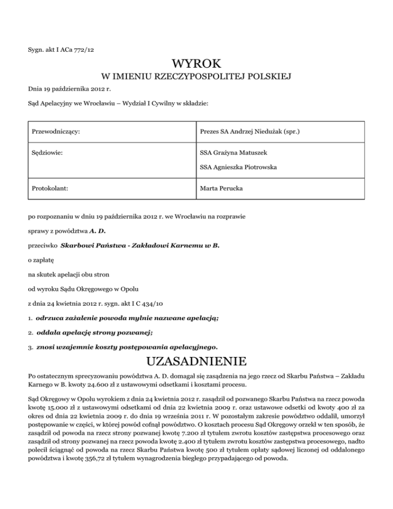 Sygn. akt I ACa 772/12 WYROK W IMIENIU RZECZYPOSPOLITEJ POLSKIEJ Dnia 19 października 2012 r. Sąd Apelacyjny we Wrocławiu – Wydział I Cywilny w składzie: Przewodniczący: Prezes SA Andrzej Niedużak (spr.) Sędziowie: SSA Grażyna Matuszek SSA Agnieszka Piotrowska Protokolant: Marta Perucka po rozpoznaniu w dniu 19 października 2012 r. we Wrocławiu na rozprawie sprawy z powództwa A. D. przeciwko Skarbowi Państwa - Zakładowi Karnemu w B. o zapłatę na skutek apelacji obu stron od wyroku Sądu Okręgowego w Opolu z dnia 24 kwietnia 2012 r. sygn. akt I C 434/10 1. odrzuca zażalenie powoda mylnie nazwane apelacją; 2. oddala apelację strony pozwanej; 3. znosi wzajemnie koszty postępowania apelacyjnego. UZASADNIENIE Po ostatecznym sprecyzowaniu powództwa A. D. domagał się zasądzenia na jego rzecz od Skarbu Państwa – Zakładu Karnego w B. kwoty 24.600 zł z ustawowymi odsetkami i kosztami procesu. Sąd Okręgowy w Opolu wyrokiem z dnia 24 kwietnia 2012 r. zasądził od pozwanego Skarbu Państwa na rzecz powoda kwotę 15.000 zł z ustawowymi odsetkami od dnia 22 kwietnia 2009 r. oraz ustawowe odsetki od kwoty 400 zł za okres od dnia 22 kwietnia 2009 r. do dnia 19 września 2011 r. W pozostałym zakresie powództwo oddalił, umorzył postępowanie w części, w której powód cofnął powództwo. O kosztach procesu Sąd Okręgowy orzekł w ten sposób, że zasądził od powoda na rzecz strony pozwanej kwotę 7.200 zł tytułem zwrotu kosztów zastępstwa procesowego oraz zasądził od strony pozwanej na rzecz powoda kwotę 2.400 zł tytułem zwrotu kosztów zastępstwa procesowego, nadto polecił ściągnąć od powoda na rzecz Skarbu Państwa kwotę 500 zł tytułem opłaty sądowej liczonej od oddalonego powództwa i kwotę 356,72 zł tytułem wynagrodzenia biegłego przypadającego od powoda. Od wyroku Sądu Okręgowego Skarb Państwa – Zakład Karny w B. złożył apelację zarzucając sprzeczność istotnych ustaleń Sądu z treścią zebranego w sprawie materiału dowodowego przez przyjęcie, że powód doznał urazu grając w piłkę na placu, który nie był wyremontowany, oraz naruszenie art. 328 § 2 k.p.c., art. 217 § 1 k.p.c. i art. 227 k.p.c. poprzez zaniechanie wizji lokalnej placu spacerowego w Zakładzie Karnym. Skarżący Skarb Państwa wnosił o zmianę zaskarżonego wyroku przez oddalenie powództwa w całości, zasądzenie od powoda na rzecz pozwanego kosztów procesu. Powód, działając przez ustanowionego pełnomocnika procesowego wniósł zatytułowane „Apelacja powoda” pismo, w którym podnosił zarzuty: 1. naruszenia prawa procesowego, a to art. 100 k.p.c. w zw. z art. 99 k.p.c., poprzez niewłaściwe jego zastosowanie i dokonanie rozdziału kosztów zastępstwa procesowego wbrew zasadzie w nim wyrażonej stosunkowego ich rozdzielenia, zgodnie z wynikiem sprawy, polegającego na błędnym obciążeniu wyższymi kosztami strony powodowej, której żądania uwzględnione zostały w przeważającej części, tj. w 64% oraz zastosowaniu stawek odmiennych od uregulowanych rozporządzeniem Ministra Sprawiedliwości z dnia 28 września 2002 r. w sprawie opłat za czynności adwokackie oraz ponoszenia przez Skarb Państwa kosztów nieopłaconej pomocy prawnej udzielonej z urzędu (Dz. U. z dnia 3 października 2002 r.), 2. naruszenie prawa materialnego, a to art. 113 ust. 2 pkt 1) ustawy z dnia 28 lipca 2005 r. o kosztach sadowych w sprawach cywilnych, polegające na niewłaściwym jego zastosowaniu i poleceniu ściągnięcia od powoda (w pkt VII wyroku) na rzecz Skarbu Państwa kwoty 500 zł tytułem opłaty sądowej liczonej od oddalonego powództwa oraz kwoty 356,72 zł tytułem wynagrodzenia biegłego przypadającego od powoda, podczas gdy zgodnie z regulacją art. 113 ustawy o kosztach sądowych w sprawach cywilnych koszty nieobciążające przeciwnika sąd w orzeczeniu kończącym sprawę w instancji nakazuje ściągnąć z roszczenia zasądzonego na rzecz strony, której czynność spowodowała ich powstanie. Wskazując na powyższe, powód wnosił o zmianę zaskarżonego wyroku w pkt V, VI i VII poprzez zasądzenie od strony pozwanej na rzecz powoda kwoty 1.536,00 zł tytułem kosztów zastępstwa procesowego oraz od strony powodowej na rzecz pozwanego kwoty 864 zł tytułem kosztów zastępstwa procesowego oraz zmianę wyroku w pkt VII poprzez polecenie ściągnięcia z roszczenia zasądzonego na rzecz powoda na rzecz Skarbu Państwa kwoty 500 zł tytułem opłaty sądowej liczonej od oddalonego powództwa i kwoty 356,72 zł tytułem wynagrodzenia biegłego przypadającego od powoda; ewentualnie zasądzenie od pozwanego na rzecz powoda kwoty 672 zł tytułem kosztów zastępstwa procesowego przy jednoczesnym nieobciążaniu powoda kosztami zastępstwa procesowego na rzecz strony pozwanej oraz poleceniu ściągnięcia z roszczenia zasądzonego na rzecz powoda na rzecz Skarbu Państwa kwoty 500 zł tytułem opłaty sądowej liczonej od oddalonego powództwa i kwoty 356,72 zł tytułem wynagrodzenia biegłego przypadającego od powoda. Sąd Apelacyjny zważył, co następuje: Apelacja strony pozwanej nie zasługuje na uwzględnienie. Wbrew podnoszonym w niej zarzutom, Sąd Apelacyjny nie nakazał, na podstawie art. 386 § 6 k.p.c., przeprowadzenie przez Sąd pierwszej instancji wizji lokalnej na terenie Zakładu Karnego. Wytknął natomiast temu Sądowi liczne zaniechania, wymieniając wizję lokalną jedynie przykładowo. W świetle poczynionych ustaleń faktycznych nie budzi wątpliwości, że powód kontuzji nogi doznał w czasie gry na placu, w nawierzchni którego znajdowała się wyrwa. Ta wyrwa była przyczyną urazu. Konsekwencje urazu zostały w całości udokumentowane i potwierdzone opinią biegłego. Wielkość przyznanego powodowi zadośćuczynienia nie jest niska, ale jest adekwatna do przebytych cierpień i rozmiaru trwałego uszczerbku na zdrowiu. Pismo powoda zatytułowane „Apelacja powoda” zostało wniesione dnia 6 czer
