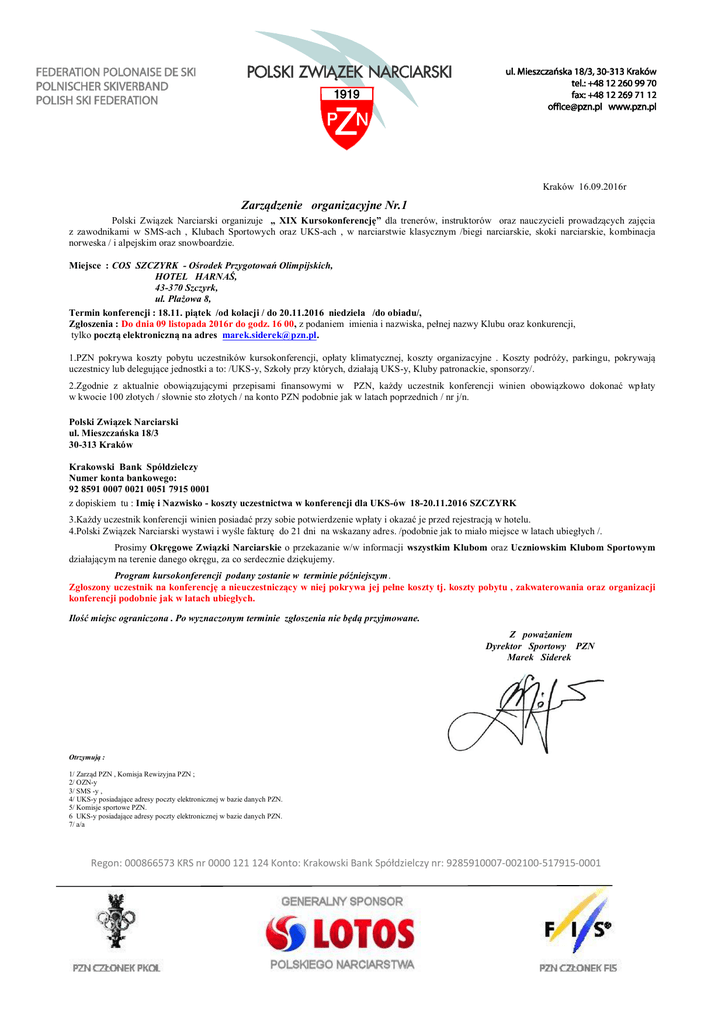 Kraków 16.09.2016r Zarządzenie organizacyjne Nr.1 Polski Związek Narciarski organizuje „ XIX Kursokonferencję” dla trenerów, instruktorów oraz nauczycieli prowadzących zajęcia z zawodnikami w SMS-ach , Klubach Sportowych oraz UKS-ach , w narciarstwie klasycznym /biegi narciarskie, skoki narciarskie, kombinacja norweska / i alpejskim oraz snowboardzie. Miejsce : COS SZCZYRK - Ośrodek Przygotowań Olimpijskich, HOTEL HARNAŚ, 43-370 Szczyrk, ul. Plażowa 8, Termin konferencji : 18.11. piątek /od kolacji / do 20.11.2016 niedziela /do obiadu/, Zgłoszenia : Do dnia 09 listopada 2016r do godz. 16 00, z podaniem imienia i nazwiska, pełnej nazwy Klubu oraz konkurencji, tylko pocztą elektroniczną na adres [email protected]. 1.PZN pokrywa koszty pobytu uczestników kursokonferencji, opłaty klimatycznej, koszty organizacyjne . Koszty podróży, parkingu, pokrywają uczestnicy lub delegujące jednostki a to: /UKS-y, Szkoły przy których, działają UKS-y, Kluby patronackie, sponsorzy/. 2.Zgodnie z aktualnie obowiązującymi przepisami finansowymi w PZN, każdy uczestnik konferencji winien obowiązkowo dokonać wp łaty w kwocie 100 złotych / słownie sto złotych / na konto PZN podobnie jak w latach poprzednich / nr j/n. Polski Związek Narciarski ul. Mieszczańska 18/3 30-313 Kraków Krakowski Bank Spółdzielczy Numer konta bankowego: 92 8591 0007 0021 0051 7915 0001 z dopiskiem tu : Imię i Nazwisko - koszty uczestnictwa w konferencji dla UKS-ów 18-20.11.2016 SZCZYRK 3.Każdy uczestnik konferencji winien posiadać przy sobie potwierdzenie wpłaty i okazać je przed rejestracją w hotelu. 4.Polski Związek Narciarski wystawi i wyśle fakturę do 21 dni na wskazany adres. /podobnie jak to miało miejsce w latach ubiegłych /. Prosimy Okręgowe Związki Narciarskie o przekazanie w/w informacji wszystkim Klubom oraz Uczniowskim Klubom Sportowym działającym na terenie danego okręgu, za co serdecznie dziękujemy. Program kursokonferencji podany zostanie w terminie późniejszym. Zgłoszony uczestnik na konferencję a nieuczestniczący w niej pokrywa jej pełne koszty tj. koszty pobytu , zakwaterowania oraz organizacji konferencji podobnie jak w latach ubiegłych. Ilość miejsc ograniczona . Po wyznaczonym terminie zgłoszenia nie będą przyjmowane. Z poważaniem Dyrektor Sportowy PZN Marek Siderek Otrzymują : 1/ Zarząd PZN , Komisja Rewizyjna PZN ; 2/ OZN-y 3/ SMS -y , 4/ UKS-y posiadające adresy poczty elektronicznej w bazie danych PZN. 5/ Komisje sportowe PZN. 6 UKS-y posiadające adresy poczty elektronicznej w bazie danych PZN. 7/ a/a Regon: 000866573 KRS nr 0000 121 124 Konto: Krakowski Bank Spółdzielczy nr: 9285910007-002100-517915-0001