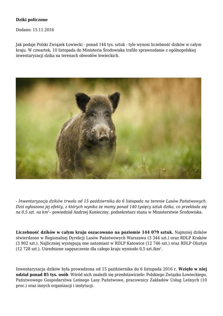 Dziki policzone Dodano: 15.11.2016 Jak podaje Polski Związek Łowiecki - ponad 144 tys. sztuk - tyle wynosi liczebność dzików w całym kraju. W czwartek, 10 listopada do Ministeria Środowiska trafiło sprawozdanie z ogólnopolskiej inwentaryzacji dzika na terenach obwodów łowieckich. - Inwentaryzacja dzików trwała od 15 października do 6 listopada na terenie Lasów Państwowych. Dziś ogłoszono jej efekty, z których wynika że mamy ponad 140 tysięcy sztuk dzika, co przekłada się na 0,5 szt. na km2– powiedział Andrzej Konieczny, podsekretarz stanu w Ministerstwie Środowiska. Liczebność dzików w całym kraju oszacowano na poziomie 144 079 sztuk. Najmniej dzików stwierdzono w Regionalnej Dyrekcji Lasów Państwowych Warszawa (3 344 szt.) oraz RDLP Kraków (3 902 szt.). Najliczniej występują one natomiast w RDLP Katowice (12 746 szt.) oraz RDLP Olsztyn (12 728 szt.). Uśrednione zagęszczenie dla całego kraju wyniosło 0,5 szt./km2. Inwentaryzacja dzików była prowadzona od 15 października do 6 listopada 2016 r. Wzięło w niej udział ponad 85 tys. osób. Wśród nich znaleźli się przedstawiciele: Polskiego Związku Łowieckiego, Państwowego Gospodarstwa Leśnego Lasy Państwowe, pracownicy Zakładów Usług Leśnych (10 proc.) oraz innych organizacji i instytucji. fot. Neil Burton/ Shutterstock.com źródło: PZŁ Komentarze (0) Nie dodano jeszcze żadnego komentarza.