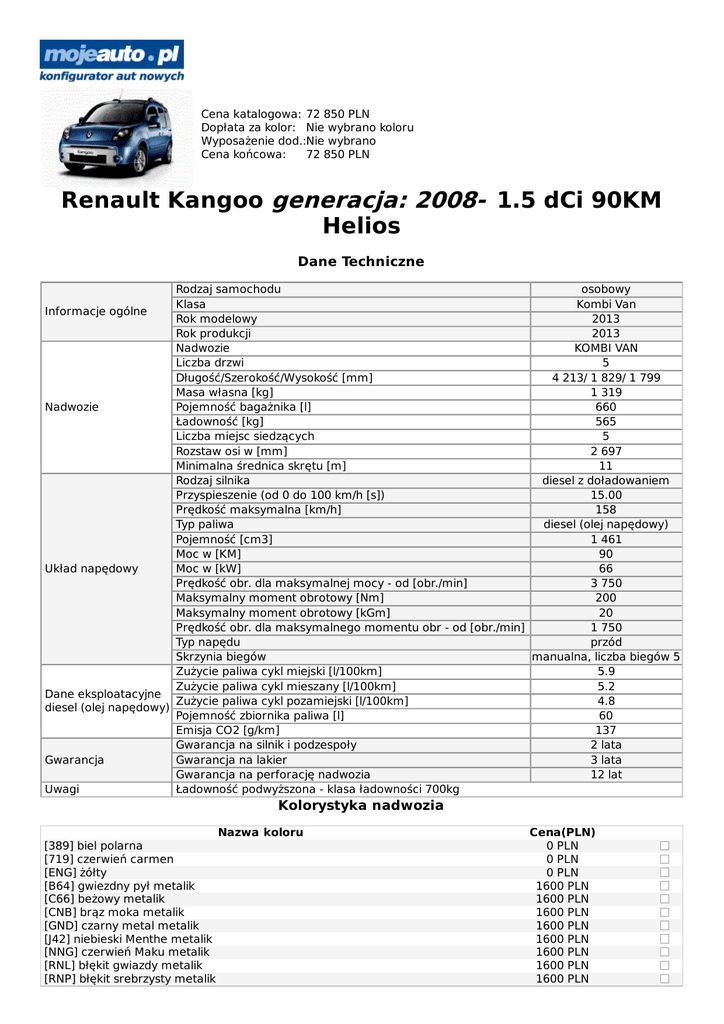 Cena katalogowa: 72 850 PLN Dopłata za kolor: Nie wybrano koloru Wyposażenie dod.:Nie wybrano Cena końcowa: 72 850 PLN Renault Kangoo generacja: 2008- 1.5 dCi 90KM Helios Dane Techniczne Rodzaj samochodu osobowy Klasa Kombi Van Informacje ogólne Rok modelowy 2013 Rok produkcji 2013 Nadwozie KOMBI VAN Liczba drzwi 5 Długość/Szerokość/Wysokość [mm] 4 213/ 1 829/ 1 799 Masa własna [kg] 1 319 Nadwozie Pojemność bagażnika [l] 660 Ładowność [kg] 565 Liczba miejsc siedzących 5 Rozstaw osi w [mm] 2 697 Minimalna średnica skrętu [m] 11 Rodzaj silnika diesel z doładowaniem Przyspieszenie (od 0 do 100 km/h [s]) 15.00 Prędkość maksymalna [km/h] 158 Typ paliwa diesel (olej napędowy) Pojemność [cm3] 1 461 Moc w [KM] 90 Układ napędowy Moc w [kW] 66 Prędkość obr. dla maksymalnej mocy - od [obr./min] 3 750 Maksymalny moment obrotowy [Nm] 200 Maksymalny moment obrotowy [kGm] 20 Prędkość obr. dla maksymalnego momentu obr - od [obr./min] 1 750 Typ napędu przód Skrzynia biegów manualna, liczba biegów 5 Zużycie paliwa cykl miejski [l/100km] 5.9 Zużycie paliwa cykl mieszany [l/100km] 5.2 Dane eksploatacyjne Zużycie paliwa cykl pozamiejski [l/100km] 4.8 diesel (olej napędowy) Pojemność zbiornika paliwa [l] 60 Emisja CO2 [g/km] 137 Gwarancja na silnik i podzespoły 2 lata Gwarancja Gwarancja na lakier 3 lata Gwarancja na perforację nadwozia 12 lat Uwagi Ładowność podwyższona - klasa ładowności 700kg Kolorystyka nadwozia Nazwa koloru [389] biel polarna [719] czerwień carmen [ENG] żółty [B64] gwiezdny pył metalik [C66] beżowy metalik [CNB] brąz moka metalik [GND] czarny metal metalik [J42] niebieski Menthe metalik [NNG] czerwień Maku metalik [RNL] błękit gwiazdy metalik [RNP] błękit srebrzysty metalik Cena(PLN) 0 PLN 0 PLN 0 PLN 1600 PLN 1600 PLN 1600 PLN 1600 PLN 1600 PLN 1600 PLN 1600 PLN 1600 PLN Wyposażenie standardowe Nazwa elementu 15" kołpaki ozdobne Egee 3 tylne pasy bezpieczeństwa bezwładnościowe 3-punktowe 4 uchwyty mocujące bagaż ABS z systemem wspomagania nagłego hamowania EBV i MSR automatyczny wyłącznik oświetlenia sterowany cetralnym zamkiem belki zabezpieczające z paddingiem w przednich drzwiach centralny zamek zdalnie sterowany falami radiowymi z automatycznym blokowaniem drzwi w czasie jazdy dodatkowe gniazdo 12V w konsoli centralnej dwa schowki podłogowe w tylnej części dźwiękowy sygnał informujący o niewyłączonych światłach + lampka sygnalizująca otwarte drzwi dźwiękowy sygnał oraz kontrolka informujące o niezapiętych pasach kierowcy dźwignia zmiany biegów w kolorze ciemnografitowym felgi stalowe 15" filtr przeciwpyłkowy fotel pasażera regulowany na długość, oparcie odchylane do tyłu funkcja oświetlenia drogi do domu "Follow me home" kierownica regulowana na wysokość kierownica z tworzywa w kolorze ciemnografitowym kierunkowskazy w kolorze białym kieszenie w oparciach foteli przednich klamki wewnętrzne chromowane, czarne uchwyty podnoszenia szyb klamki zewnętrzne drzwi w kolorze chromu klimatyzacja ręcznie sterowana koło zapasowe pełnowymiarowe komfortowy fotel kierowcy z regulacją wysokości kompletne wykończenie przestrzeni bagażowej komputer pokładowy lampka sufitowa z przodu (3 pozycje) lampka sufitowa z tyłu lewe drzwi boczne odsuwane przeszklone z szybą uchylną lusterko w osłonie przeciwsłonecznej pasażera lusterko wewnętrzne materiałowa zintegrowana wykładzina w przestrzeni pasażerskiej i bagażowej moduł centralny (podłokietnik środkowy z funkcją schowka), pokrywa z tapicerką materiałową możliwość wyłączenia poduszki powietrznej pasażera (w razie montażu fotelika) nakładka dźwigni skrzyni biegów w kolorze matowego chromu obramowanie nawiewów bocznych w kolorze chromu matowego obrotomierz ochronne listwy boczne lakierowane w kolorze nadwozia ogrzewanie standardowe ogrzewanie szyby tylnej oświetlenie bagażnika oświetlenie wewnętrzne czasowe panel sterowania klimatyzacją manualną w kolorze ciemnografitowym opalizującym panele materiałowe w drzwiach przednich w kolorze beżowym poduszka powietrzna kierowcy i pasażera z systemem kontroli ciśnienia półka pod dachem w kabinie prawe drzwi boczne odsuwane z szybą uchylną pre - instalacja do radia (antena + wiązki przewodów) przeciwpożarowy system odcięcia dopływu paliwa w przypadku zderzenia przednie pasy bezpieczeństwa z pirotechnicznymi napinaczami i ogranicznikami napięcia; regulowane na wysokoś ć radioodtwarzacz CD z oddzielnym wyświetlaczem, z MP3 reflektory przednie z elektryczną regulacją kąta pochylenia wiązki świetlnej regulator ogranicznik prędkości schowek otwarty formatu A4 w górnej części deski rozdzielczej schowek zamykany o pojemności 15l w desce rozdzielczej schowki w drzwiach przednich od strony kierowcy i pasażera oraz w drzwiach bocznych odsuwanych system mocowania fotelika dziecięcego ISOFIX (tylna kanapa) system mocowania fotelika dziecięcego isofix na fotelu przednim szyby przednie opuszczane elektrycznie z włącznikiem impulsowym po stronie kierowcy szyby przyciemniane o wysokiej zdolności filtrującej światła przeciwmgielne tapicerka materiałowa Elegie tło zegarów w kolorze czarnym wraz z chromowanym obramowaniem obrotomierza tylna kanapa dzielona 1/3 - 2/3, składana do pozycji "płaska podłoga" tylne drzwi asymetryczne dwuskrzydłowe 180 stopni przeszklone, z szybą tylną ogrzewaną i wycieraczką układ blokady zapłonu uruchamiany przez transponder wielofunkcyjna półka w części bagażowej wspomaganie układu kierowniczego wycieraczka w drzwiach tylnych wycieraczki przednie z miękkimi piórami zagłówki przednie oraz 3 zagłówki tylne z regulacją wysokości zderzak przedni i tylny, lakierowane w kolorze nadwozia zewnętrzne lusterka boczne regulowane elektrycznie i podgrzewane - lakierowane w kolorze nadwozia Wyposażenie dodatkowe Lista wyposażenia dodatkowego Cena [4X2] Pakiet ″Off Road″ ; tylko z [RTOL16] lub [AL16] 