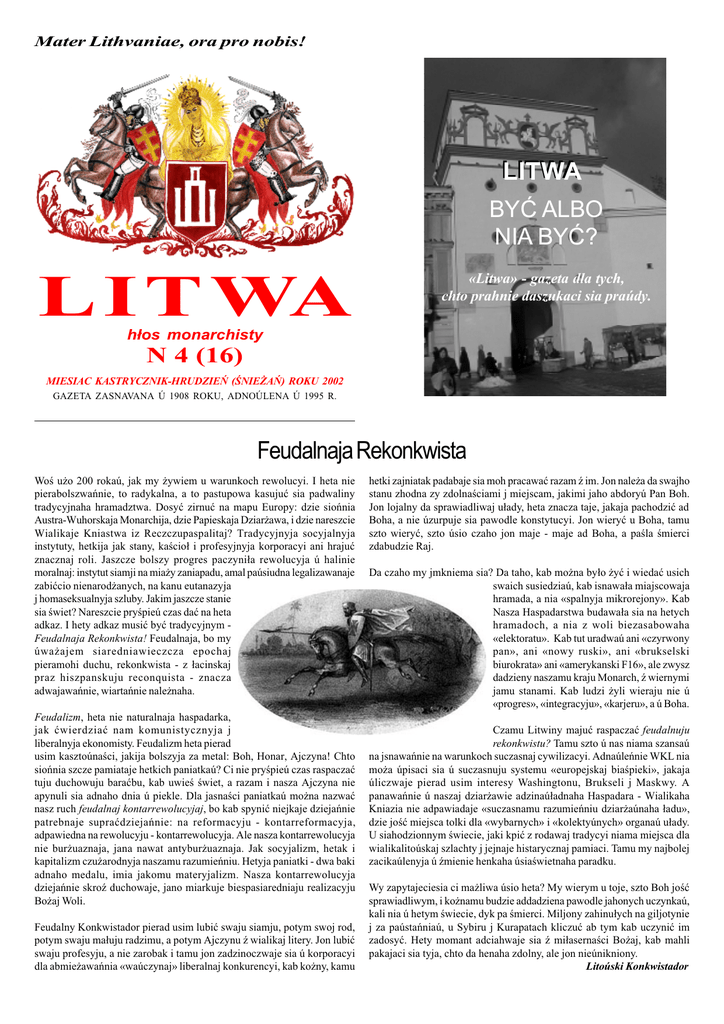 Mater Lithvaniae, ora pro nobis! LITWA BYÆ ALBO NIA BYÆ? L I T WA «Litwa» - gazeta dla tych, chto prahnie daszukaci sia praúdy. h³os monarchisty N 4 (16) MIESIAC KASTRYCZNIK-HRUDZIEÑ (NIE¯AÑ) ROKU 2002 GAZETA ZASNAVANA Ú 1908 ROKU, ADNOÚLENA Ú 1995 R. Feudalnaja Rekonkwista Wo u¿o 200 rokaú, jak my ¿ywiem u warunkoch rewolucyi. I heta nie pierabolszwañnie, to radykalna, a to pastupowa kasujuæ sia padwaliny tradycyjnaha hramadztwa. Dosyæ zirnuæ na mapu Europy: dzie sioñnia Austra-Wuhorskaja Monarchija, dzie Papieskaja Dziar¿awa, i dzie nareszcie Wialikaje Kniastwa iz Reczczupaspalitaj? Tradycyjnyja socyjalnyja instytuty, hetkija jak stany, kacio³ i profesyjnyja korporacyi ani hrajuæ znacznaj roli. Jaszcze bolszy progres paczyni³a rewolucyja ú halinie moralnaj: instytut siamji na mia¿y zaniapadu, amal paúsiudna legalizawanaje zabiæcio nienarod¿anych, na kanu eutanazyja j homaseksualnyja szluby. Jakim jaszcze stanie sia wiet? Nareszcie prypieú czas daæ na heta adkaz. I hety adkaz musiæ byæ tradycyjnym Feudalnaja Rekonkwista! Feudalnaja, bo my úwa¿ajem siaredniawieczcza epochaj pieramohi duchu, rekonkwista - z ³acinskaj praz hiszpanskuju reconquista - znacza adwajawañnie, wiartañnie nale¿naha. Feudalizm, heta nie naturalnaja haspadarka, jak æwierdziaæ nam komunistycznyja j liberalnyja ekonomisty. Feudalizm heta pierad usim kasztoúnaci, jakija bolszyja za metal: Boh, Honar, Ajczyna! Chto sioñnia szcze pamiataje hetkich paniatkaú? Ci nie prypieú czas raspaczaæ tuju duchowuju baraæbu, kab uwie wiet, a razam i nasza Ajczyna nie apynuli sia adnaho dnia ú piekle. Dla jasnaci paniatkaú mo¿na nazwaæ nasz ruch feudalnaj kontarrewolucyjaj, bo kab spyniæ niejkaje dziejañnie patrebnaje supraædziejañnie: na reformacyju - kontarreformacyja, adpawiedna na rewolucyju - kontarrewolucyja. Ale nasza kontarrewolucyja nie bur¿uaznaja, jana nawat antybur¿uaznaja. Jak socyjalizm, hetak i kapitalizm czu¿arodnyja naszamu razumieñniu. Hetyja paniatki - dwa baki adnaho medalu, imia jakomu materyjalizm. Nasza kontarrewolucyja dziejañnie skro duchowaje, jano miarkuje biespasiaredniaju realizacyju Bo¿aj Woli. Feudalny Konkwistador pierad usim lubiæ swaju siamju, potym swoj rod, potym swaju ma³uju radzimu, a potym Ajczynu wialikaj litery. Jon lubiæ swaju profesyju, a nie zarobak i tamu jon zadzinoczwaje sia ú korporacyi dla abmie¿awañnia «waúczynaj» liberalnaj konkurencyi, kab ko¿ny, kamu hetki zajniatak padabaje sia moh pracawaæ razam im. Jon nale¿a da swajho stanu zhodna zy zdolnaciami j miejscam, jakimi jaho abdoryú Pan Boh. Jon lojalny da sprawiadliwaj u³ady, heta znacza taje, jakaja pachodziæ ad Boha, a nie úzurpuje sia pawodle konstytucyi. Jon wieryæ u Boha, tamu szto wieryæ, szto úsio czaho jon maje - maje ad Boha, a pala mierci zdabudzie Raj. Da czaho my jmkniema sia? Da taho, kab mo¿na by³o ¿yæ i wiedaæ usich swaich susiedziaú, kab isnawa³a miajscowaja hramada, a nia «spalnyja mikrorejony». Kab Nasza Haspadarstwa budawa³a sia na hetych hramadoch, a nia z woli biezasabowaha «elektoratu». Kab tut uradwaú ani «czyrwony pan», ani «nowy ruski», ani «brukselski biurokrata» ani «amerykanski F16», ale zwysz dadzieny naszamu kraju Monarch, wiernymi jamu stanami. Kab ludzi ¿yli wieraju nie ú «progres», «integracyju», «karjeru», a ú Boha. Czamu Litwiny majuæ raspaczaæ feudalnuju rekonkwistu? Tamu szto ú nas niama szansaú na jsnawañnie na warunkoch suczasnaj cywilizacyi. Adnaúleñnie WKL nia mo¿a úpisaci sia ú suczasnuju systemu «europejskaj biapieki», jakaja úliczwaje pierad usim interesy Washingtonu, Brukseli j Maskwy. A panawañnie ú naszaj dziar¿awie adzinaú³adnaha Haspadara - Wialikaha Kniazia nie adpawiadaje «suczasnamu razumieñniu dziar¿aúnaha ³adu», dzie joæ miejsca tolki dla «wybarnych» i «kolektyúnych» organaú u³ady. U siahodzionnym wiecie, jaki kpiæ z rodawaj tradycyi niama miejsca dla wialikalitoúskaj szlachty j jejnaje histarycznaj pamiaci. Tamu my najbolej zacikaúlenyja ú mienie henkaha úsiawietnaha paradku. Wy zapytajeciesia ci ma¿liwa úsio heta? My wierym u toje, szto Boh joæ sprawiadliwym, i ko¿namu budzie addadziena pawodle jahonych uczynkaú, kali nia ú hetym wiecie, dyk pa mierci. Miljony zahinu³ych na giljotynie j za paústañniaú, u Sybiru j Kurapatach kliczuæ ab tym kab uczyniæ im zadosyæ. Hety momant adciahwaje sia mi³asernaci Bo¿aj, kab mahli pakajaci sia tyja, chto da henaha zdolny, ale jon nieúnikniony. Litoúski Konkwistador 2 LITWA HISTORYJA Tematam hetaha materyja³u joæ jakim czynam wiera katolickaja úp³ywa³a na dziejañni insurgentaú 1863 r., a taksama jakim czynam adno najbolsz katolickaje i monarchicznaje haspadarstwa tahaczasnaj Europy - AustraWuhorszczyna stawi³a sia da paústañnia. Dadzienuju temu wielmi gruntoúna raspracawaú polski daledczyk Edward Walewander u swajoj kni¿cy «Die österreichische Presse und die polnische Januaraufstand» (Austryjackaja presa i polskaje studzieñskaje paústañnie), szto by³a wydadziena paniamiecku ú Frankfurcie-nad-Majnam u 1991 r.. Gruntujuczy sia na pracy p.E.Walewandera, a taksama na inszych apracoúkach, my sprabujem praanalizawaæ, jakim czynam praktykawañnie katolickaj wiery paúp³ywa³a na motywacyju insurgentaú, a taksama jakim czynam prajawi³a sia mi¿narodawaja katolickaja salidarnaæ z polskim i litoúskim1 narodami. Boh, Honar, Ajczyna... Historyczny kontekst N4 (16) 2003 nie wy³uczajuczy stul i hreka-katolikoú. Adna z gazetaú wiedcza ab tym, szto carski úrad «iz padstupnaciu, gwa³tam i dapamohaj kazackich knutoú dy jaszcze niekatorych niawiernych biskupaú» addzialili hreka-katolickuju carkwu ad Rymu i da³uczyli da prawas³aúja. «Das Vaterland9» z radaciu pawiedamla³a, szto szmat hreka-katolikaú, jakich prymusam da³uczyli da prawas³aúnaj carkwy, znoú sta³a patrabujuæ byæ u adzinstwie iz wiatym Prasto³am. Heta datyczyæ nia tolki Polskaha Karaleúst