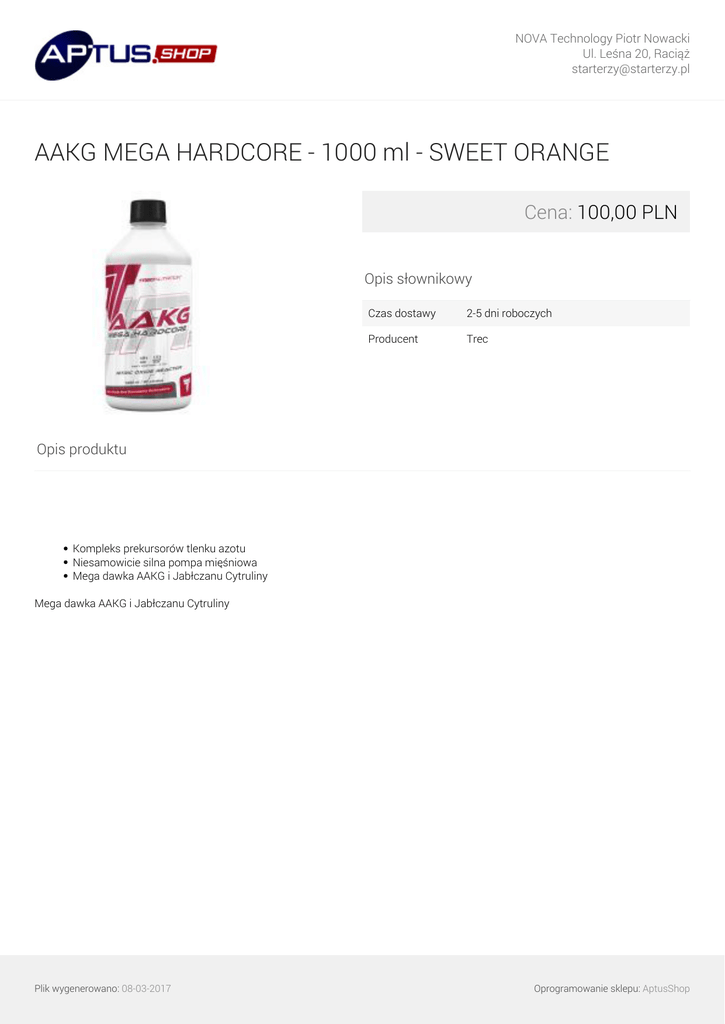 NOVA Technology Piotr Nowacki Ul. Leśna 20, Raciąż [email protected] AAKG MEGA HARDCORE - 1000 ml - SWEET ORANGE Cena: 100,00 PLN Opis słownikowy Czas dostawy 2-5 dni roboczych Producent Trec Opis produktu Kompleks prekursorów tlenku azotu Niesamowicie silna pompa mięśniowa Mega dawka AAKG i Jabłczanu Cytruliny Mega dawka AAKG i Jabłczanu Cytruliny Plik wygenerowano: 08-03-2017 Powered by TCPDF (www.tcpdf.org) Oprogramowanie sklepu: AptusShop