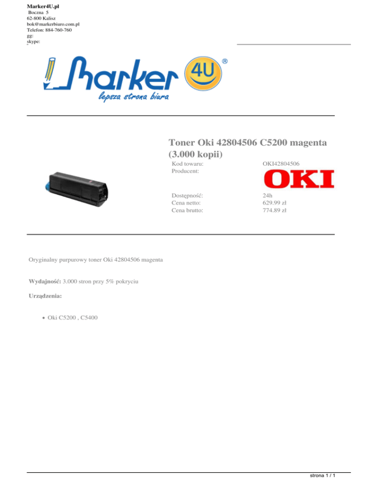 Marker4U.pl Boczna 5 62-800 Kalisz [email protected] Telefon: 884-760-760 gg: skype: Toner Oki 42804506 C5200 magenta (3.000 kopii) Kod towaru: Producent: OKI42804506 Dostępność: Cena netto: Cena brutto: 24h 629.99 zł 774.89 zł Oryginalny purpurowy toner Oki 42804506 magenta Wydajność: 3.000 stron przy 5% pokryciu Urządzenia: Oki C5200 , C5400 strona 1 / 1 Powered by TCPDF (www.tcpdf.org)