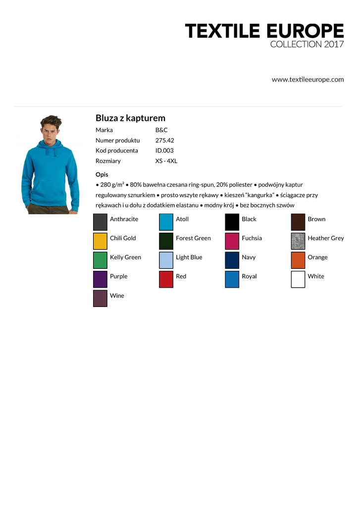 Bluza z kapturem Marka B&C Numer produktu 275.42 Kod producenta ID.003 Rozmiary XS - 4XL Opis • 280 g/m² • 80% bawełna czesana ring-spun, 20% poliester • podwójny kaptur regulowany sznurkiem • prosto wszyte rękawy • kieszeń “kangurka” • ściągacze przy rękawach i u dołu z dodatkiem elastanu • modny krój • bez bocznych szwów Anthracite Atoll Black Brown Chili Gold Forest Green Fuchsia Heather Grey Kelly Green Light Blue Navy Orange Purple Red Royal White Wine