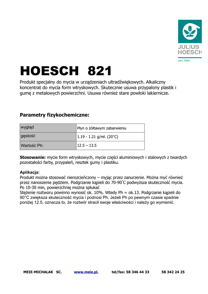 HOESCH 821 Produkt specjalny do mycia w urządzeniach ultradźwiękowych. Alkaliczny koncentrat do mycia form wtryskowych. Skutecznie usuwa przypalony plastik i gumę z metalowych powierzchni. Usuwa również stare powłoki lakiernicze. Parametry fizykochemiczne: wygląd Płyn o żółtawym zabarwieniu gęstość 1.19 - 1.21 g/ml. (20°C) Wartość Ph: 12.5 – 13.5 Stosowanie: mycie form wtryskowych, mycie części aluminiowych i stalowych z twardych pozostałości farby, przypaleń, resztek gumy i plastiku. Aplikacja: Produkt można stosować nierozcieńczony – myjąc przez zanurzenie. Można myć również przez nanoszenie pędzlem. Podgrzanie kąpieli do 70-90°C podwyższa skuteczność mycia. Po 10-30 min, powierzchnię można spłukać Stężenie roztworu powinno wynosić ok. 10%. Wtedy Ph = ok.13. Podgrzanie kąpieli do 90°C zwiększa skuteczność mycia i podnosi Ph. Jeżeli Ph po pewnym czasie spadnie poniżej 12.5, oznacza to, że roztwór stracił swoje właściwości i należy go wymienić. MEIE-MICHALAK SC. www.meie.pl, tel/fax: 58 346 44 33 58 342 24 25 Sposoby utylizacji: Możliwe są dwa sposoby utylizacji pły 1. Neutralizacja – zanieczyszczony roztwór HOESCHA 821 zneutralizować kwasem, aż się osiągnie odczyn Ph ok.7. Po odseparowaniu zanieczyszczeń i osadów, płyn oddać do punktu zbiórki odpadów chemicznych. 2. Koncentracja termiczna – po odparowaniu HOESCHA 821 pozostają same zanieczyszczenia, które należy oddać do punktu zbiórki odpadów chemicznych. Z powyższych metod należy wybrać najbardziej ekonomiczną, biorąc pod uwagę rodzaj zanieczyszczeń. Informacje na temat zagrożeń i postępowania w przypadku zagrożeń zawiera Karta Charakterystyki Substancji Niebezpiecznej. opakowania: 10l, 20ltr, beczka 200kg. MEIE-MICHALAK SC. www.meie.pl, tel/fax: 58 346 44 33 58 342 24 25