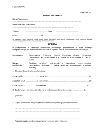 Aktualne formularze: FORMULARZ OFERTOWY (Załącznik nr 1 do