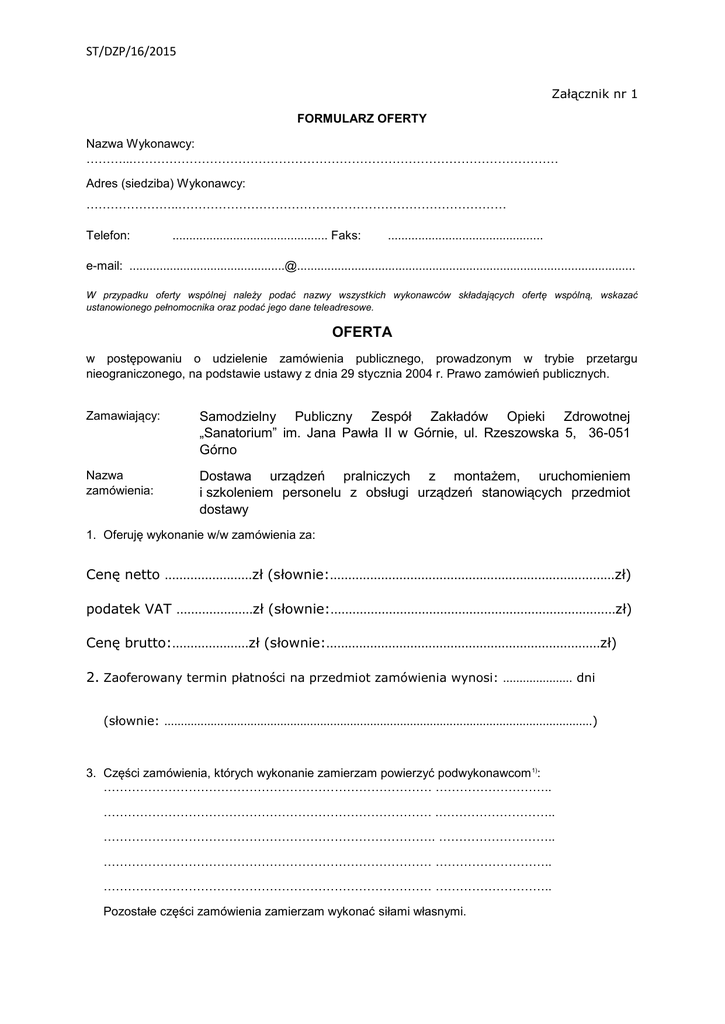 ST/DZP/16/2015 Załącznik nr 1 FORMULARZ OFERTY Nazwa Wykonawcy: ………...…………………………………………………………………………………………… Adres (siedziba) Wykonawcy: …………………..……………………………………………………………………… Telefon: .............................................. Faks: .............................................. e-mail: ..............................................@.................................................................................................... W przypadku oferty wspólnej należy podać nazwy wszystkich wykonawców składających ofertę wspólną, wskazać ustanowionego pełnomocnika oraz podać jego dane teleadresowe. OFERTA w postępowaniu o udzielenie zamówienia publicznego, prowadzonym w trybie przetargu nieograniczonego, na podstawie ustawy z dnia 29 stycznia 2004 r. Prawo zamówień publicznych. Zamawiający: Samodzielny Publiczny Zespół Zakładów Opieki Zdrowotnej „Sanatorium” im. Jana Pawła II w Górnie, ul. Rzeszowska 5, 36-051 Górno Nazwa zamówienia: Dostawa urządzeń pralniczych z montażem, uruchomieniem i szkoleniem personelu z obsługi urządzeń stanowiących przedmiot dostawy 1. Oferuję wykonanie w/w zamówienia za: Cenę netto ……………………zł (słownie:……………………………………………………………………zł) podatek VAT …………………zł (słownie:……………………………………………………………………zł) Cenę brutto:…………………zł (słownie:…………………………………………………………………zł) 2. Zaoferowany termin płatności na przedmiot zamówienia wynosi: ………………… dni (słownie: …………………………………………………………………………………………………………………) 3. Części zamówienia, których wykonanie zamierzam powierzyć podwykonawcom 1): ……………………………………………………………………… ……………………….. ……………………………………………………………………… .……………………….. ………………………………………………………………………. ……………………….. ……………………………………………………………………… ……………………….. ……………………………………………………………………… ……………………….. Pozostałe części zamówienia zamierzam wykonać siłami własnymi. ST/DZP/16/2015 4. Oświadczam, że zapoznałem się ze specyfikacją istotnych warunków zamówienia i nie wnoszę do niej zastrzeżeń oraz przyjmuję warunki w niej zawarte. 5. Oświadczam, że uważam się związany niniejszą ofertą przez okres wskazany w specyfikacji istotnych warunków zamówienia tj. 30 dni licząc od upływu terminu składania ofert. 6. Oświadczam, że cena podana w pkt. 1 zawiera wszystkie koszty niezbędne do prawidłowego i terminowego wykonania przedmiotu zamówienia. 7. Zamówienie wykonam w terminie do 23 grudnia 2015 r. 8. Zobowiązuję się w przypadku wyboru mojej oferty do zawarcia umowy w miejscu i terminie wyznaczonym przez Zamawiającego. ............................................................... (podpis Wykonawcy) 1) Wypełnić jeżeli dotyczy. ST/DZP/16/2015 Załącznik nr 3 FORMULARZ WYMAGAŃ TECHNICZNYCH Wymagane parametry techniczne …………………………………….. (Pieczęć nazwa Wykonawcy) Lp. Wymagane parametry Pralnico-wirówka z barierą higieniczną - szt. 1 Producent: …………………………………………………………………… Typ/model: …………………………………………………………………… 1. Pralnico-wirówka z barierą higieniczną, przelotowa, wolnostojąca, drzwi wsadowe po przeciwnych stronach maszyny 2. Pojemność bębna min. 175 l 3. Obudowa, bęben zewnętrzny i wewnętrzny wykonany ze stali nierdzewnej 4. Automatyczne pozycjonowanie drzwi 5. Załadunek-minimum 18 kg suchej masy wsadu 6. Podgrzew elektryczny – moc zainstalowanego podgrzewu elektrycznego 18-24 kW 7. Maszyna wysokoobrotowa - minimalna prędkość wirowania 935 obr/min 8. Średnica bębna min. 730 mm 9. Możliwość podpięcia maszyny do istniejącego systemu nadzoru procesów prania i maszyn Trace tech 10. Współczynnik odwirowania G-minimum 365 11. Programator z wyświetlaczem graficznym, obsługa w języku polskim 12. Możliwość podłączenia automatycznego systemu dozowania środków piorących 13. Mikroprocesor w pełni programowalny min 90 programów z możliwością manualnej automatyki wagowej Spełnia TAK/NIE Oferowany parametr. potwierdzić, lub podać zakresy/opisać ST/DZP/16/2015 14. Gwarancja i serwis. Okres gwarancji 24 miesiące, w tym okresie należy zapewnić bezpłatne przeglądy okresowe i konserwację, w odstępach jakie zaleca producent. Czas reakcji serwisu 48 godzin. 15. W cenie należy uwzględnić koszt dostawy, montażu, uruchomienia oraz przeszkolenie personelu z zakresu obsługi urządzenia. Suszarka – szt. 1 Producent: …………………………………………………………………… Typ/model: …………………………………………………………………… 1. 2. 3. 4. 5. 6. Suszarka o podgrzewie gazowym Przepływ powietrza radialny Pojemność bębna min 530 l Średnica bębna min 900 mm Bęben ze stali nierdzewnej Rewers bębna 7. 8. Moc podgrzewu gazowego min. 32 kW Programator elektroniczny min 19 programów, regulacja temperatury co jeden stopień Celsjusza, pozwalający na bezpośredni odczyt błędów maszyny w języku polskim, maszyna musi mieć możliwość jednego programu z ręcznymi nastawami Szerokość maszyny nie większa niż 965 mm 9. 10. 11. Gwarancja i serwis. Okres gwarancji 24 miesięcy, w tym okresie należy zapewnić bezpłatne 